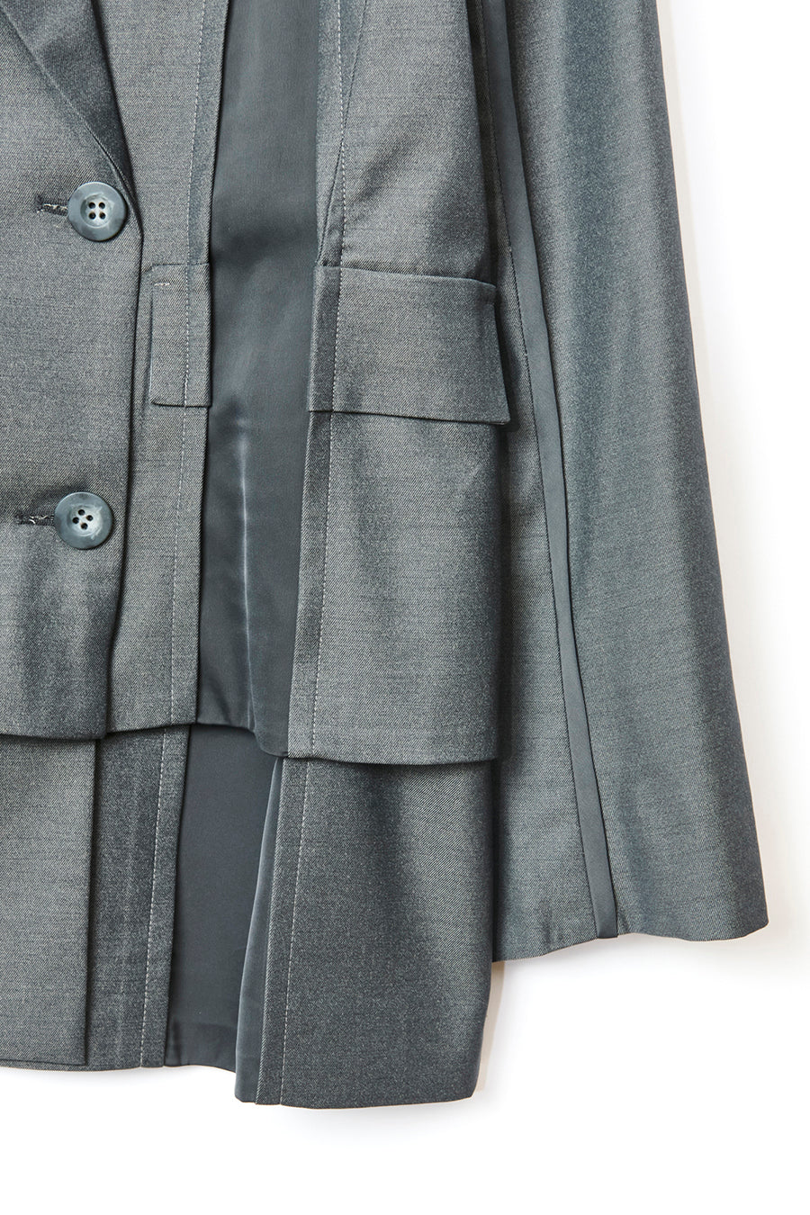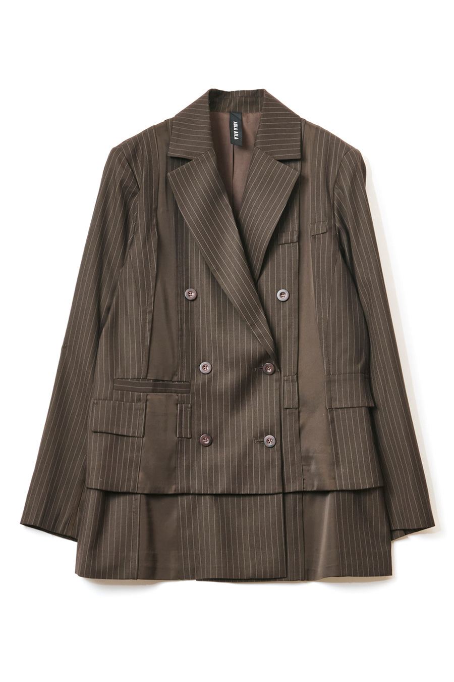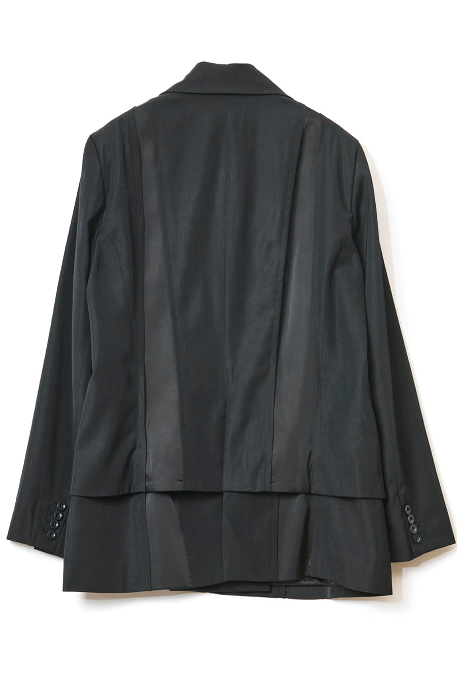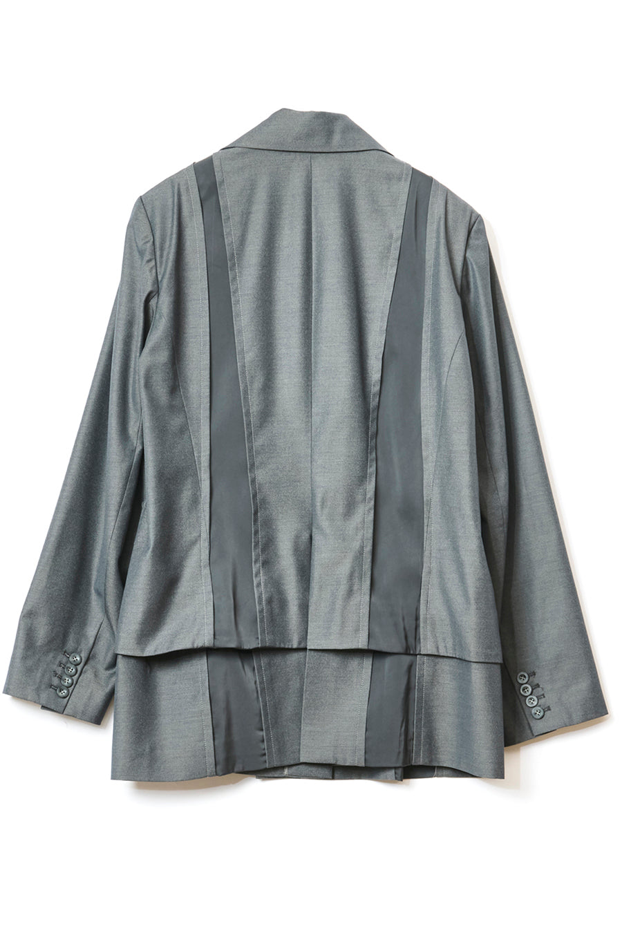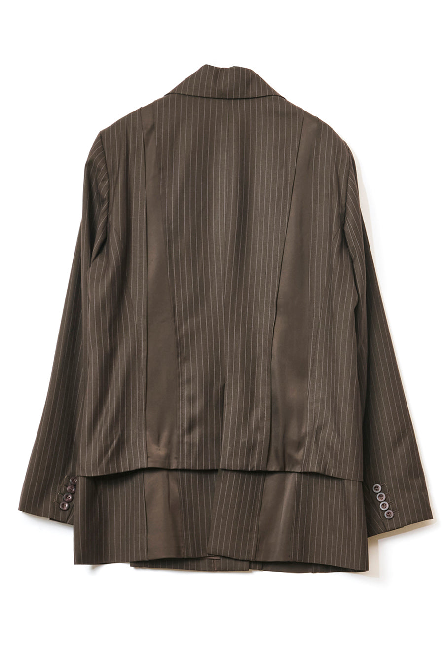 テーラードジャケットをリメイクしたかのような、マットサテンの切り替えデザインがポイントのジャケット。大きいけどルーズすぎない、抜け感のあるサイジングがこなれた印象に。レイヤードデザインの裾パーツはボタンで取り外しができるので、身長や合わせるボトムにベストなバランスを提案。着丈は2WAYで楽しめ、左右どちらかを外せば、アシンメトリーデザインにも。同素材でスカートの展開もあり、セットアップでの着用もおすすめ。グレーとブラックは無地。ブラウンはヴィンテージライクなピンストライプを使用。裏地付き。