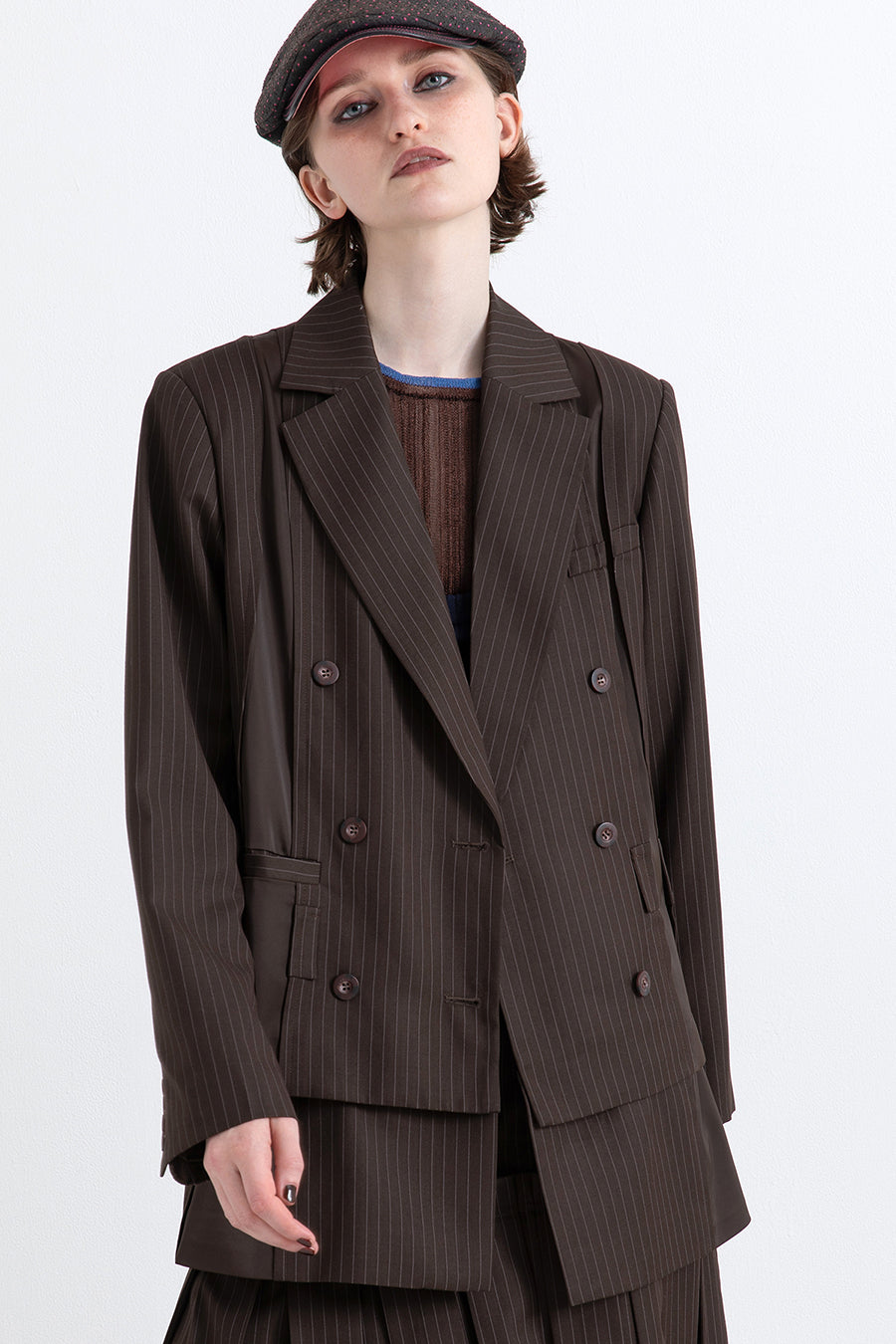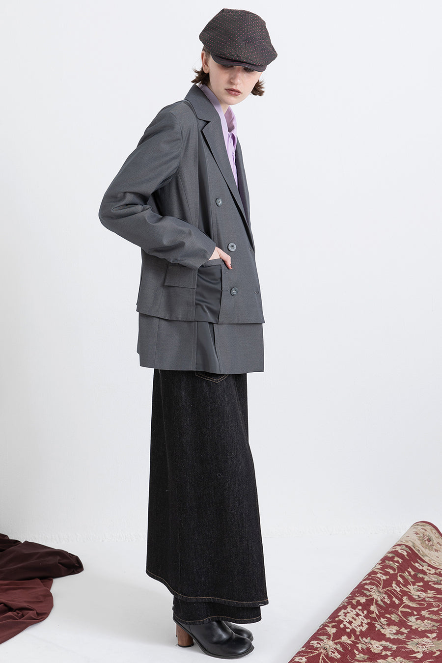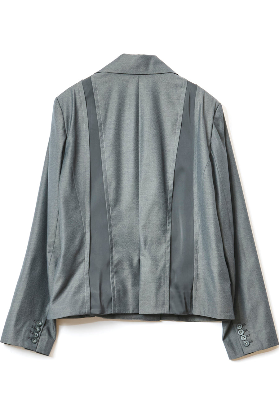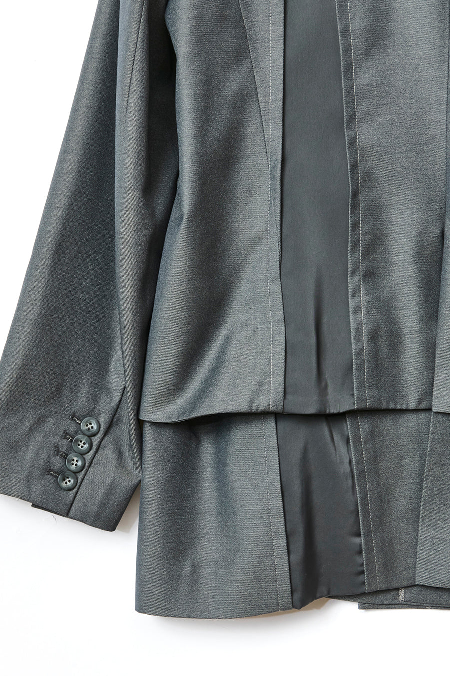 テーラードジャケットをリメイクしたかのような、マットサテンの切り替えデザインがポイントのジャケット。大きいけどルーズすぎない、抜け感のあるサイジングがこなれた印象に。レイヤードデザインの裾パーツはボタンで取り外しができるので、身長や合わせるボトムにベストなバランスを提案。着丈は2WAYで楽しめ、左右どちらかを外せば、アシンメトリーデザインにも。同素材でスカートの展開もあり、セットアップでの着用もおすすめ。グレーとブラックは無地。ブラウンはヴィンテージライクなピンストライプを使用。裏地付き。