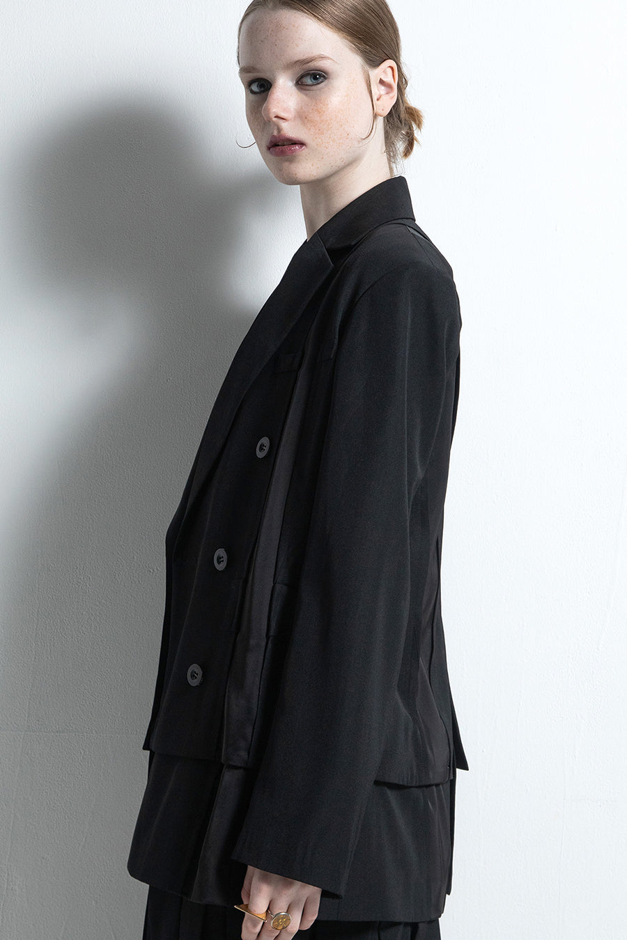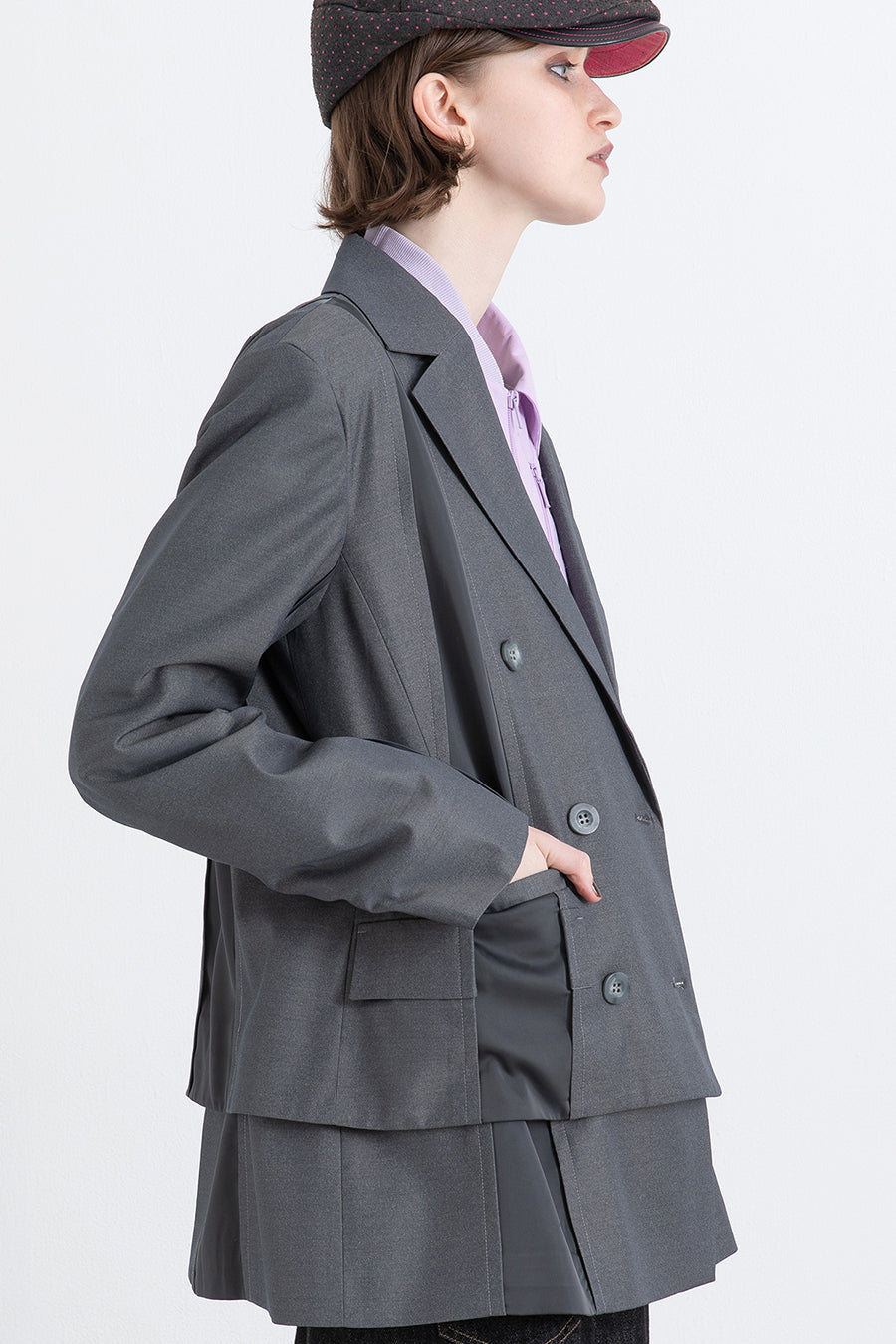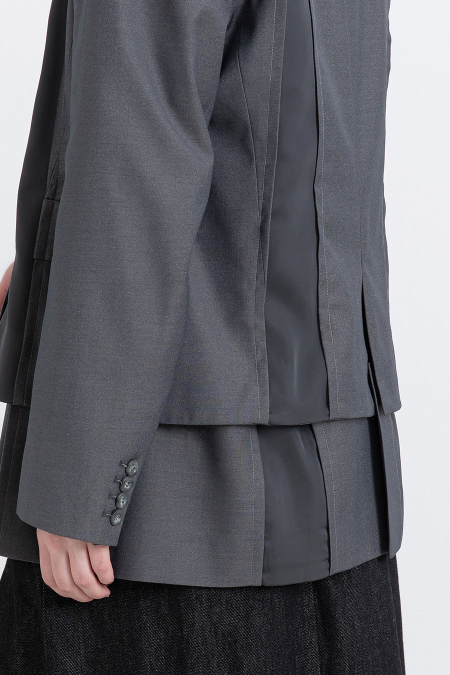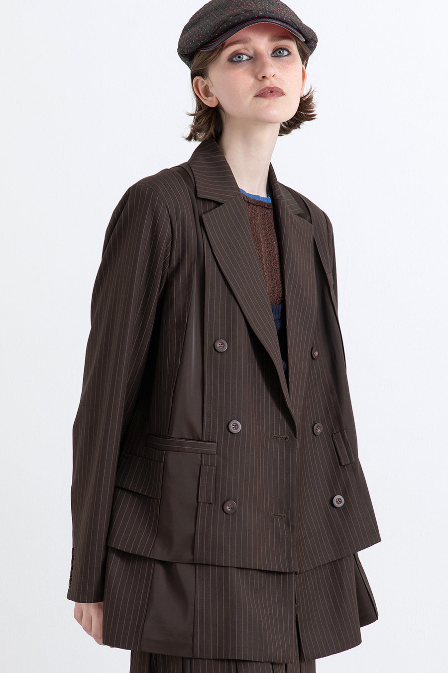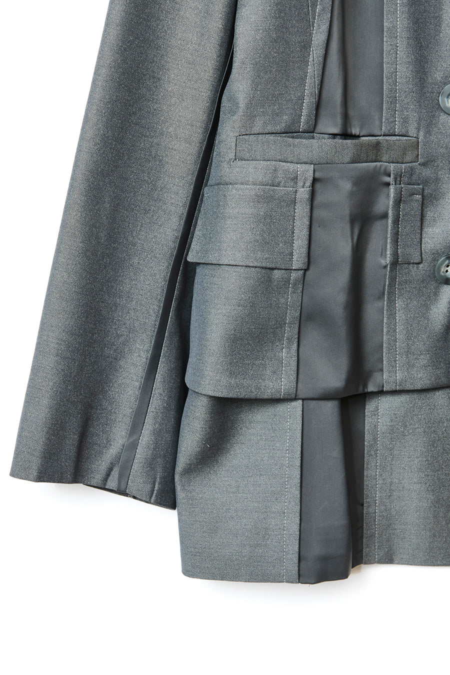 テーラードジャケットをリメイクしたかのような、マットサテンの切り替えデザインがポイントのジャケット。大きいけどルーズすぎない、抜け感のあるサイジングがこなれた印象に。レイヤードデザインの裾パーツはボタンで取り外しができるので、身長や合わせるボトムにベストなバランスを提案。着丈は2WAYで楽しめ、左右どちらかを外せば、アシンメトリーデザインにも。同素材でスカートの展開もあり、セットアップでの着用もおすすめ。グレーとブラックは無地。ブラウンはヴィンテージライクなピンストライプを使用。裏地付き。