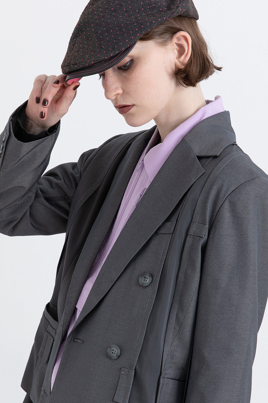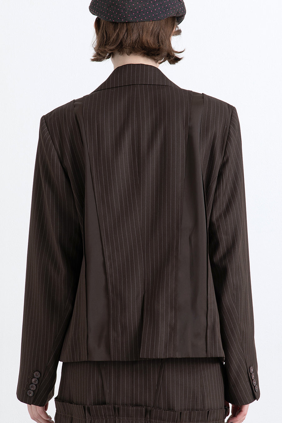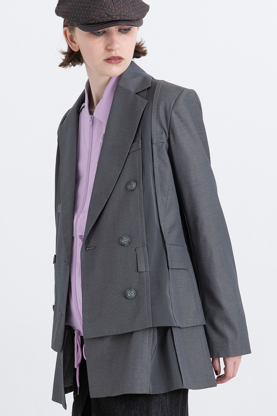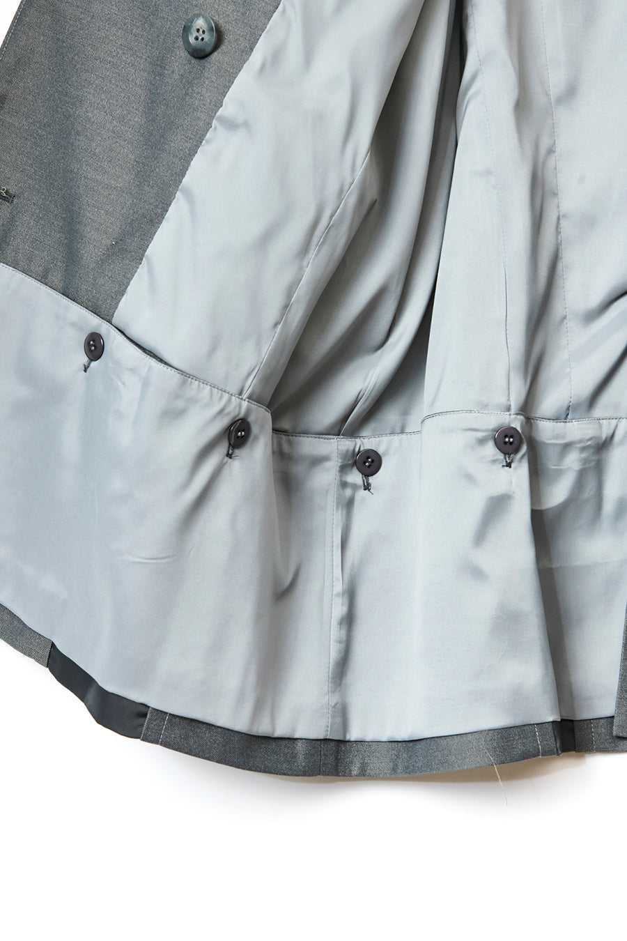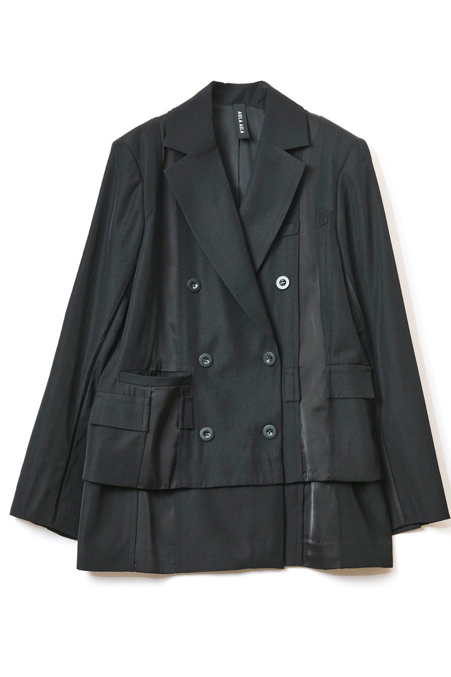 テーラードジャケットをリメイクしたかのような、マットサテンの切り替えデザインがポイントのジャケット。大きいけどルーズすぎない、抜け感のあるサイジングがこなれた印象に。レイヤードデザインの裾パーツはボタンで取り外しができるので、身長や合わせるボトムにベストなバランスを提案。着丈は2WAYで楽しめ、左右どちらかを外せば、アシンメトリーデザインにも。同素材でスカートの展開もあり、セットアップでの着用もおすすめ。グレーとブラックは無地。ブラウンはヴィンテージライクなピンストライプを使用。裏地付き。