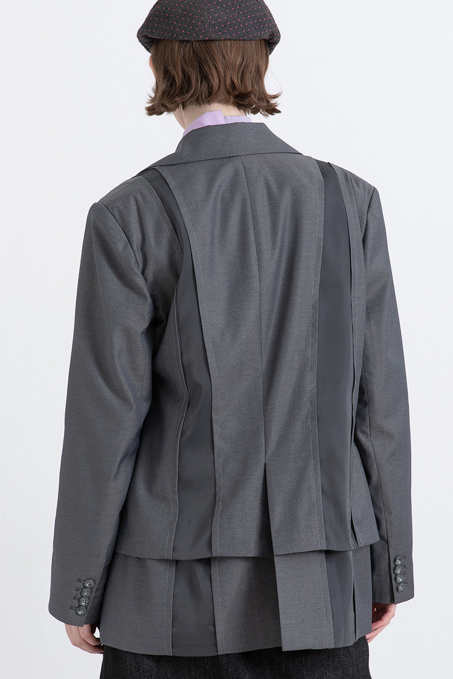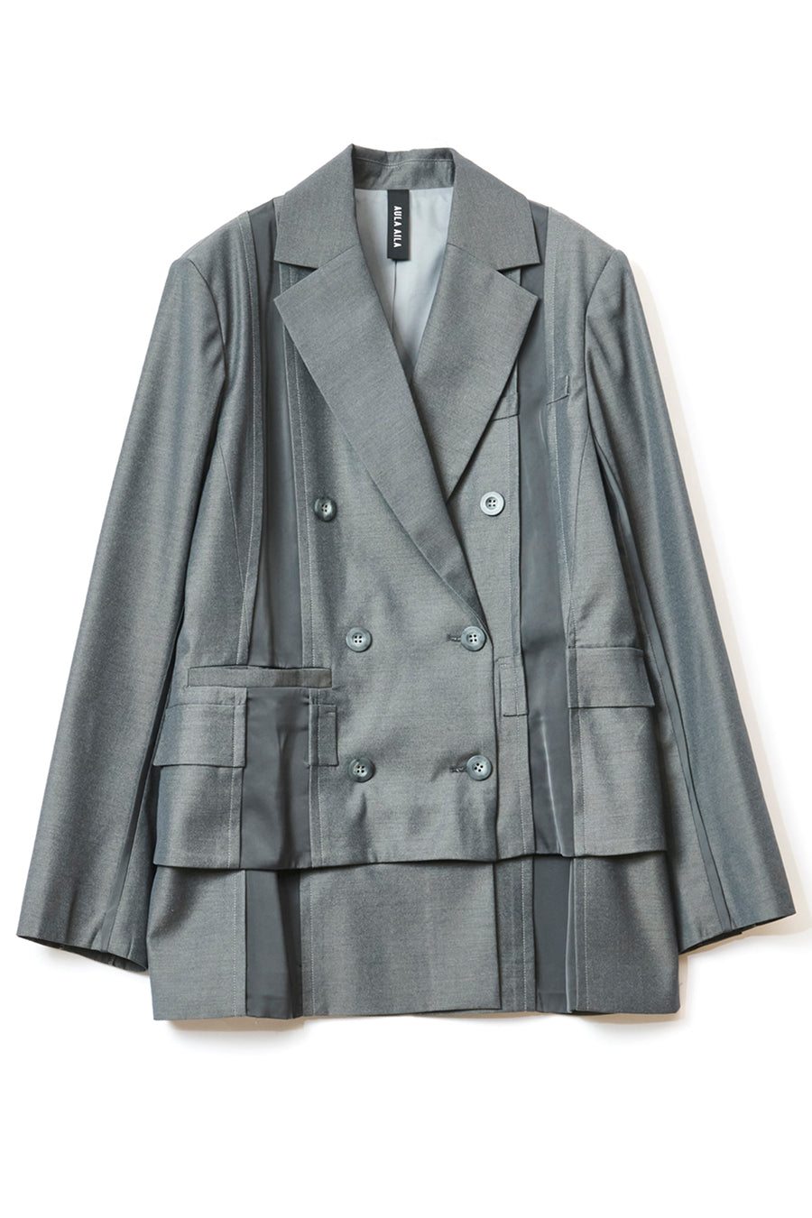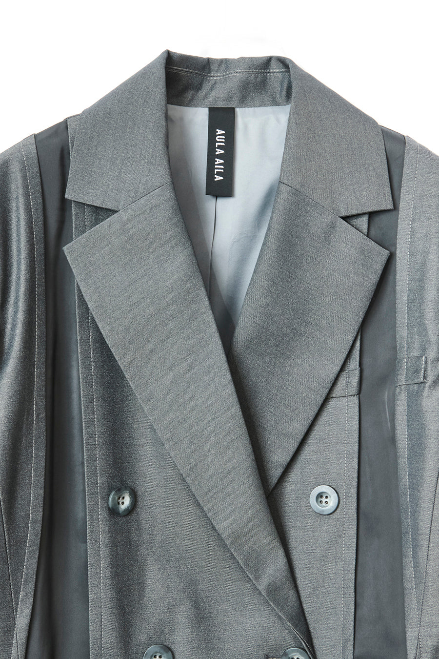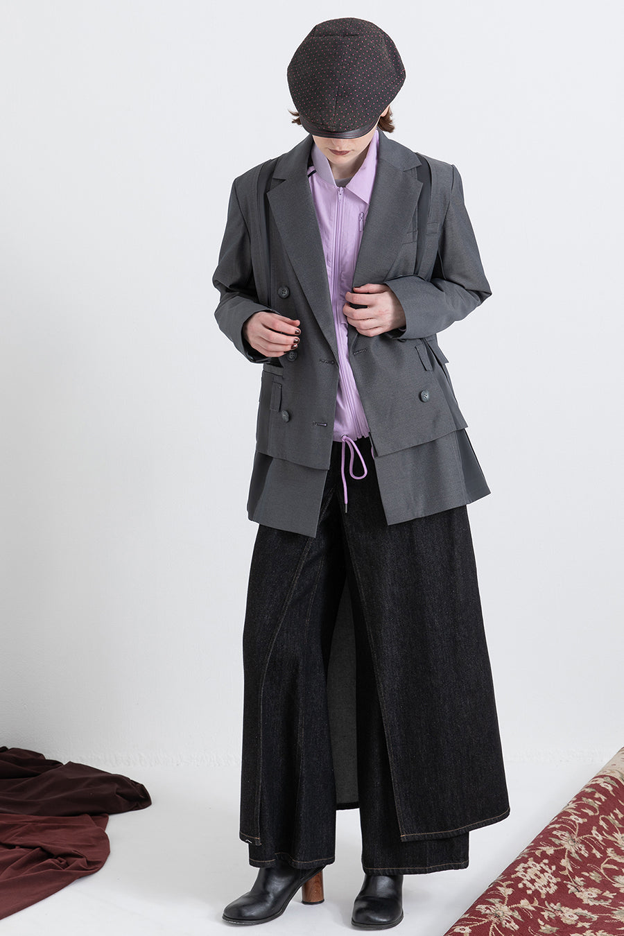 テーラードジャケットをリメイクしたかのような、マットサテンの切り替えデザインがポイントのジャケット。大きいけどルーズすぎない、抜け感のあるサイジングがこなれた印象に。レイヤードデザインの裾パーツはボタンで取り外しができるので、身長や合わせるボトムにベストなバランスを提案。着丈は2WAYで楽しめ、左右どちらかを外せば、アシンメトリーデザインにも。同素材でスカートの展開もあり、セットアップでの着用もおすすめ。グレーとブラックは無地。ブラウンはヴィンテージライクなピンストライプを使用。裏地付き。