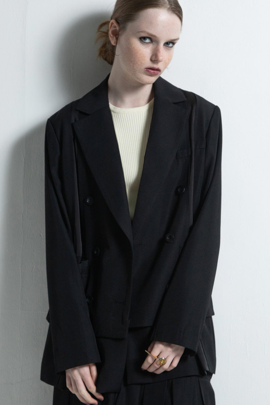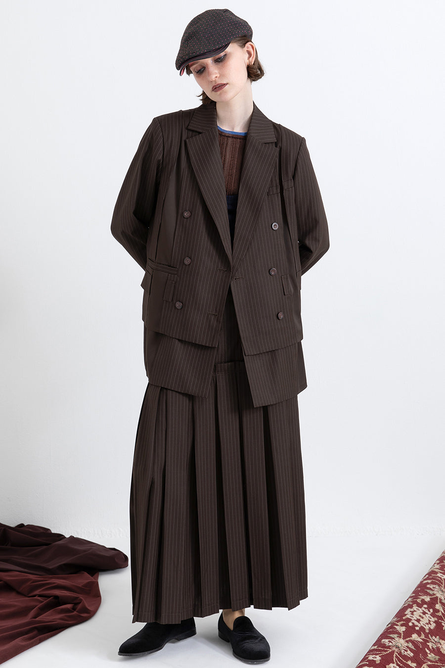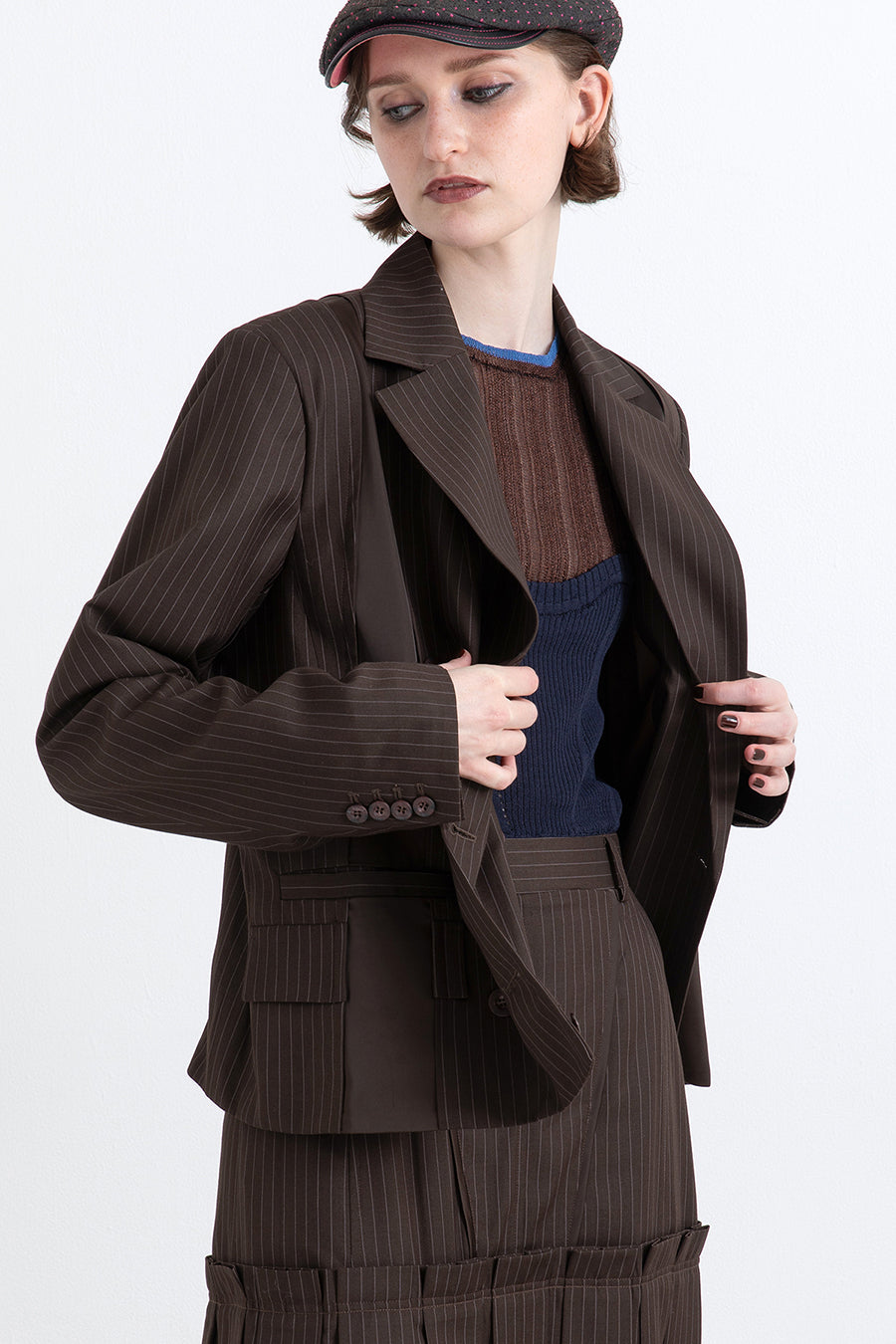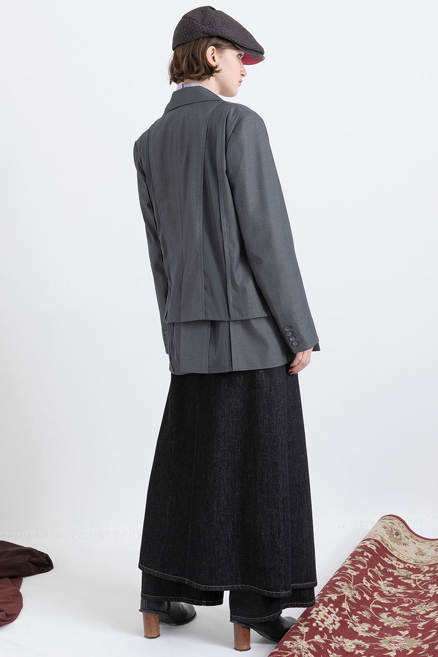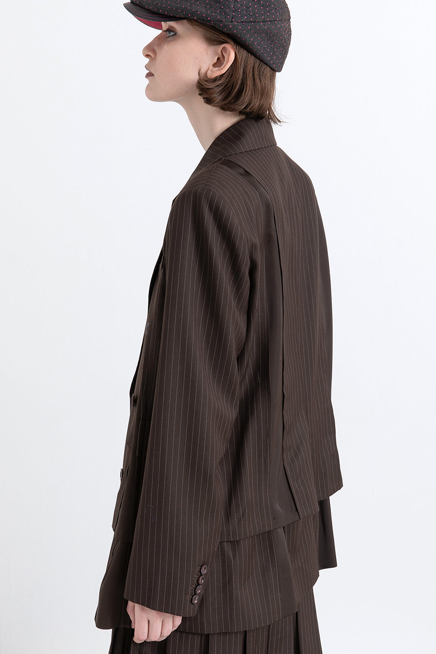 テーラードジャケットをリメイクしたかのような、マットサテンの切り替えデザインがポイントのジャケット。大きいけどルーズすぎない、抜け感のあるサイジングがこなれた印象に。レイヤードデザインの裾パーツはボタンで取り外しができるので、身長や合わせるボトムにベストなバランスを提案。着丈は2WAYで楽しめ、左右どちらかを外せば、アシンメトリーデザインにも。同素材でスカートの展開もあり、セットアップでの着用もおすすめ。グレーとブラックは無地。ブラウンはヴィンテージライクなピンストライプを使用。裏地付き。