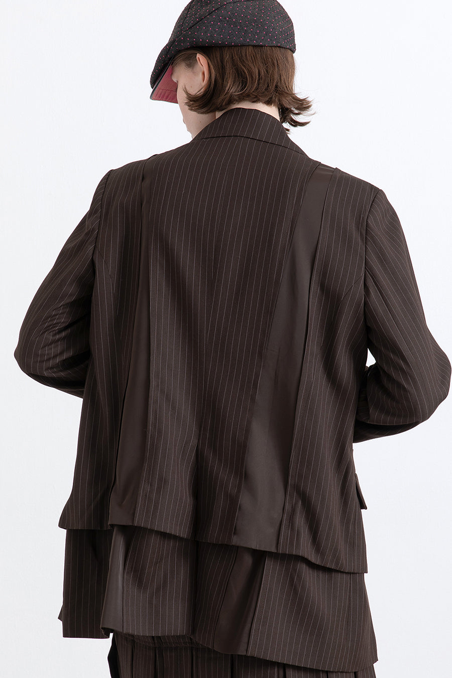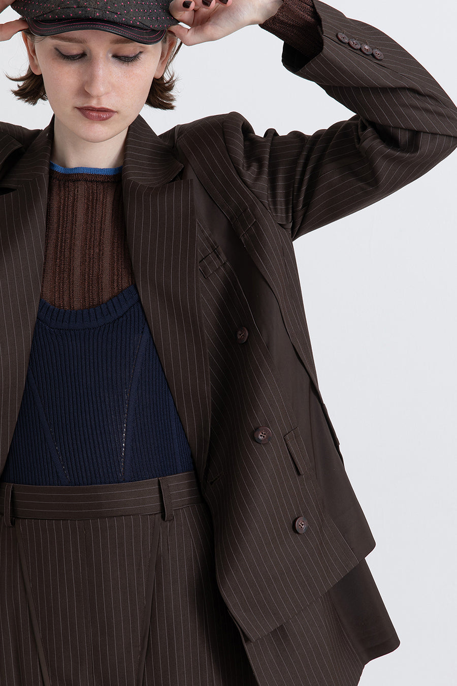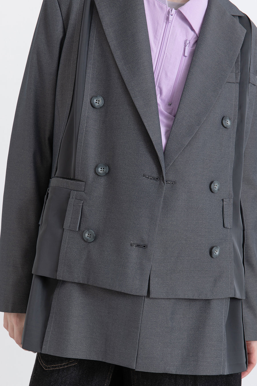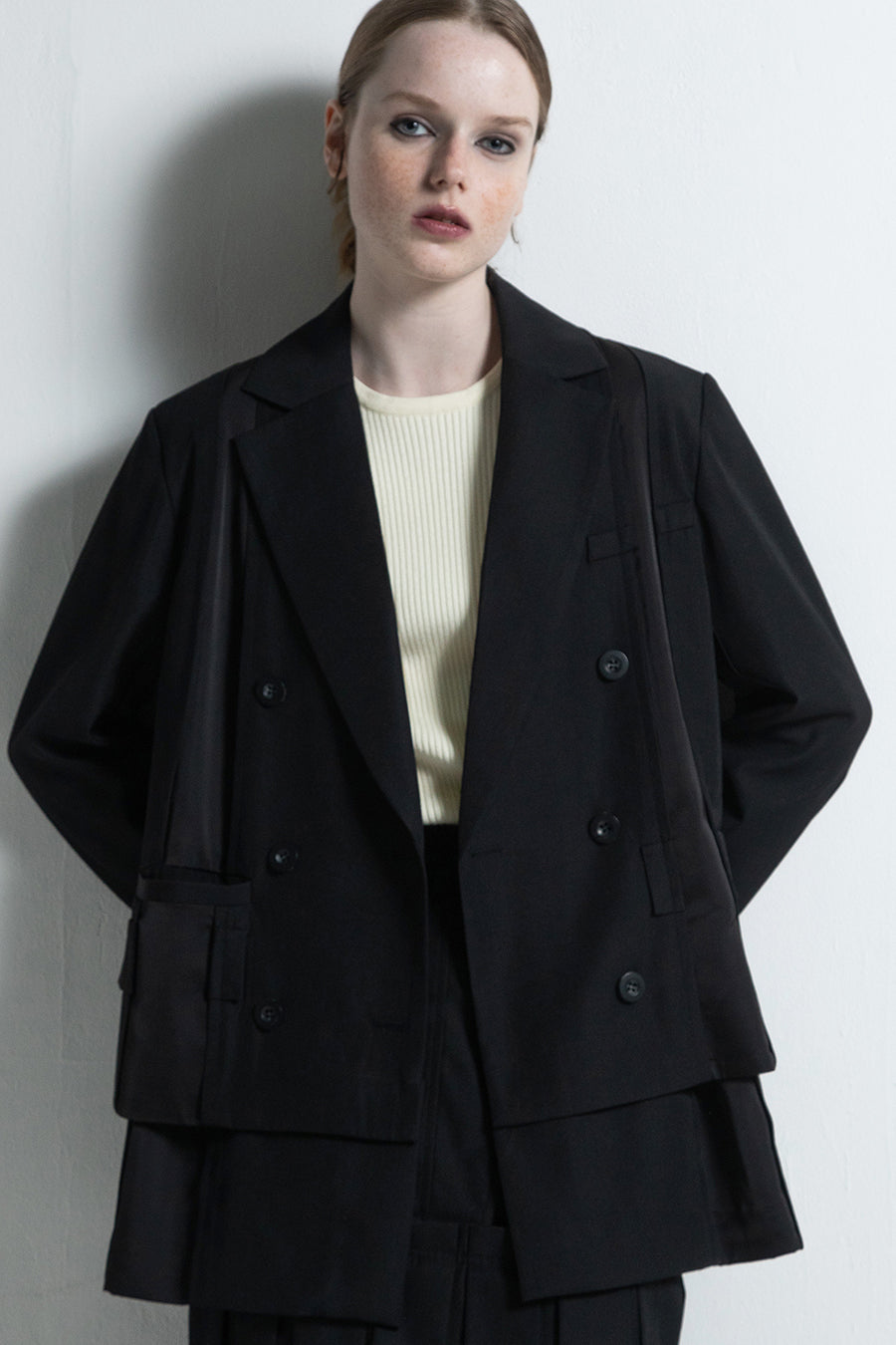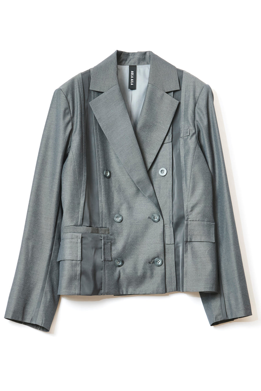 テーラードジャケットをリメイクしたかのような、マットサテンの切り替えデザインがポイントのジャケット。大きいけどルーズすぎない、抜け感のあるサイジングがこなれた印象に。レイヤードデザインの裾パーツはボタンで取り外しができるので、身長や合わせるボトムにベストなバランスを提案。着丈は2WAYで楽しめ、左右どちらかを外せば、アシンメトリーデザインにも。同素材でスカートの展開もあり、セットアップでの着用もおすすめ。グレーとブラックは無地。ブラウンはヴィンテージライクなピンストライプを使用。裏地付き。