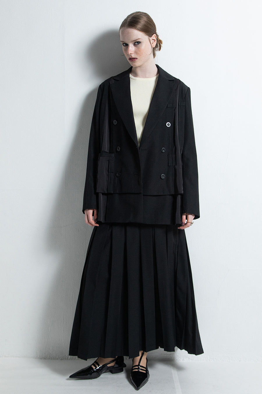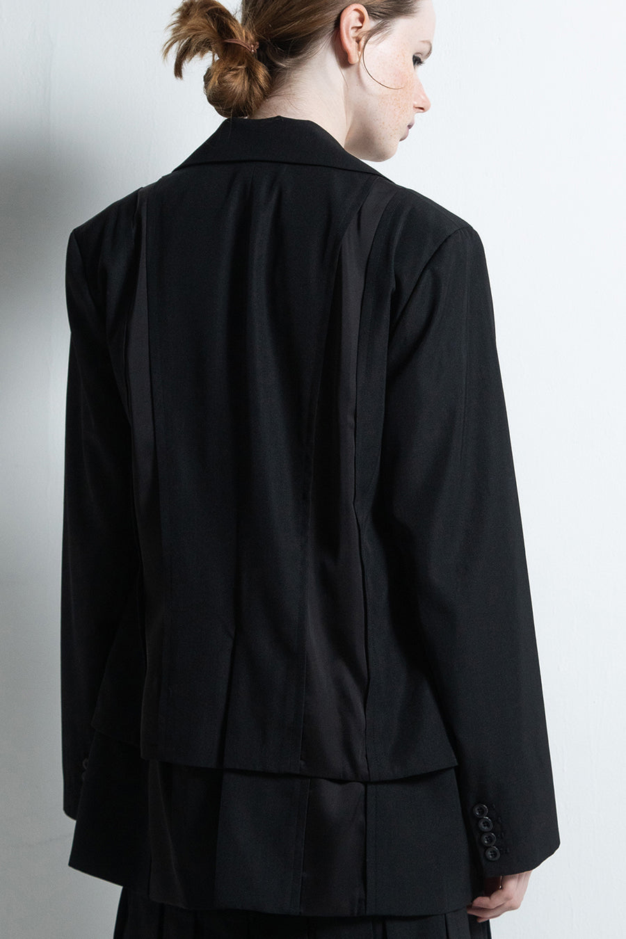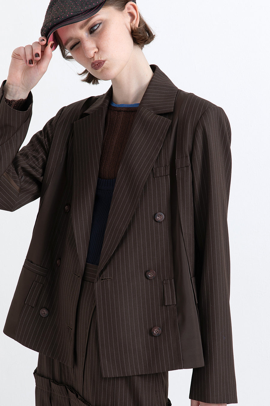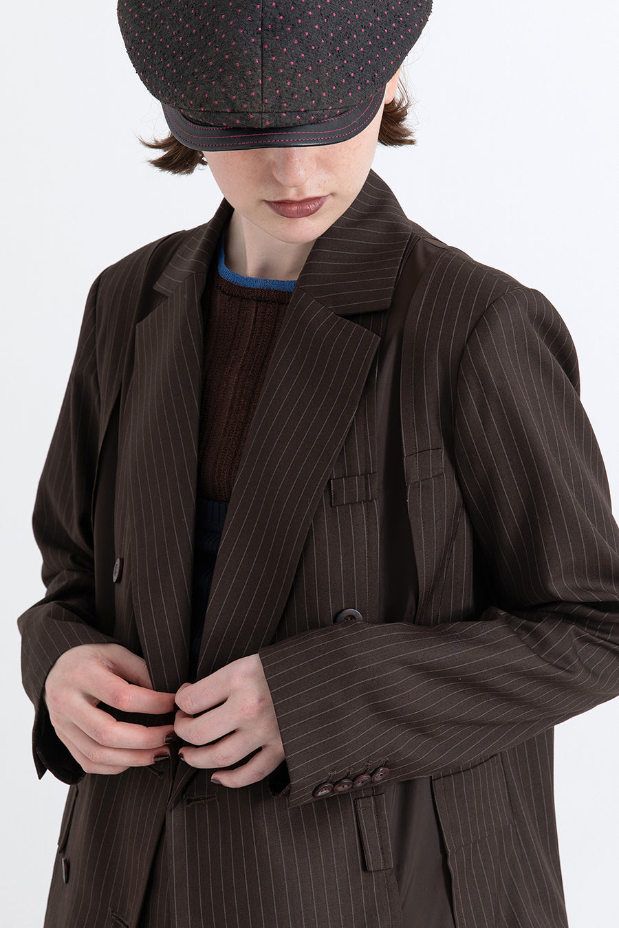 テーラードジャケットをリメイクしたかのような、マットサテンの切り替えデザインがポイントのジャケット。大きいけどルーズすぎない、抜け感のあるサイジングがこなれた印象に。レイヤードデザインの裾パーツはボタンで取り外しができるので、身長や合わせるボトムにベストなバランスを提案。着丈は2WAYで楽しめ、左右どちらかを外せば、アシンメトリーデザインにも。同素材でスカートの展開もあり、セットアップでの着用もおすすめ。グレーとブラックは無地。ブラウンはヴィンテージライクなピンストライプを使用。裏地付き。