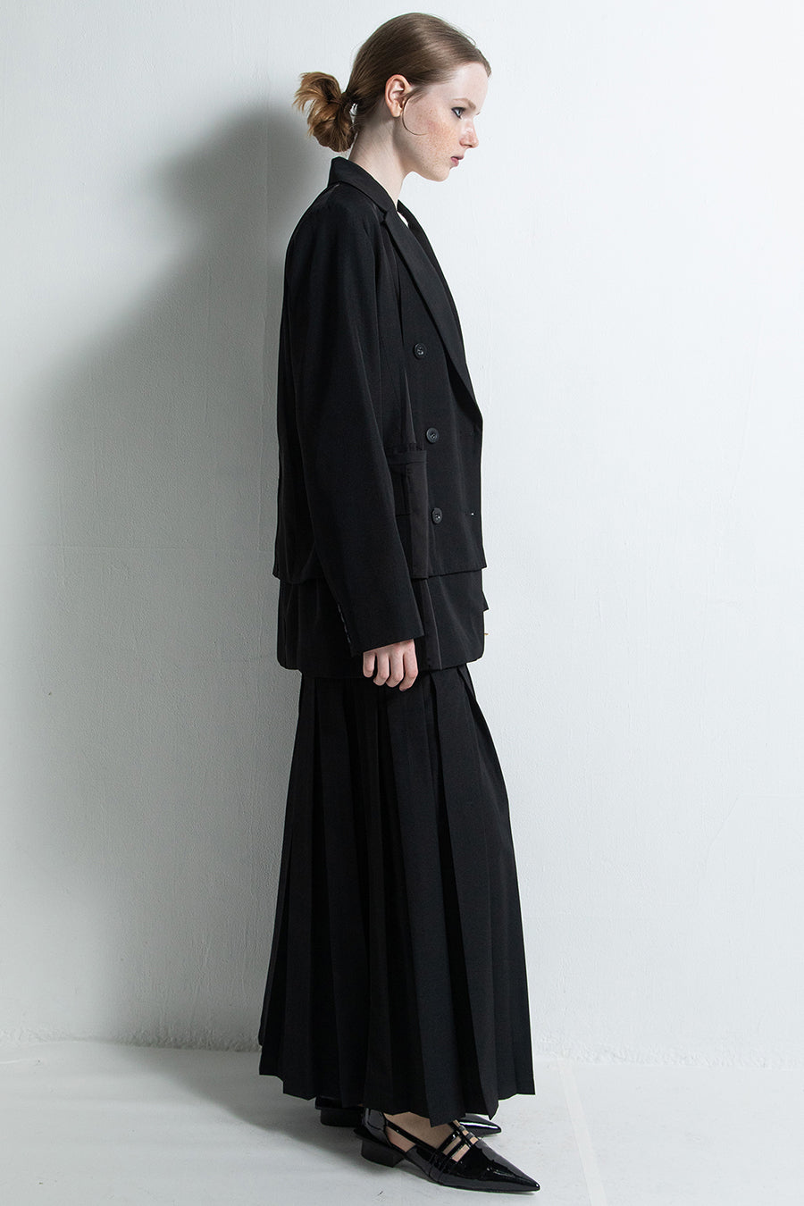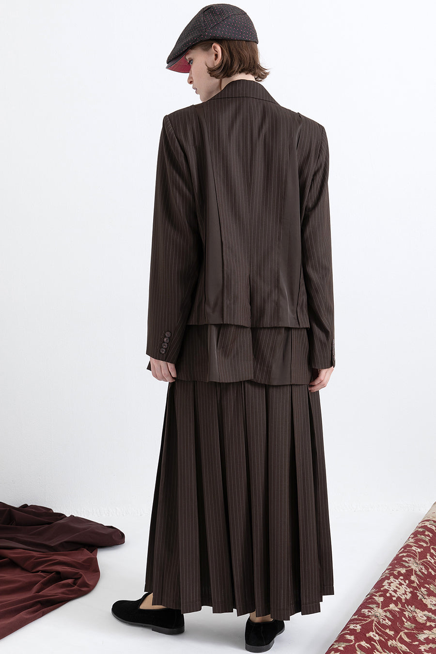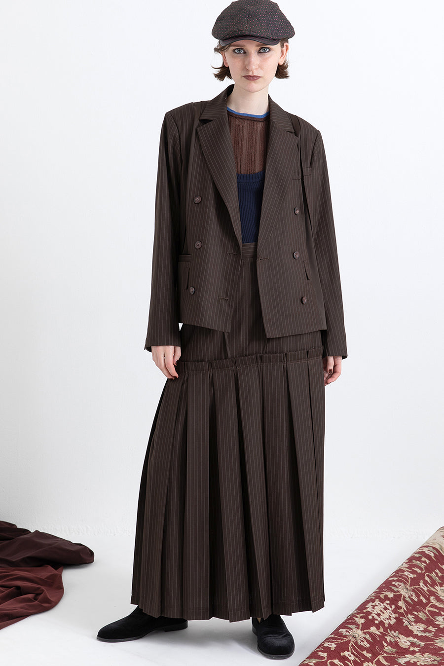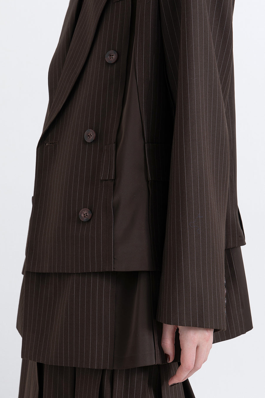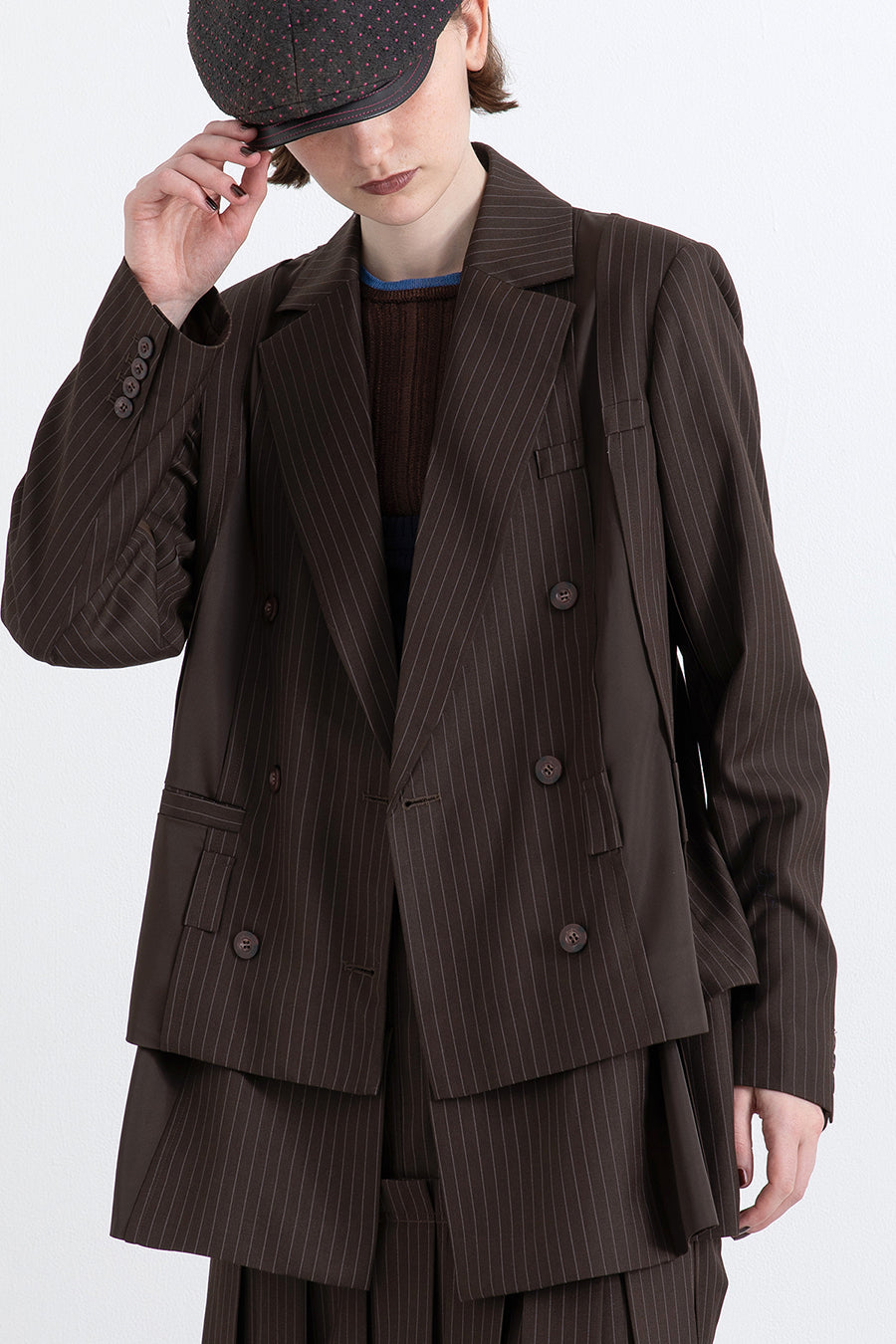 テーラードジャケットをリメイクしたかのような、マットサテンの切り替えデザインがポイントのジャケット。大きいけどルーズすぎない、抜け感のあるサイジングがこなれた印象に。レイヤードデザインの裾パーツはボタンで取り外しができるので、身長や合わせるボトムにベストなバランスを提案。着丈は2WAYで楽しめ、左右どちらかを外せば、アシンメトリーデザインにも。同素材でスカートの展開もあり、セットアップでの着用もおすすめ。グレーとブラックは無地。ブラウンはヴィンテージライクなピンストライプを使用。裏地付き。
