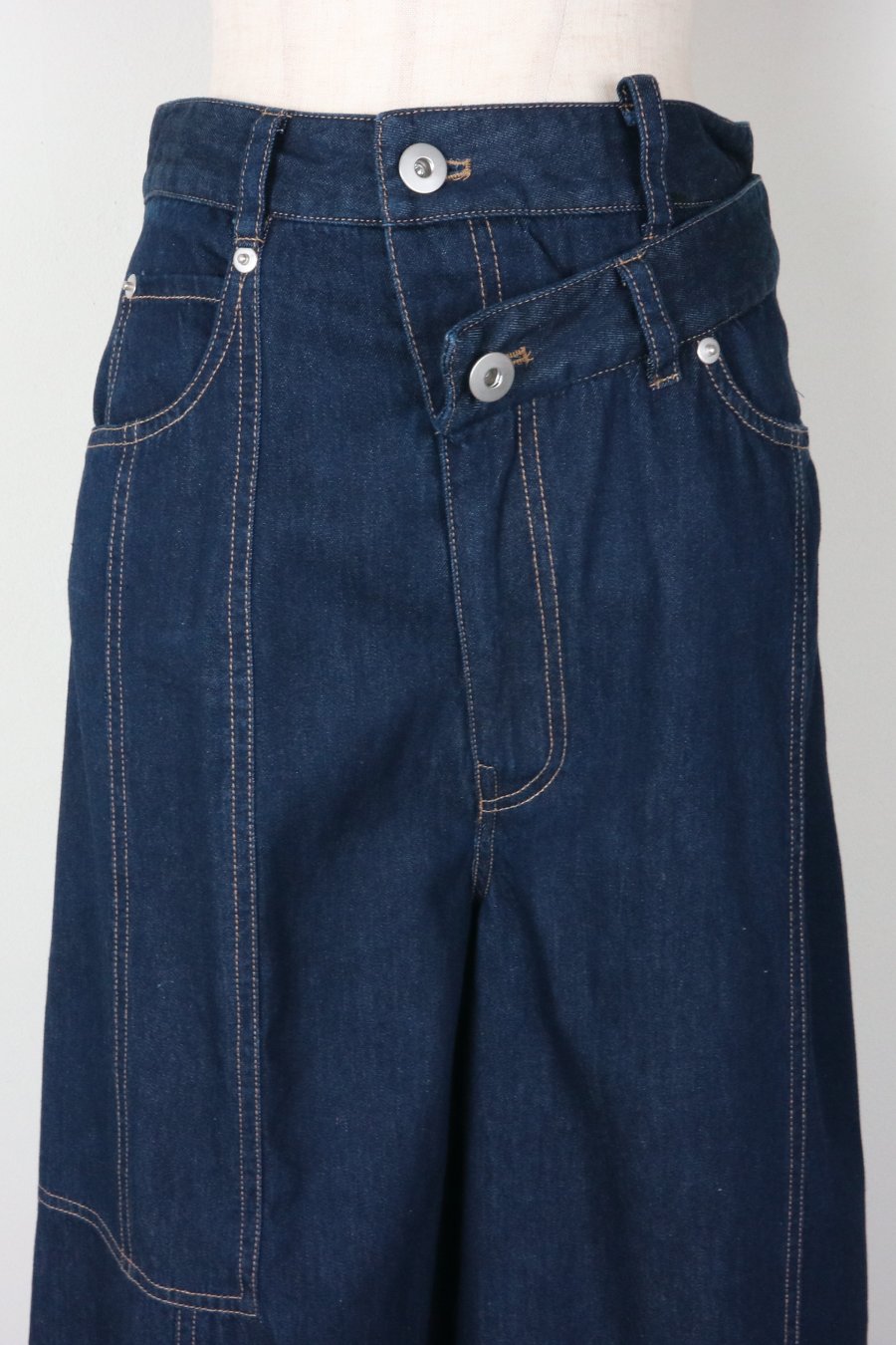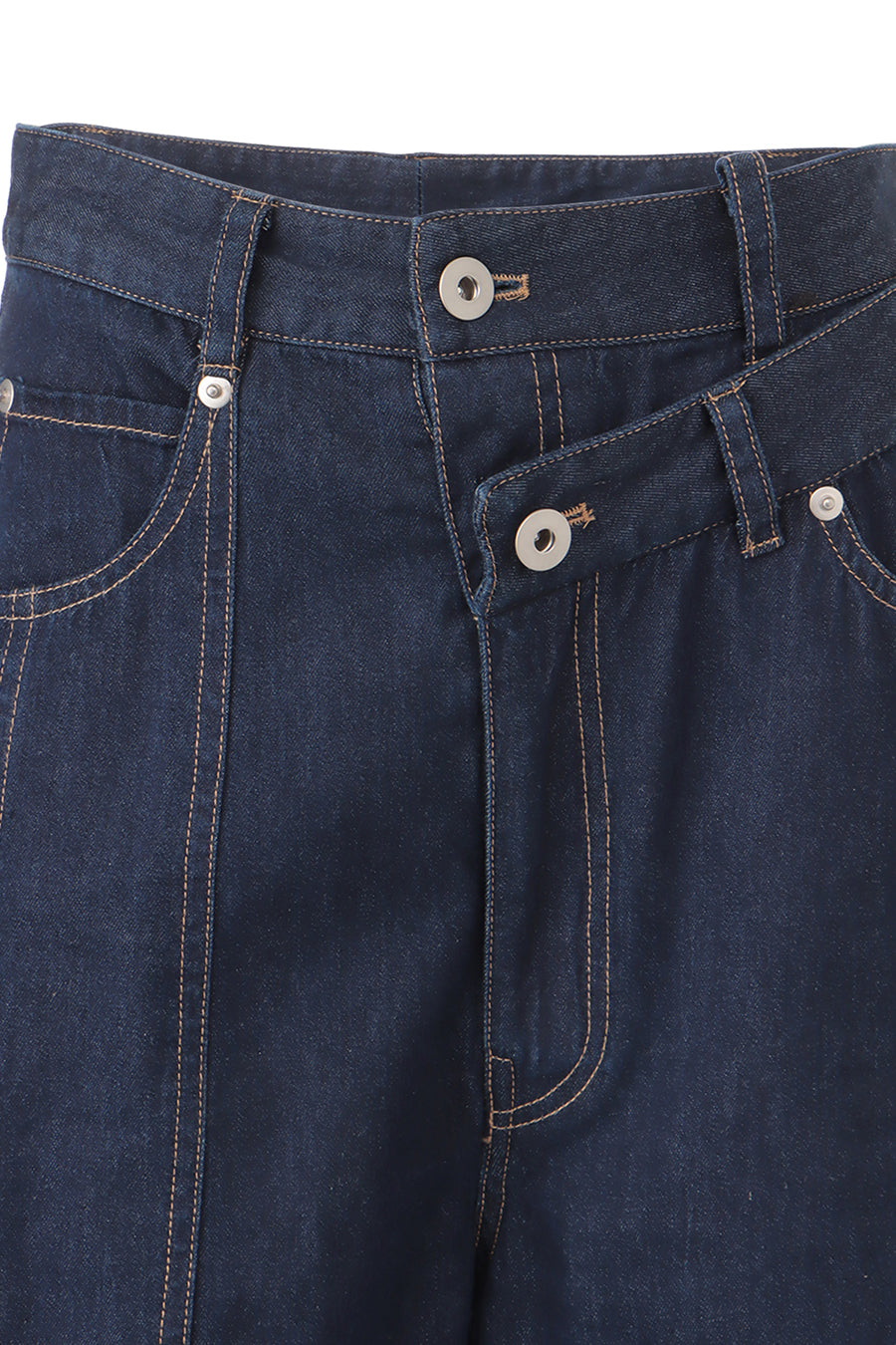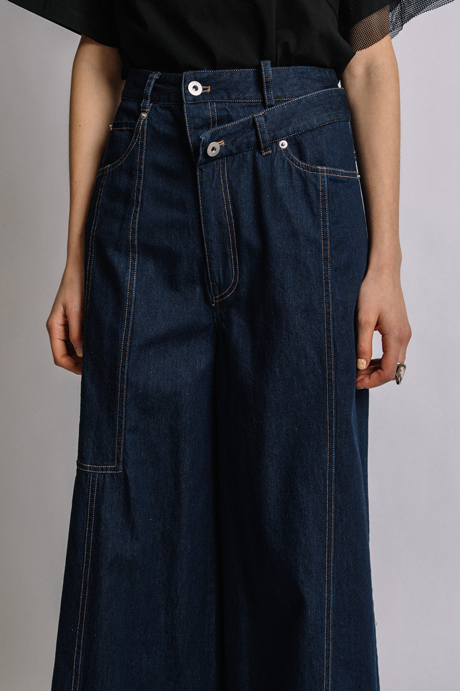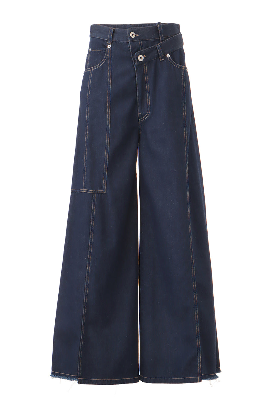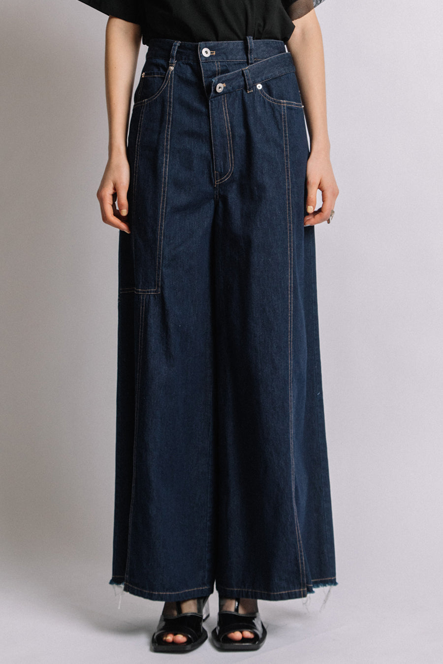 アシンメトリーなデザインが目を惹くワイドデニムパンツ。