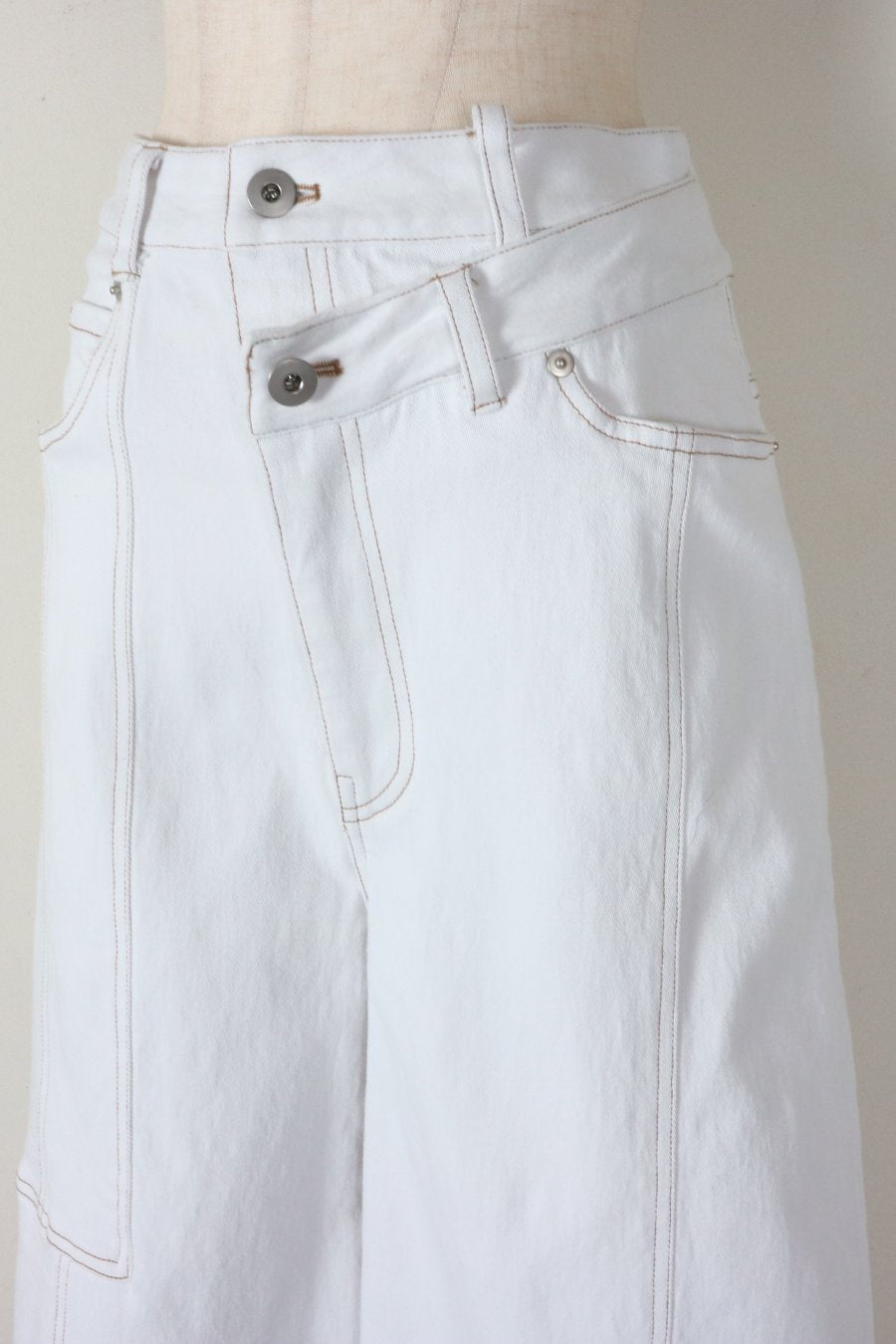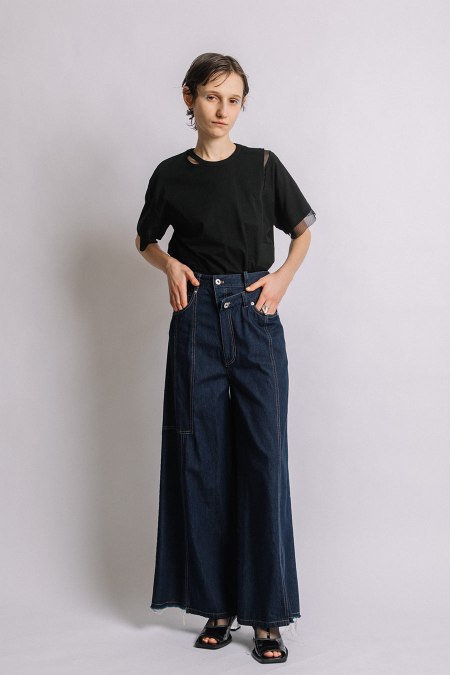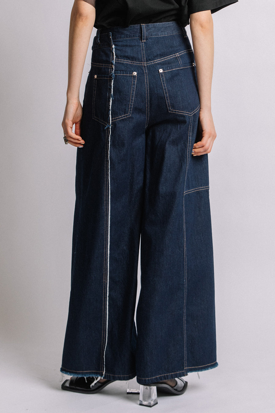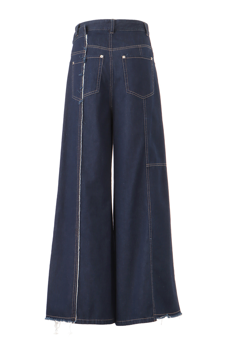 アシンメトリーなデザインが目を惹くワイドデニムパンツ。