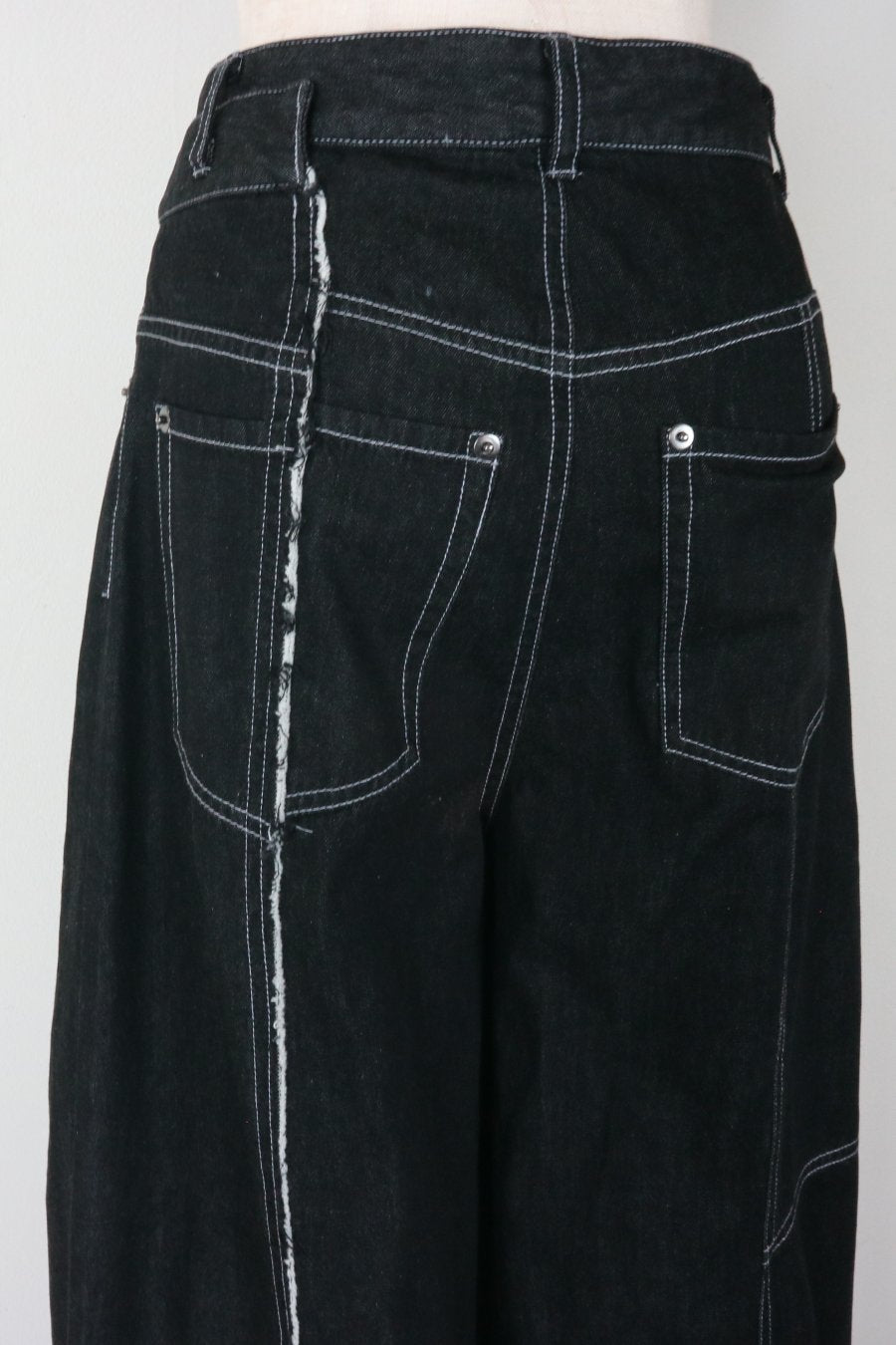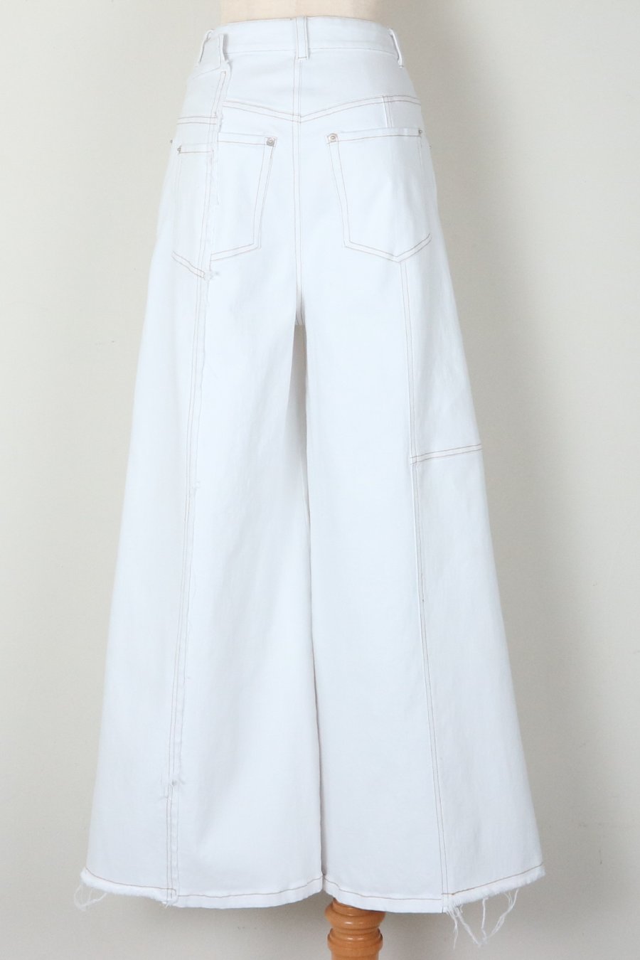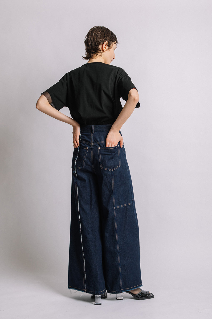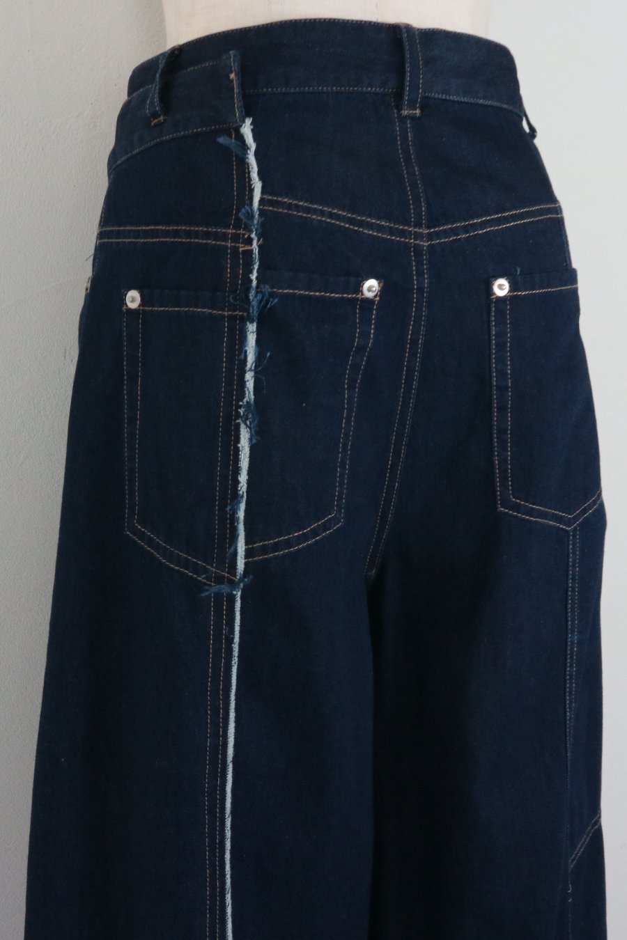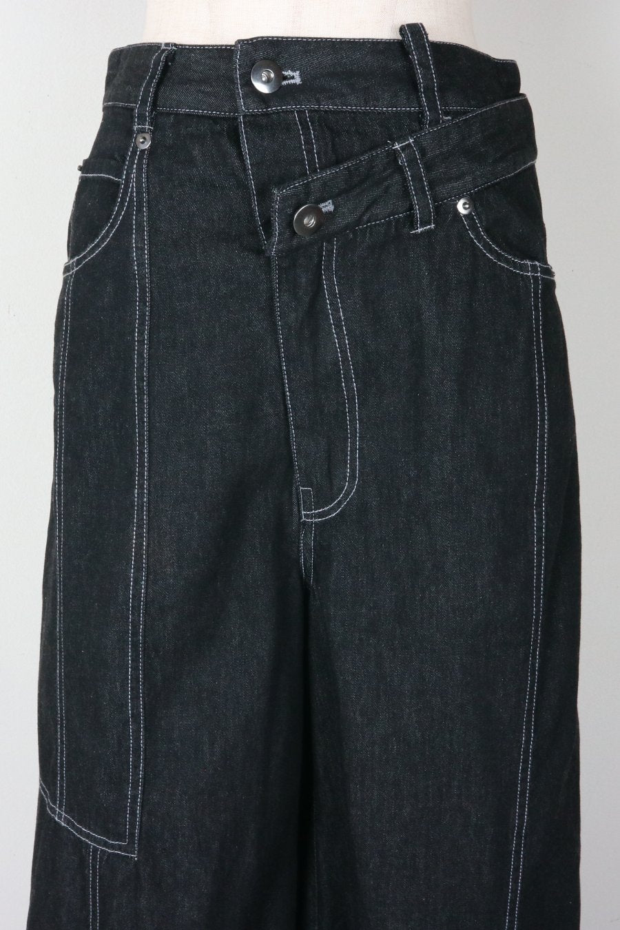 アシンメトリーなデザインが目を惹くワイドデニムパンツ。