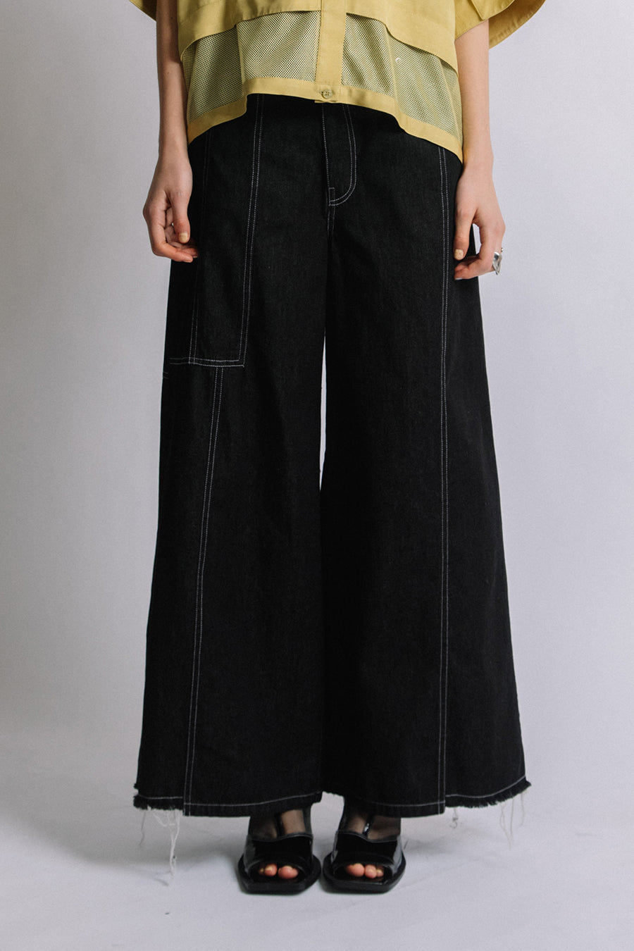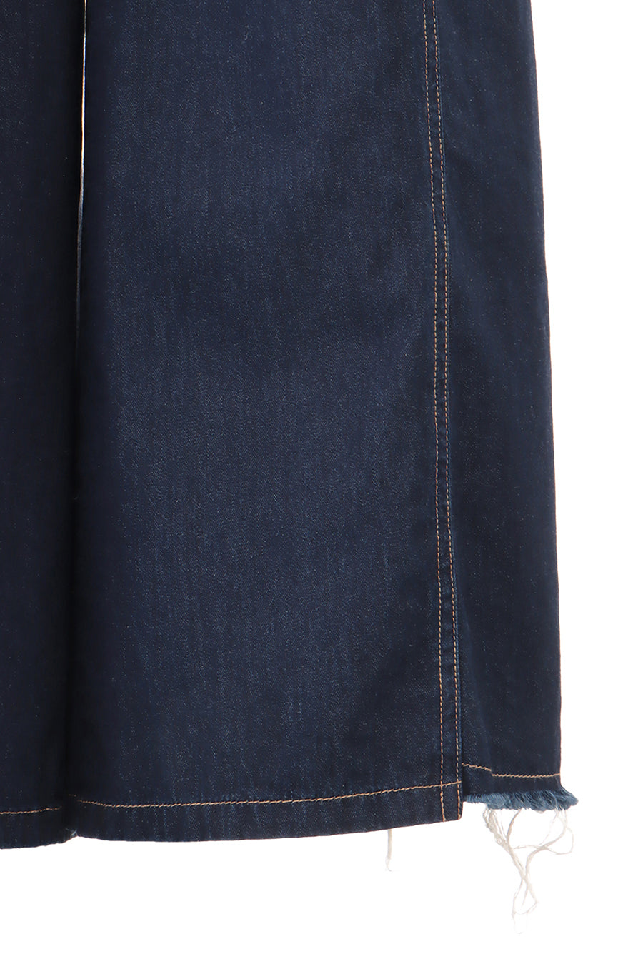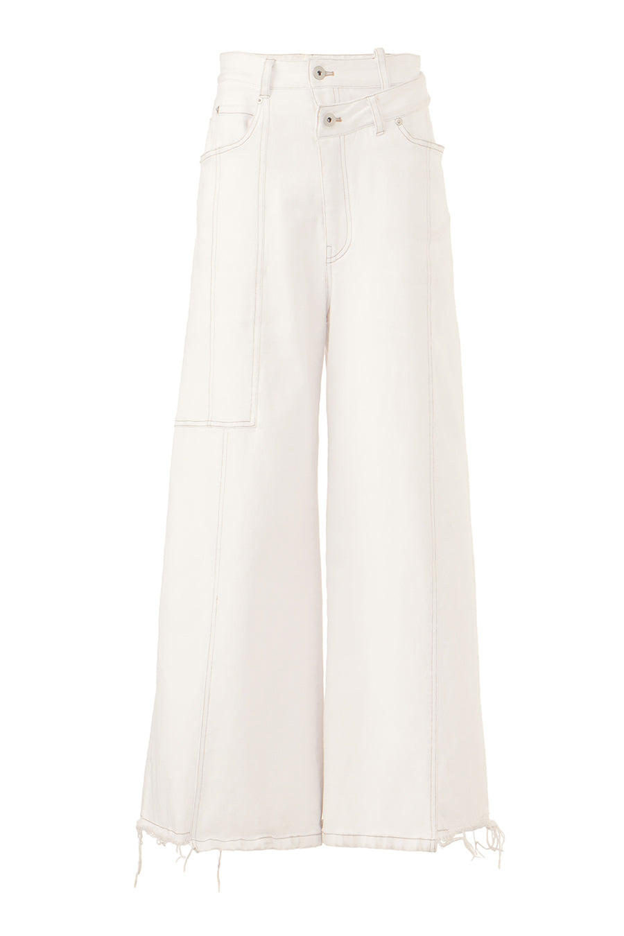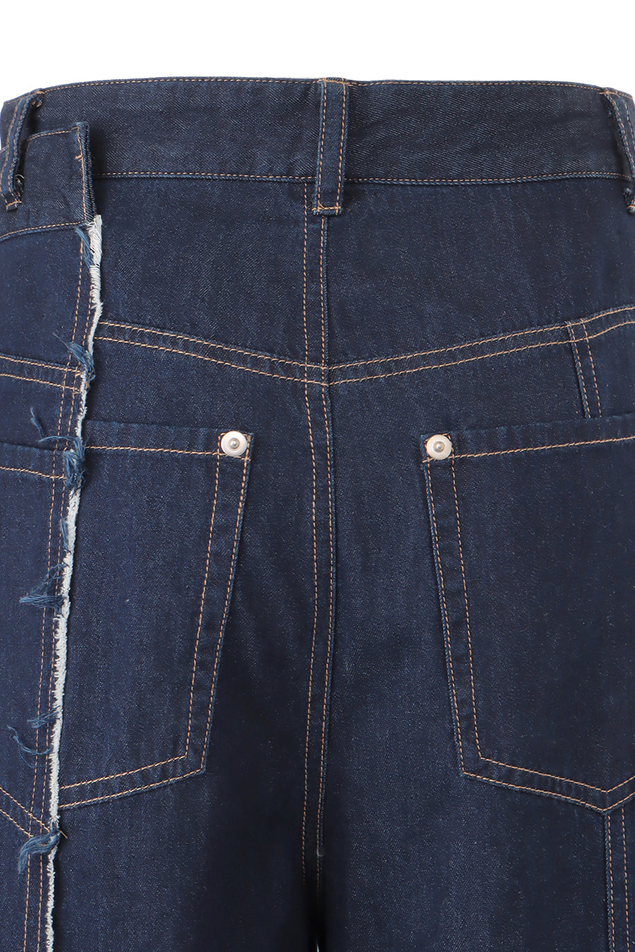 アシンメトリーなデザインが目を惹くワイドデニムパンツ。