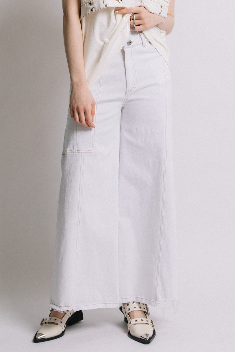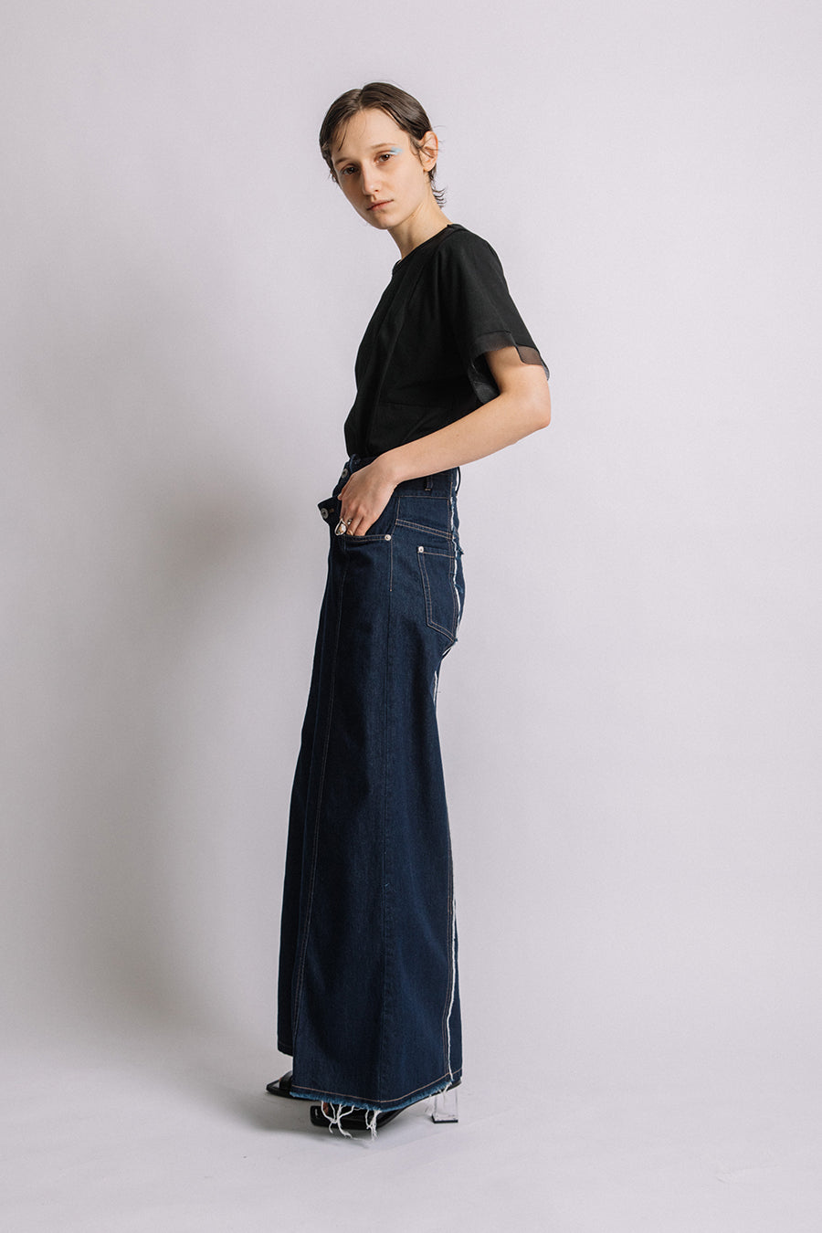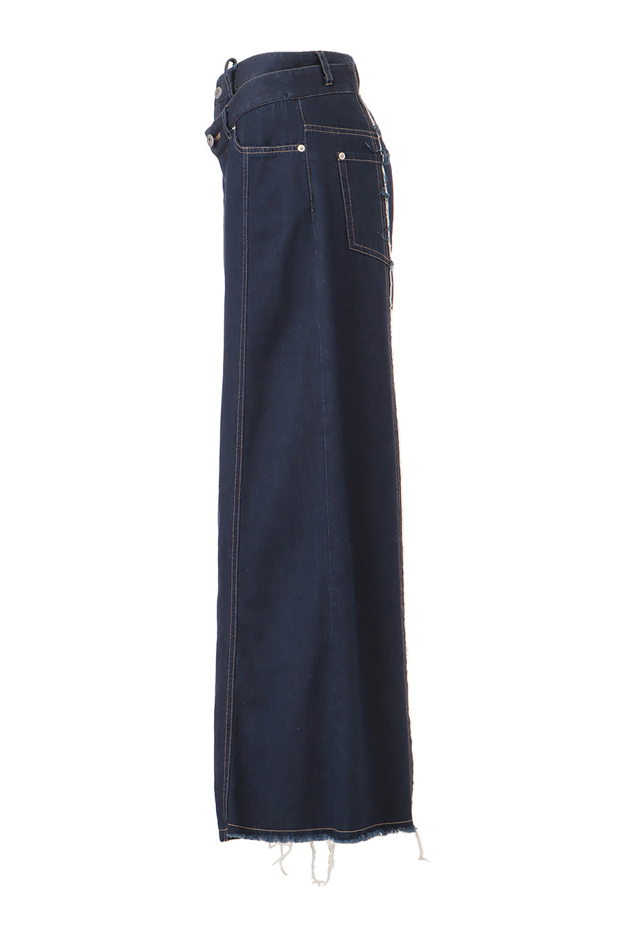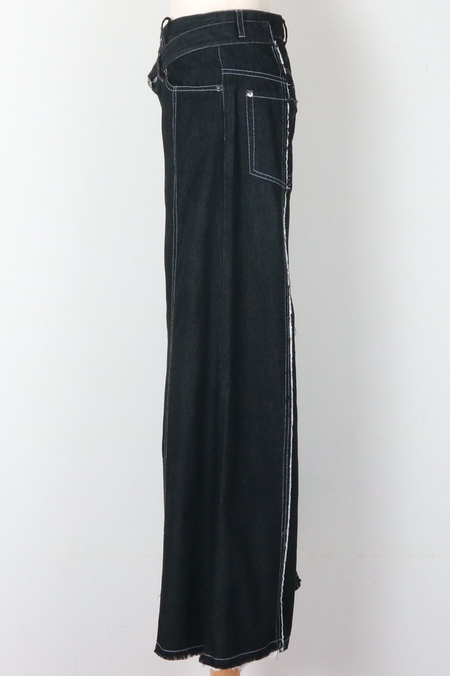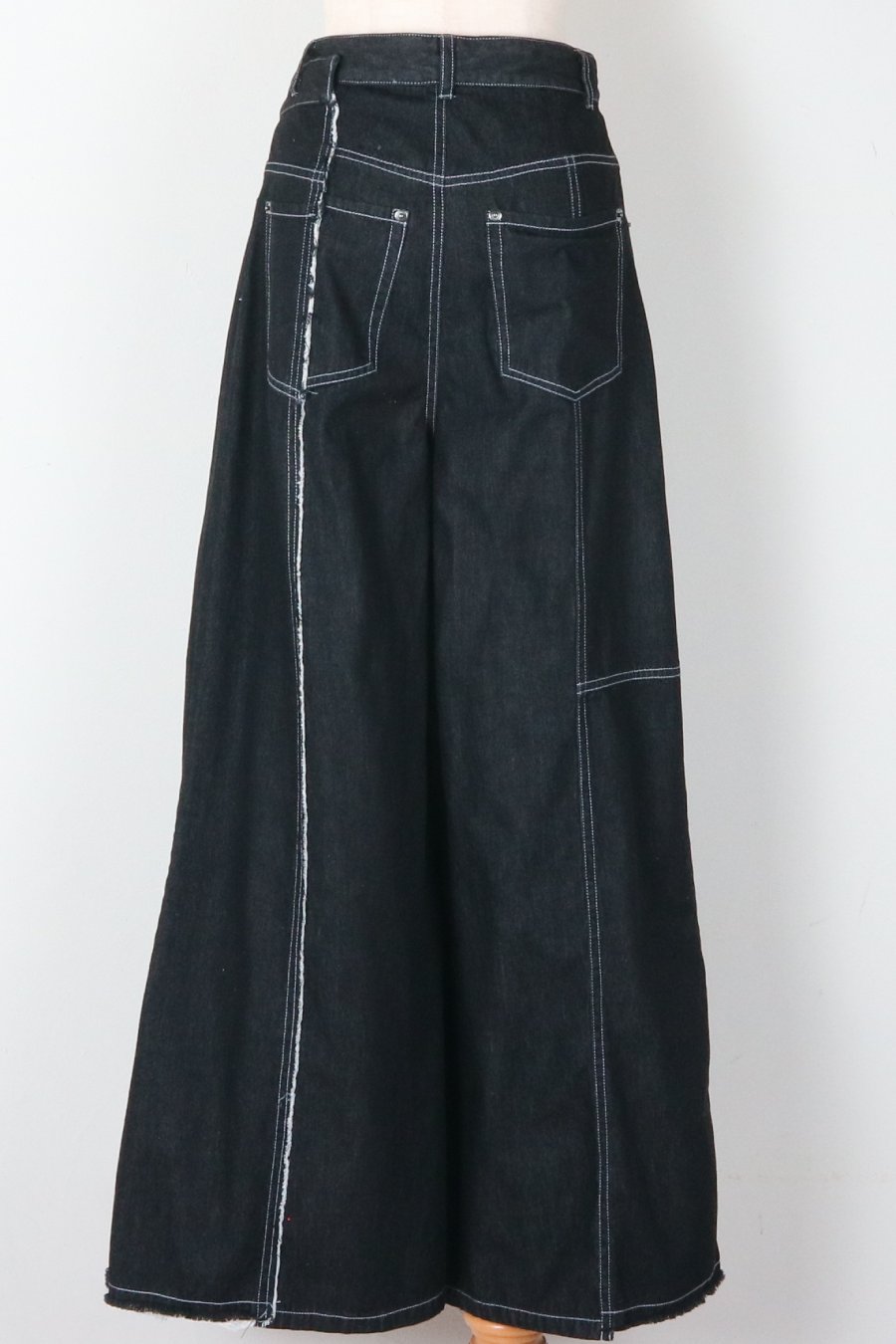 アシンメトリーなデザインが目を惹くワイドデニムパンツ。