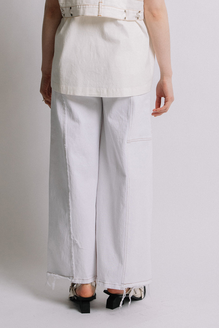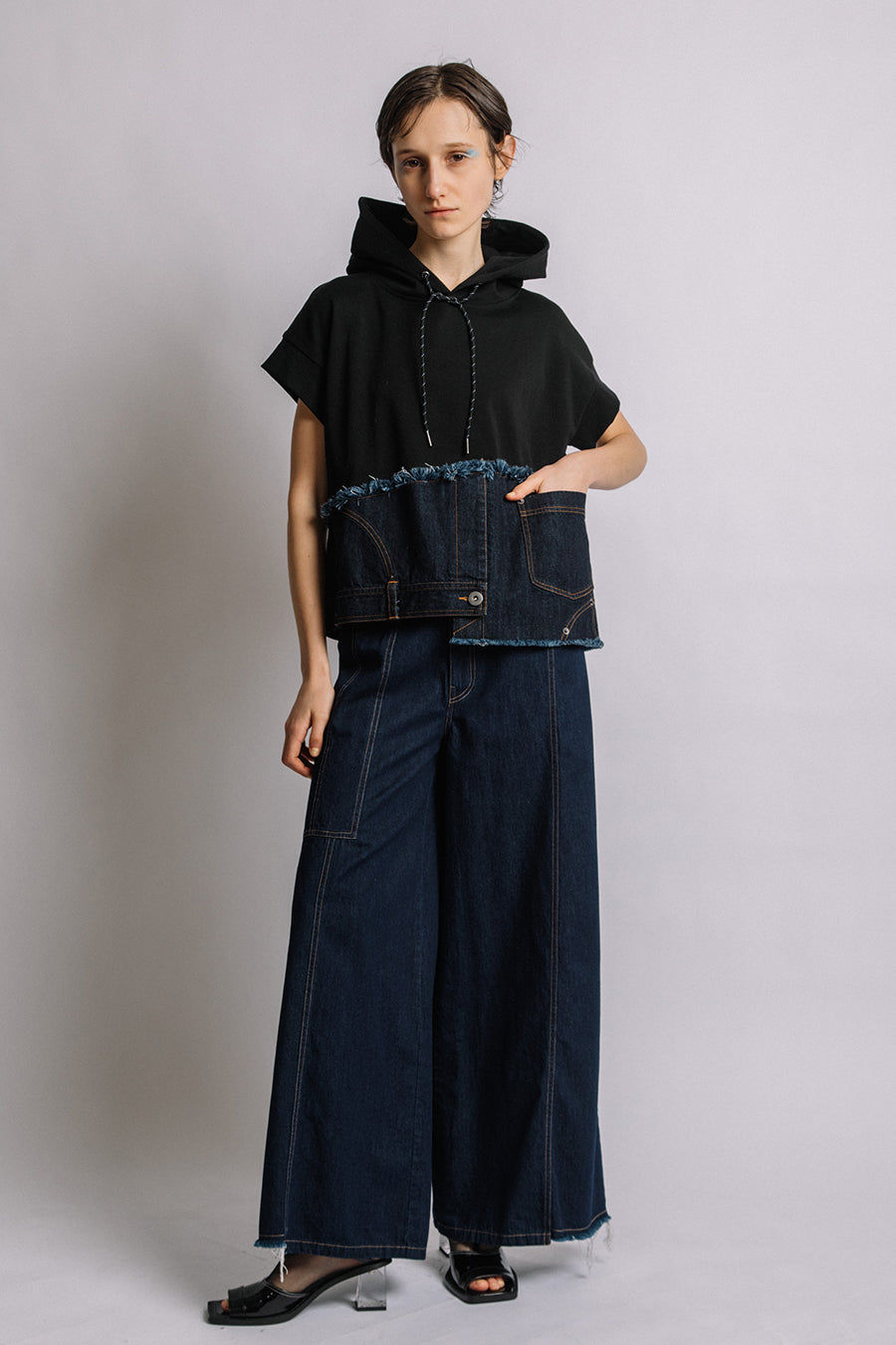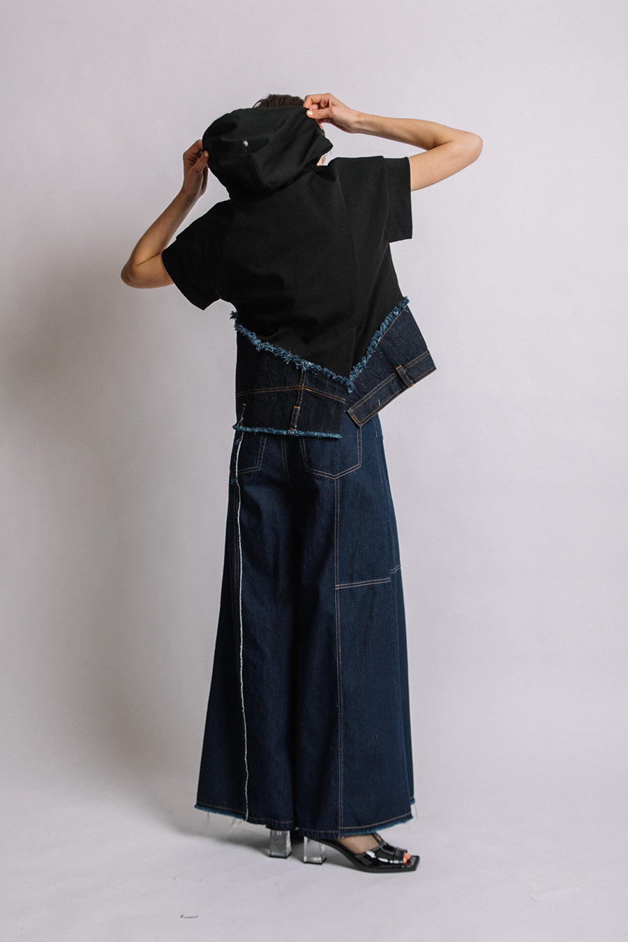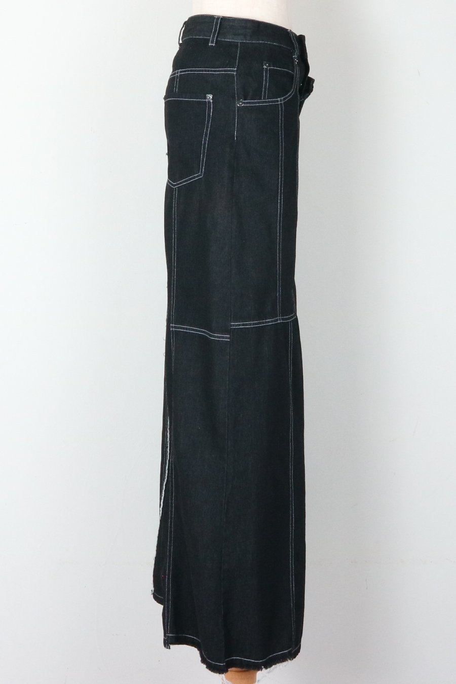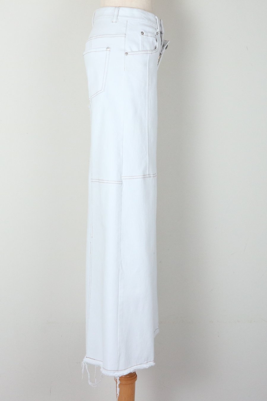 アシンメトリーなデザインが目を惹くワイドデニムパンツ。