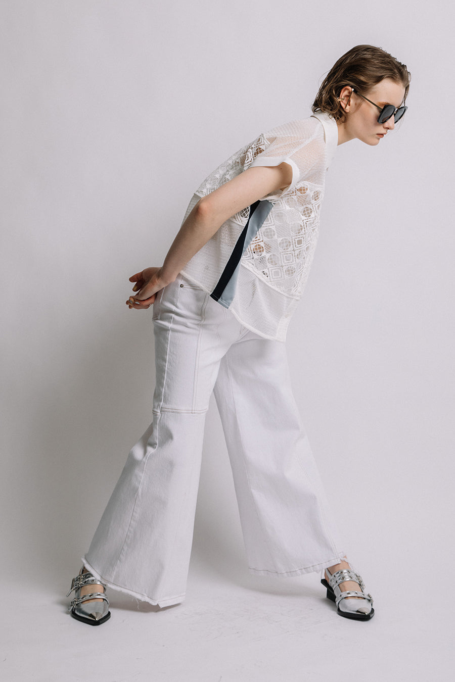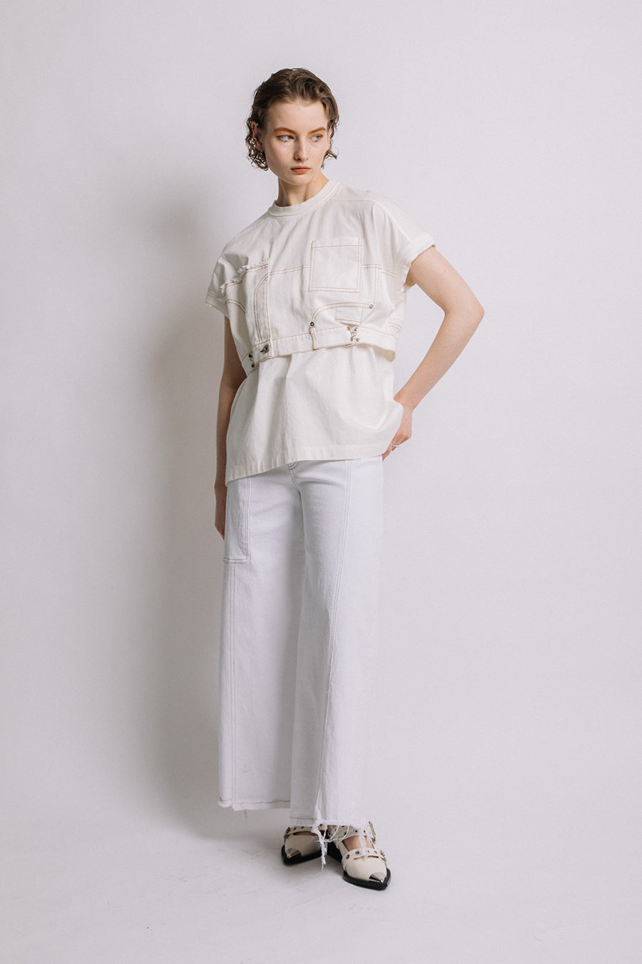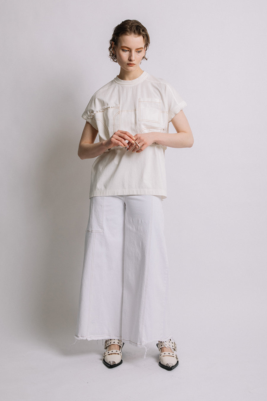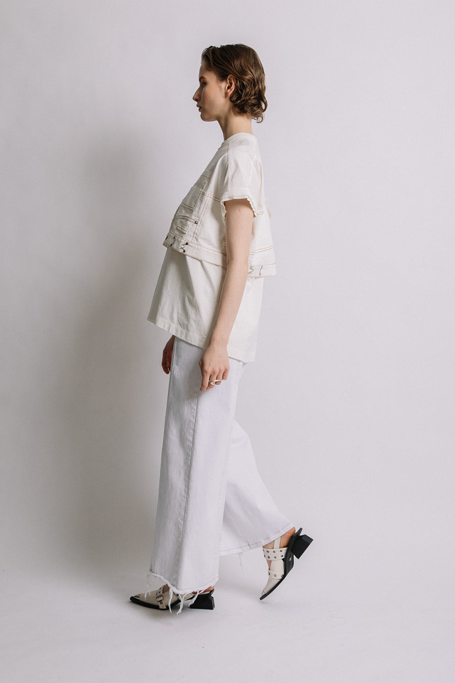 アシンメトリーなデザインが目を惹くワイドデニムパンツ。
