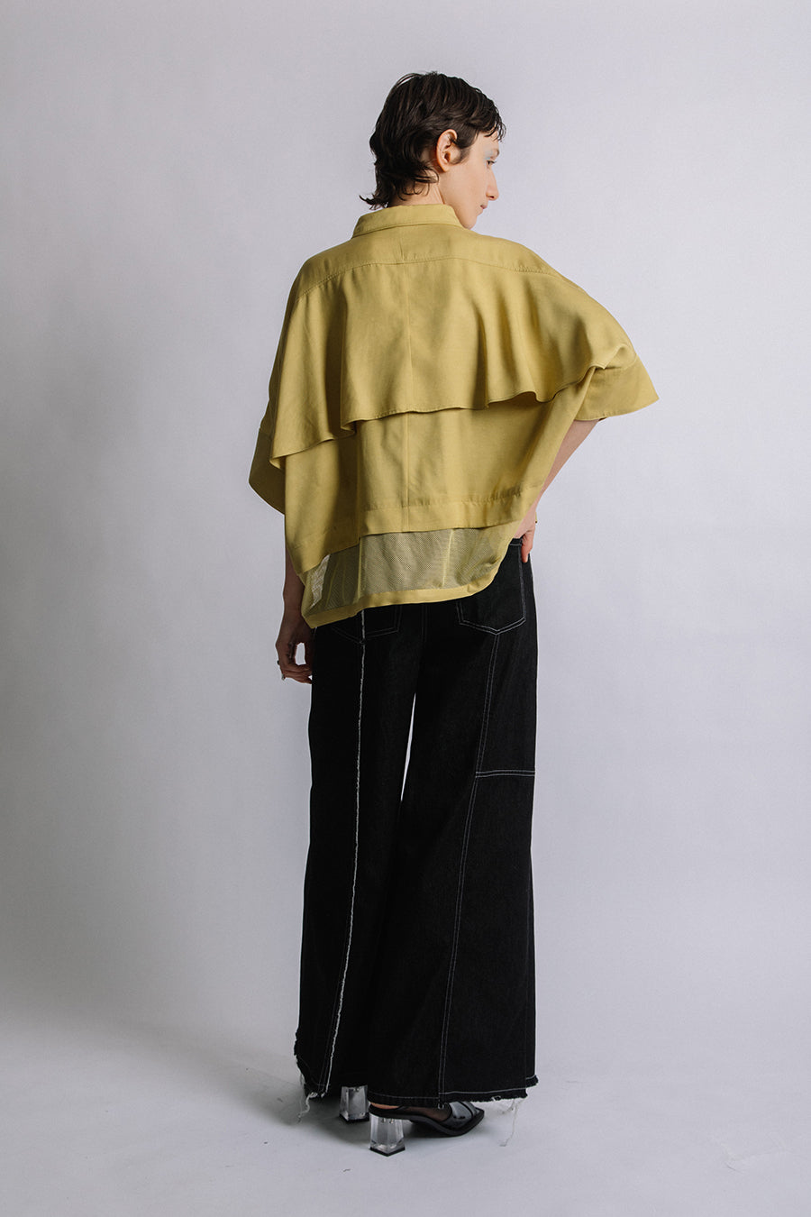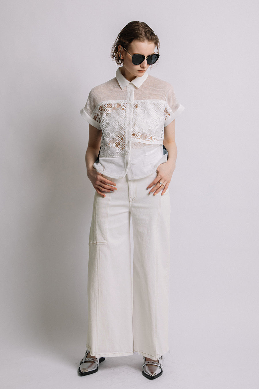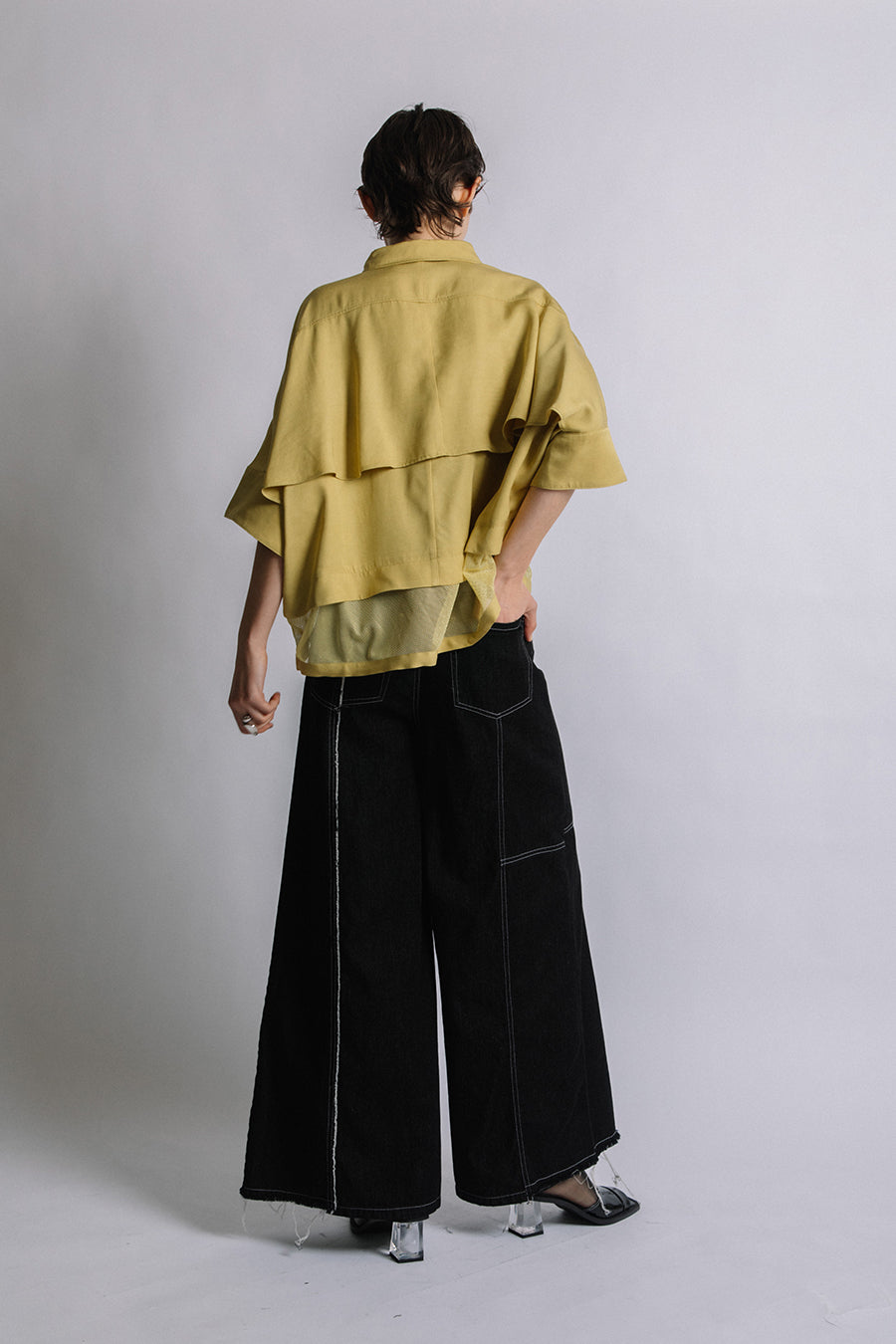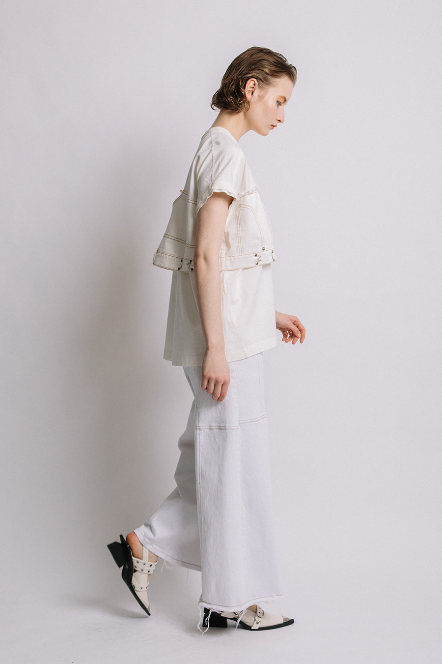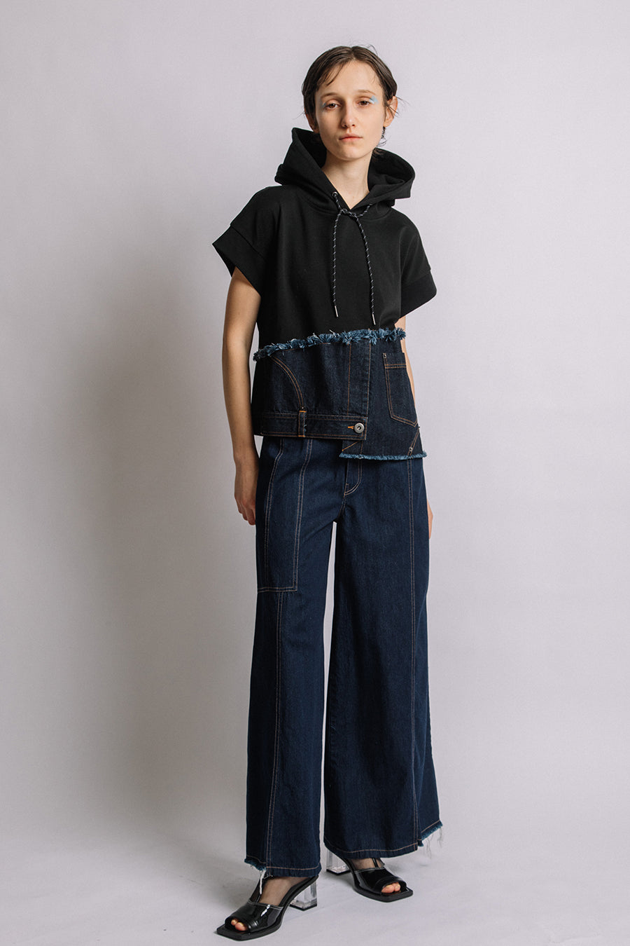 アシンメトリーなデザインが目を惹くワイドデニムパンツ。