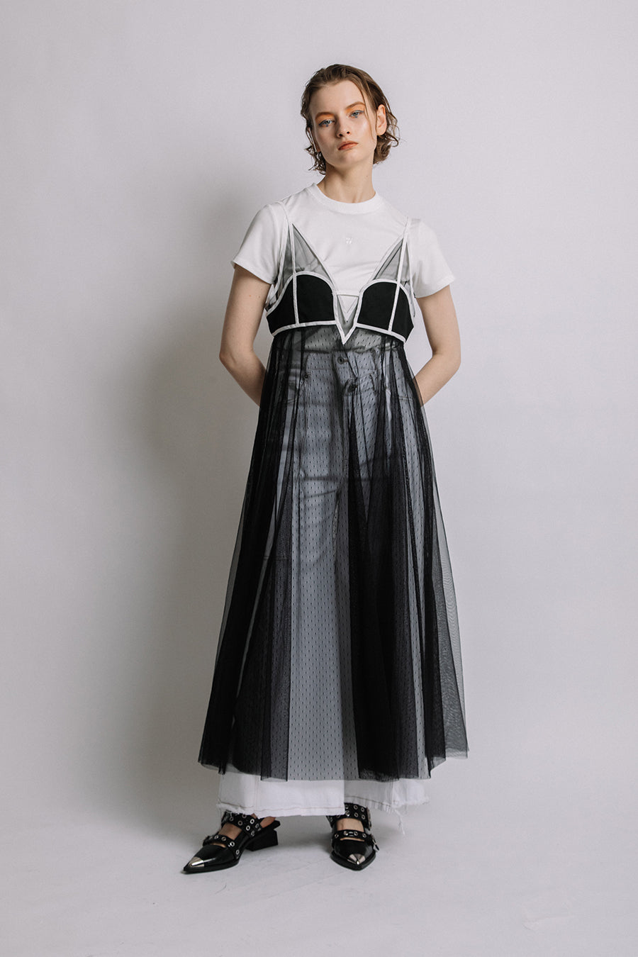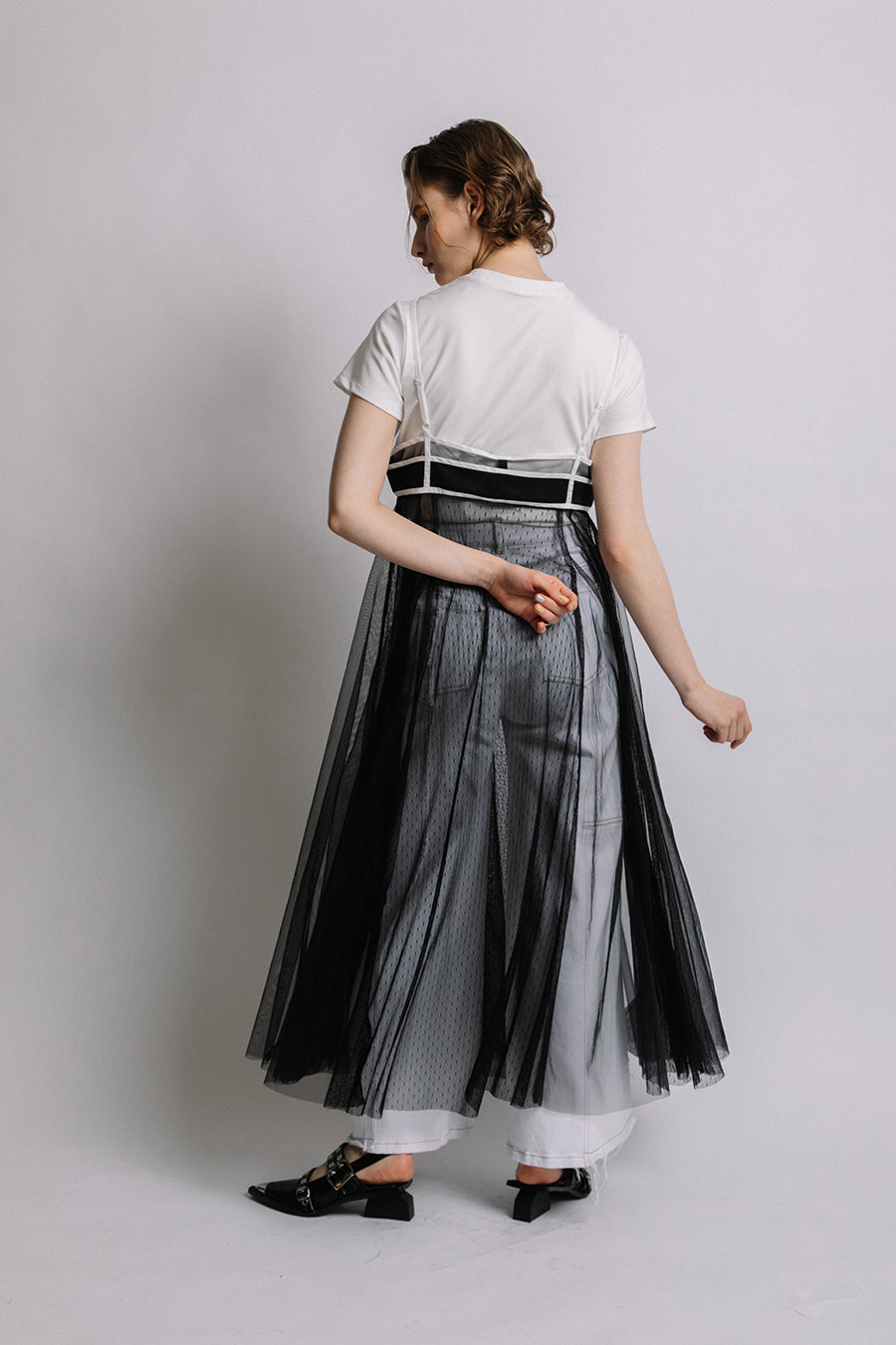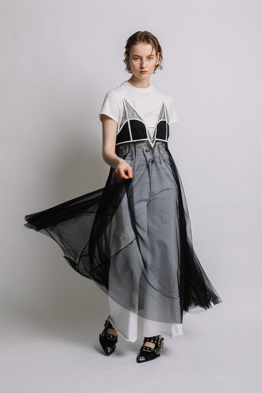 左はダブルウエストデザインで、左後のハギや裾のサイドのカットオフがこなれ感を演出。トップスをインしてウエストを見せたスタイリングがおすすめ。