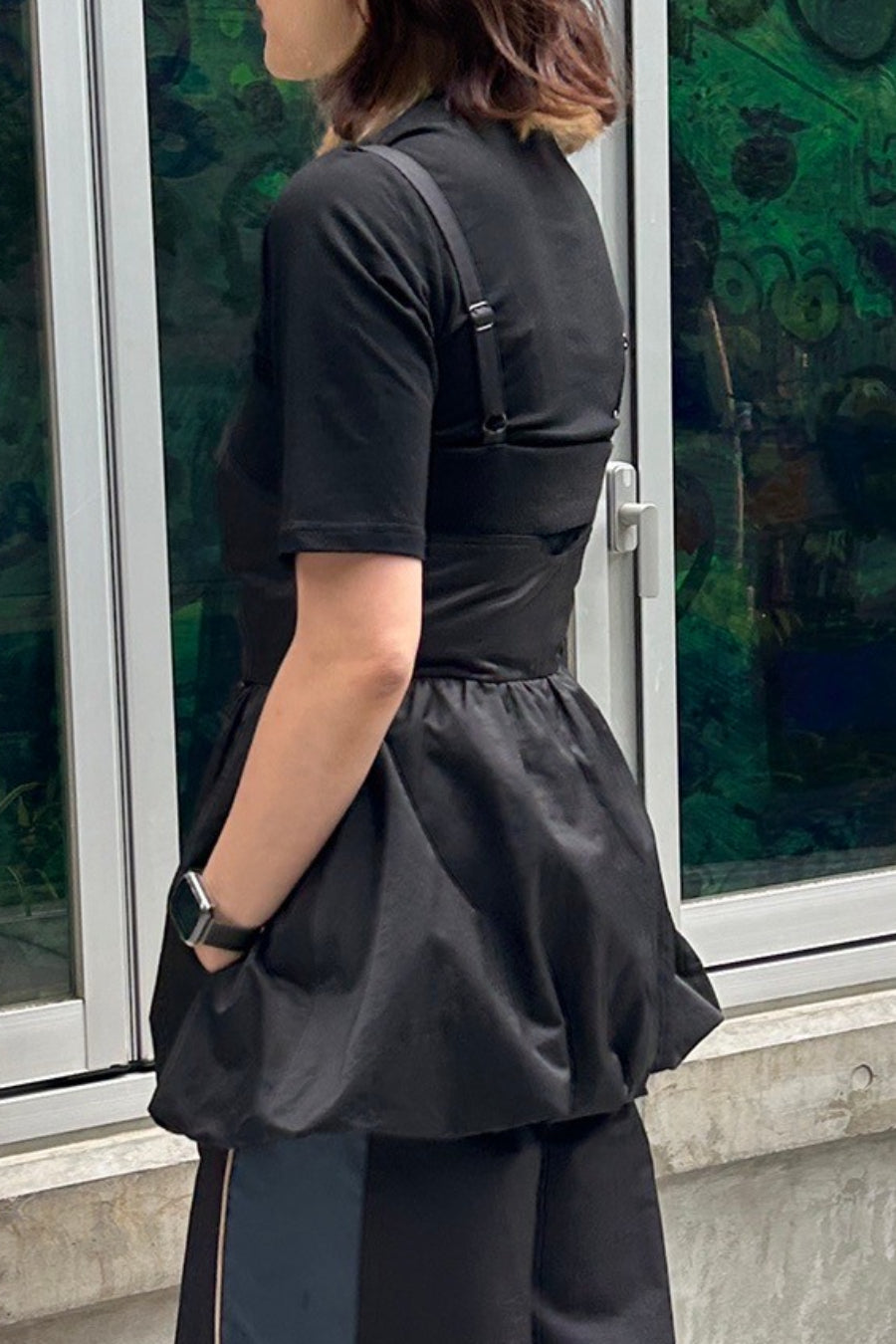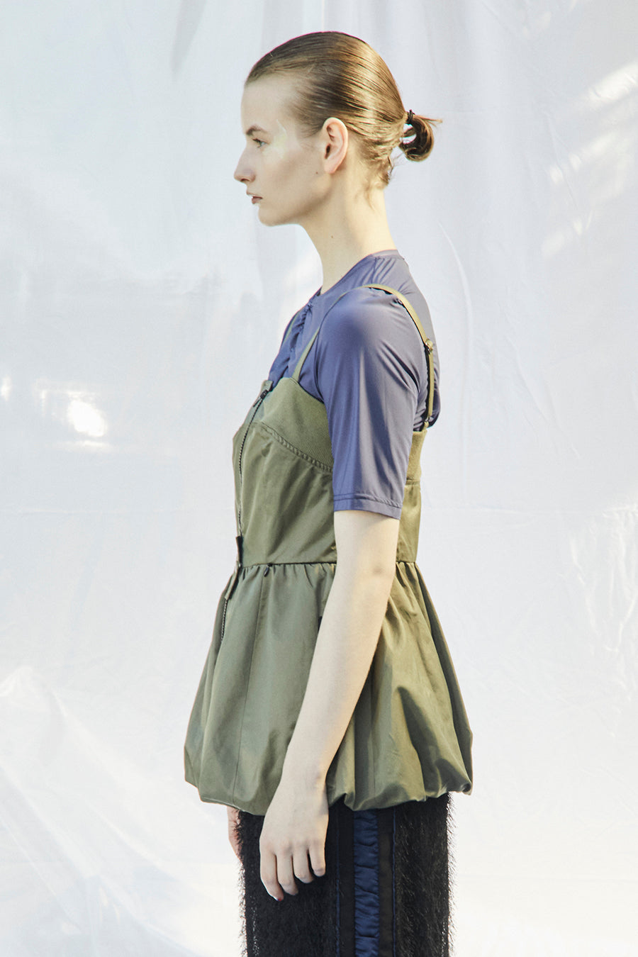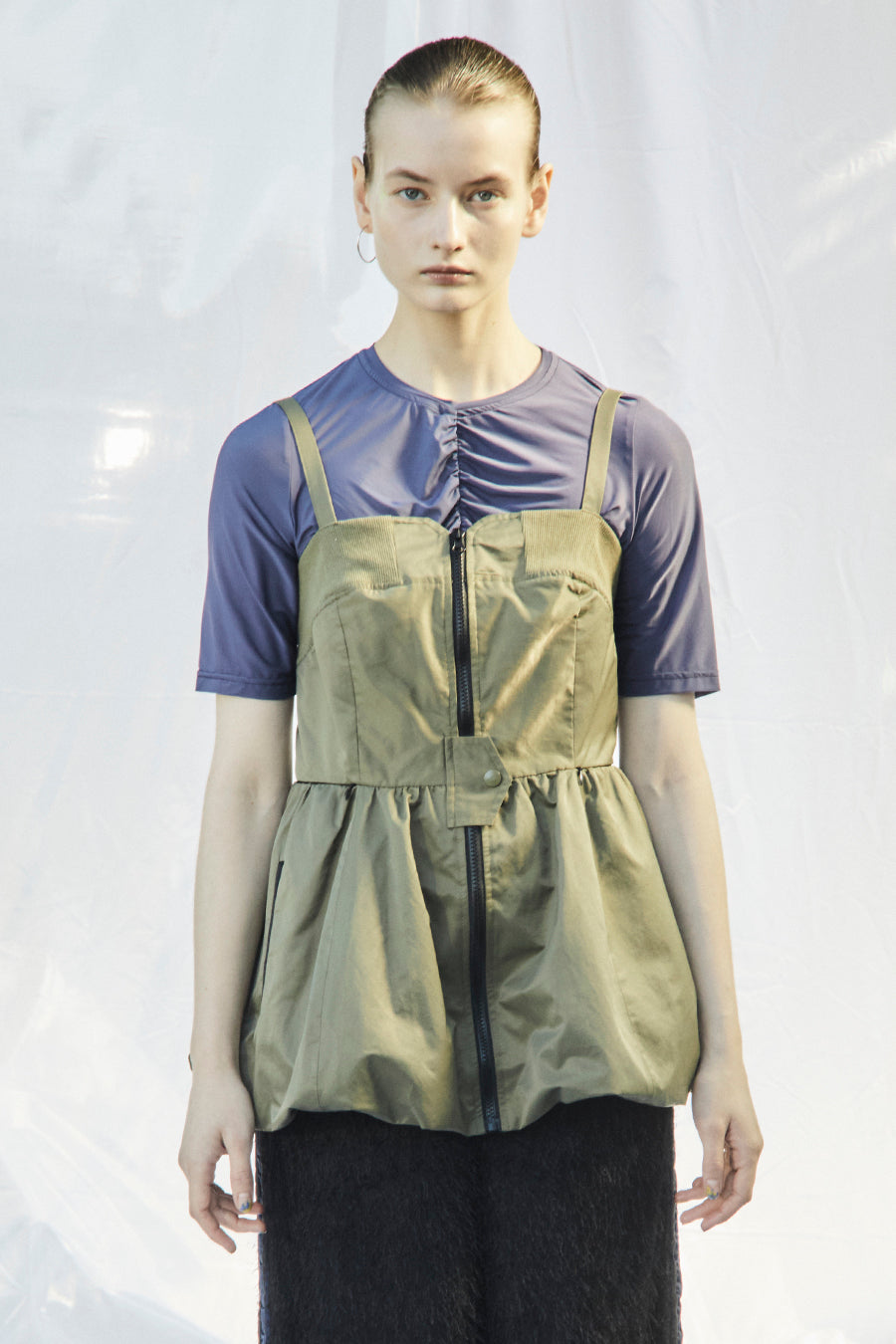 センターフロントのギャザーがデザインポイントで、SETでインナーとしてレイヤードしていただくのはもちろん、1枚で着ても存在感のあるアイテムです。細身のシルエットですが、バスト・アームホールはゆとりのあるサイズ設定なのでボディラインを拾わず、ストレスフリーでご着用いただけます。