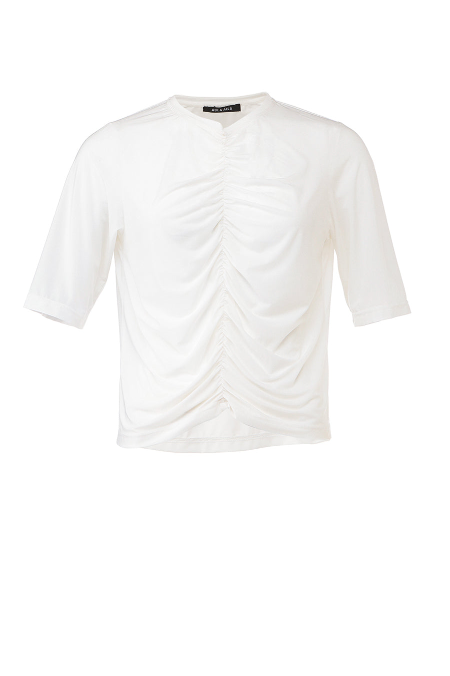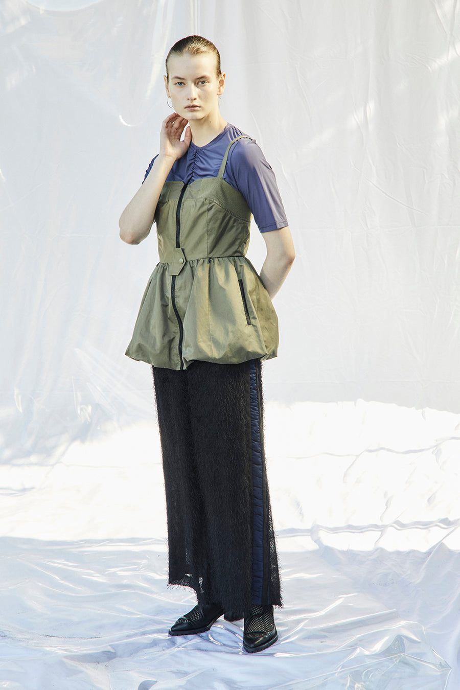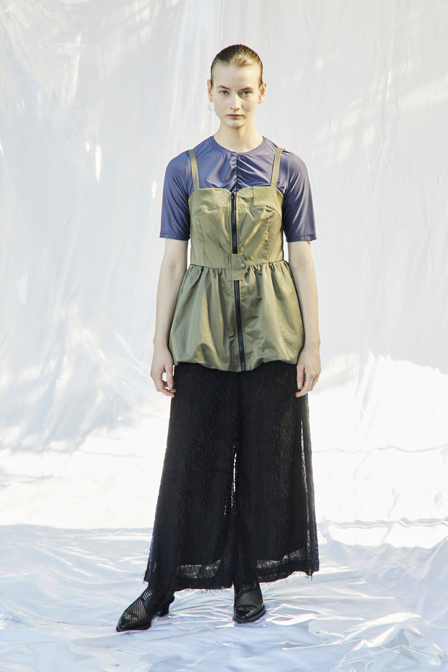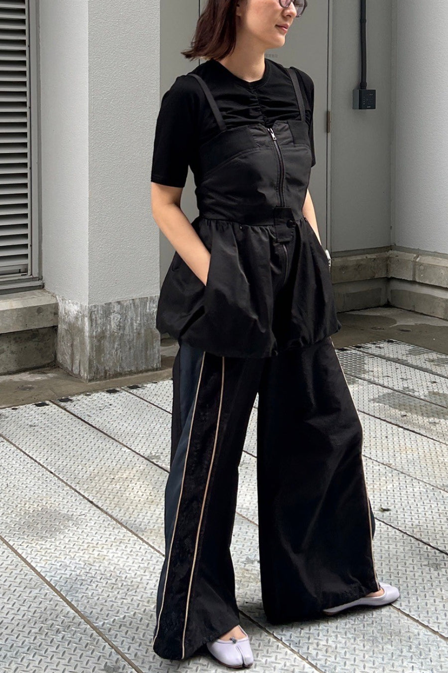 センターフロントのギャザーがデザインポイントで、SETでインナーとしてレイヤードしていただくのはもちろん、1枚で着ても存在感のあるアイテムです。細身のシルエットですが、バスト・アームホールはゆとりのあるサイズ設定なのでボディラインを拾わず、ストレスフリーでご着用いただけます。
