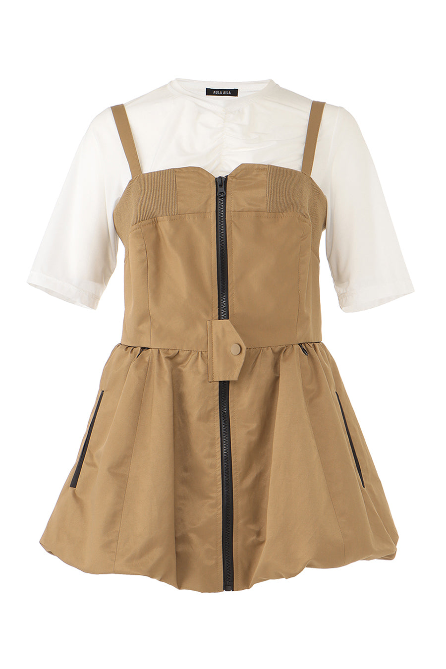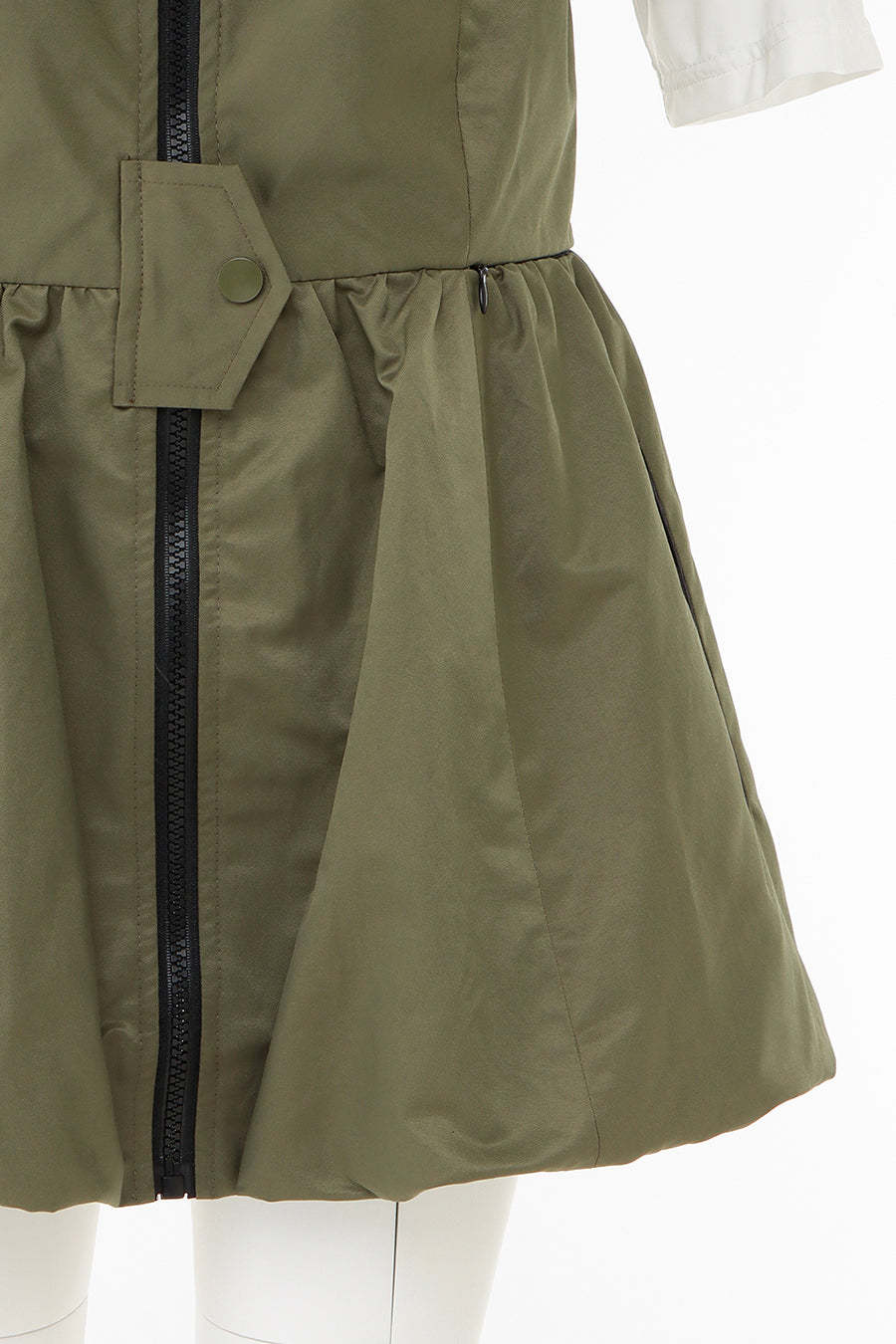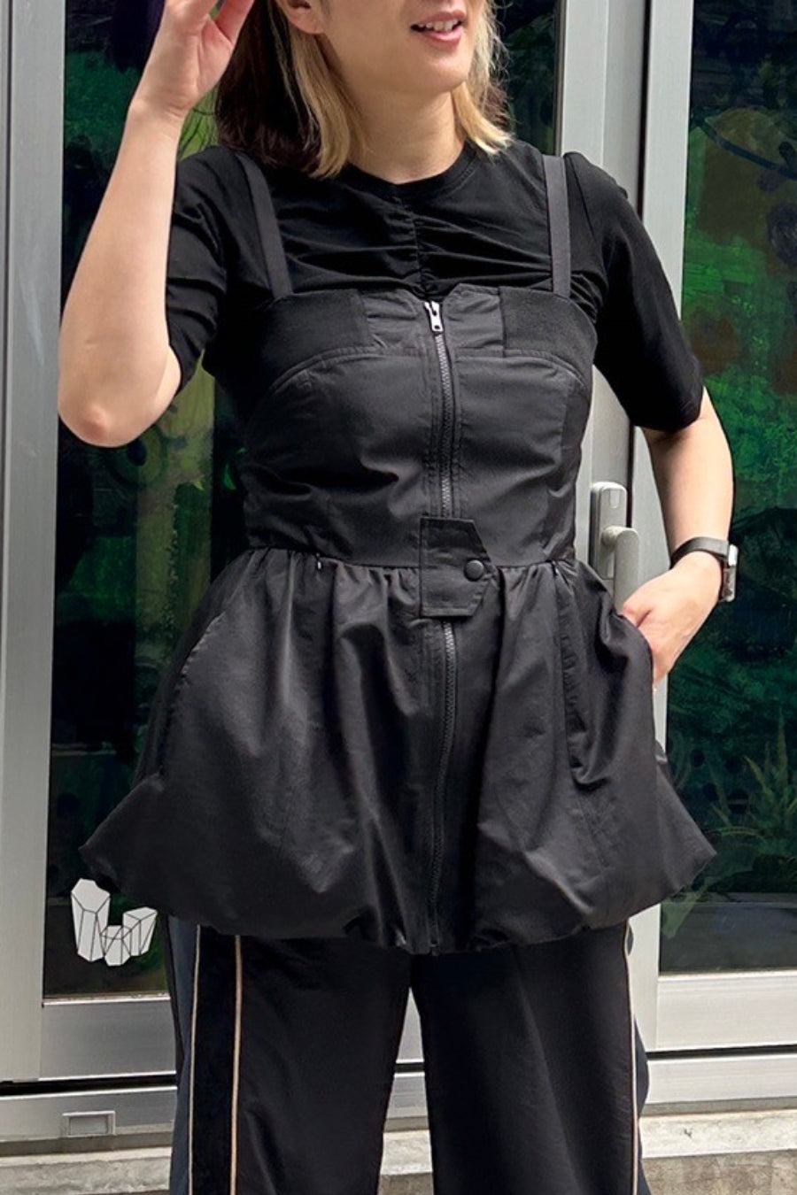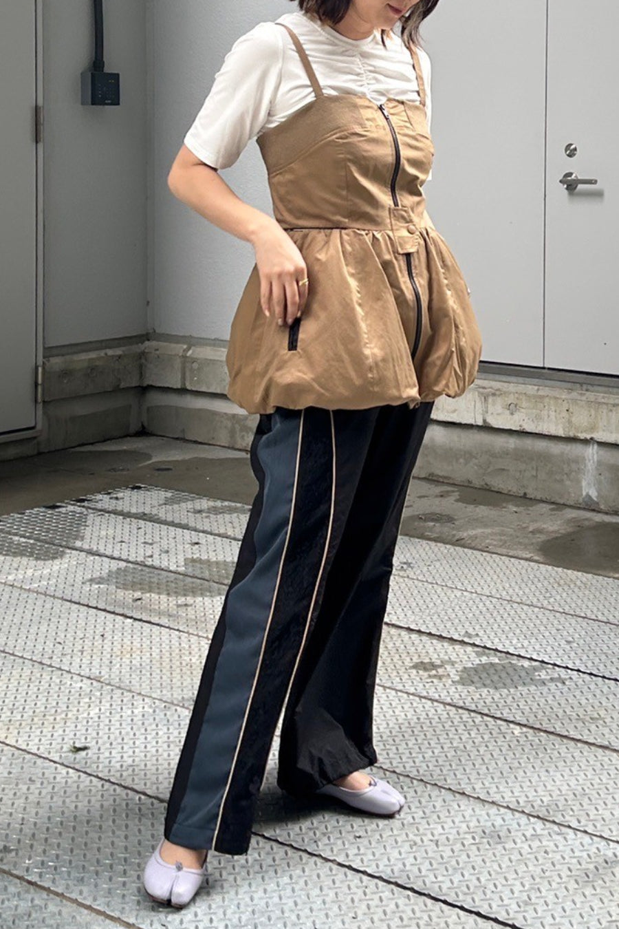 上品な光沢としなやかなハリ感がある高密度ナイロンコットンツイル素材を使用。程よく広がるバルーンシルエットがレディライクな印象に。ヒップまわりもカバーしてスタイルアップ効果あり◎ バストの編立てリブはバストまわりをすっきりと見せて、体にフィットしてくれます。ウエスト切り替えのサイドファスナーはお好みの位置で開閉してスリットデザインをつくれます。インナートップスをのぞかせて抜け感のあるスタイリングもおすすめです。肩ヒモはアジャスターで長さ調節可能です。