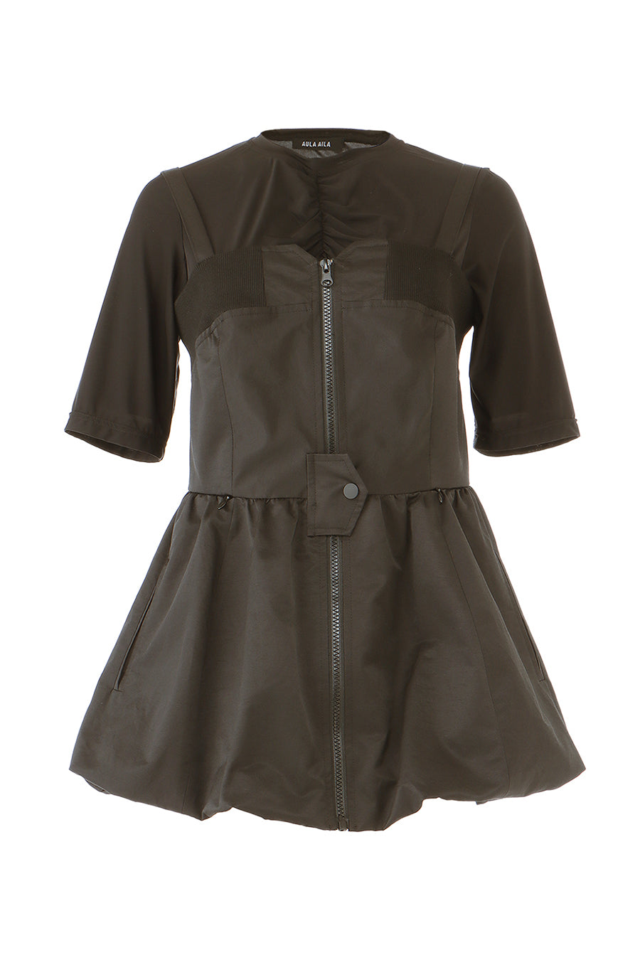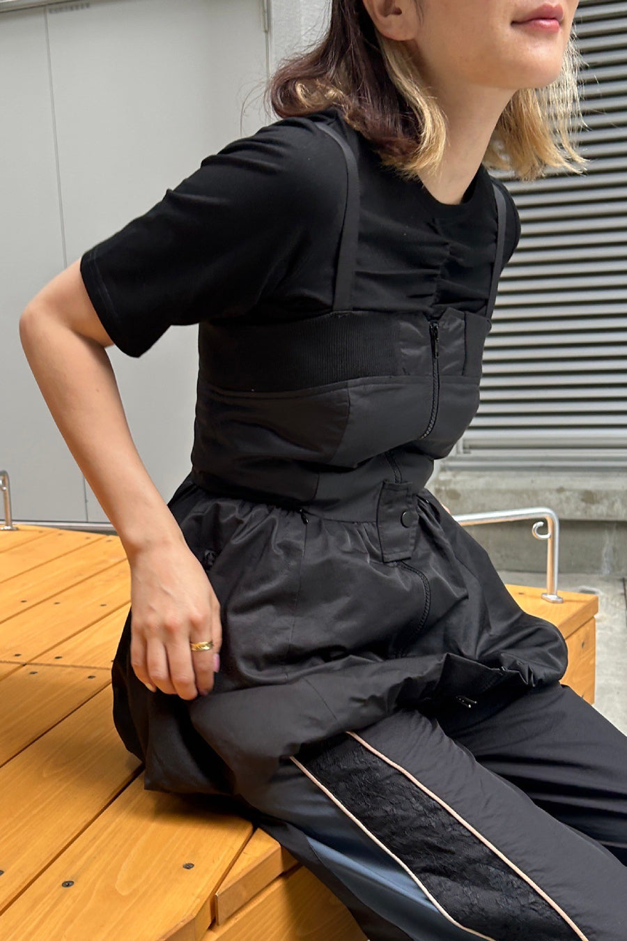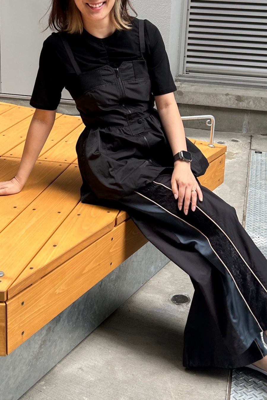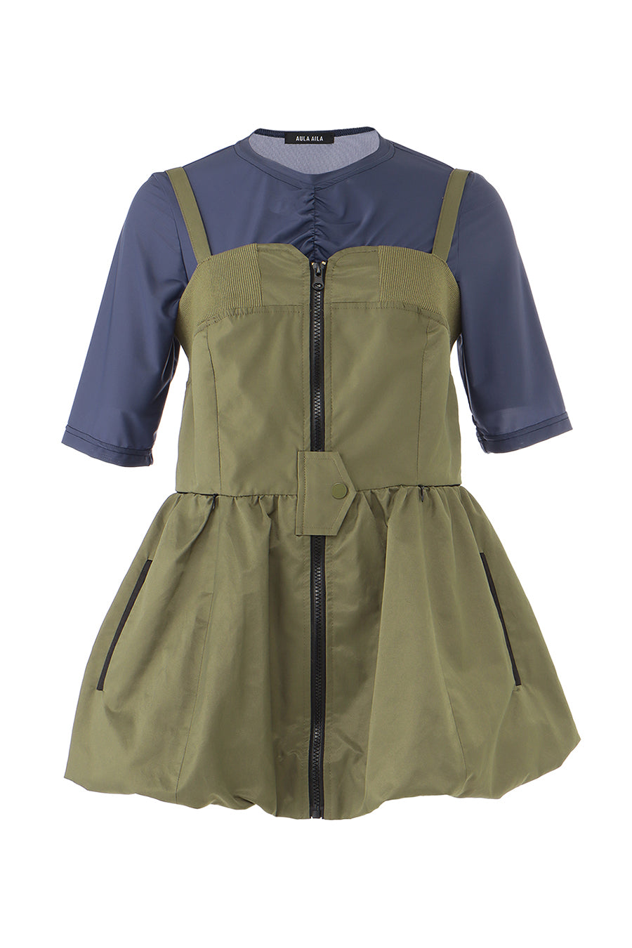上品な光沢としなやかなハリ感がある高密度ナイロンコットンツイル素材を使用。程よく広がるバルーンシルエットがレディライクな印象に。ヒップまわりもカバーしてスタイルアップ効果あり◎ バストの編立てリブはバストまわりをすっきりと見せて、体にフィットしてくれます。ウエスト切り替えのサイドファスナーはお好みの位置で開閉してスリットデザインをつくれます。インナートップスをのぞかせて抜け感のあるスタイリングもおすすめです。肩ヒモはアジャスターで長さ調節可能です。