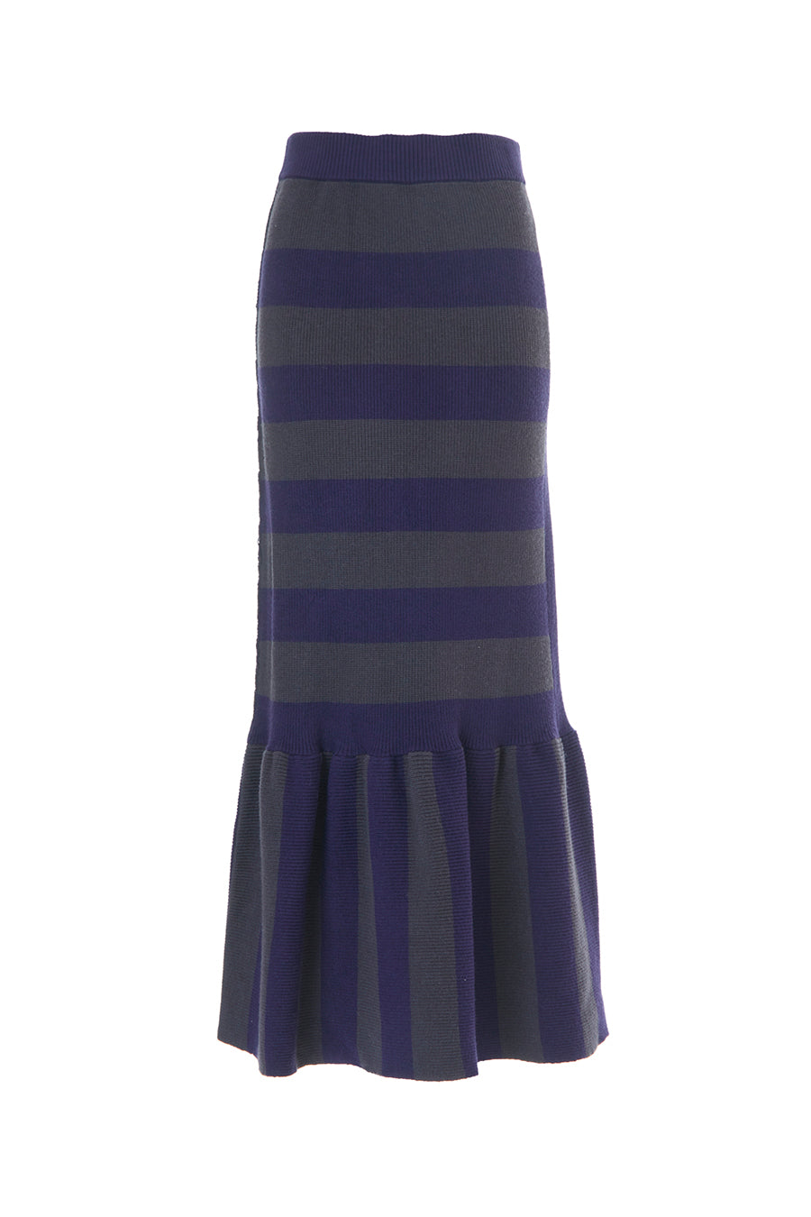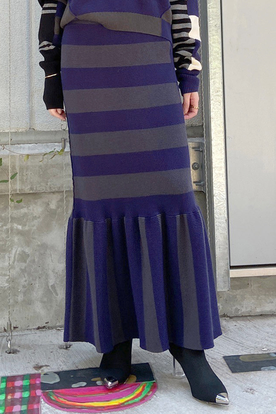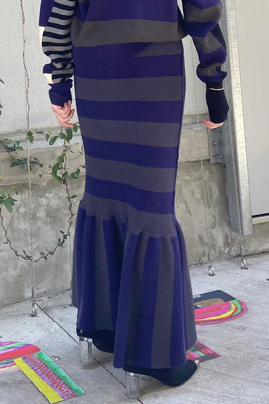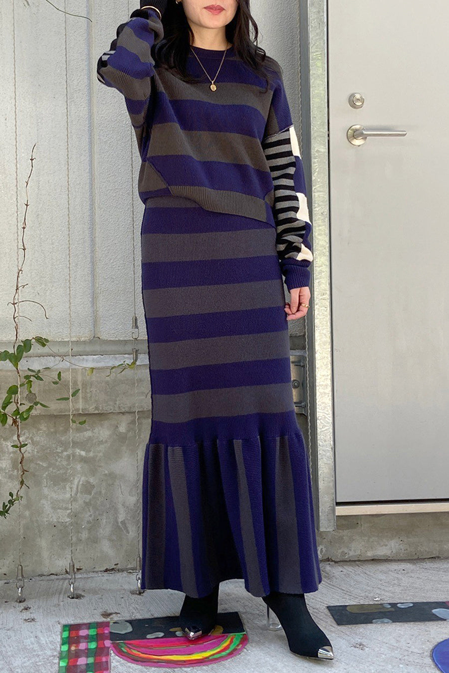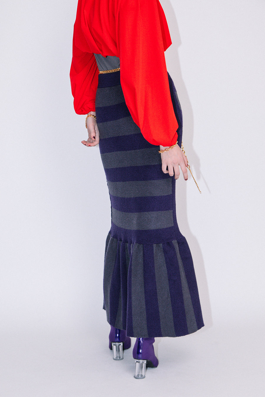 5cmピッチのテレコ中ボーダーを裾で切り替え、ギャザーを入れて膨らんだ、ペプラムラインニットスカート。