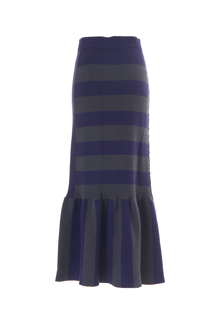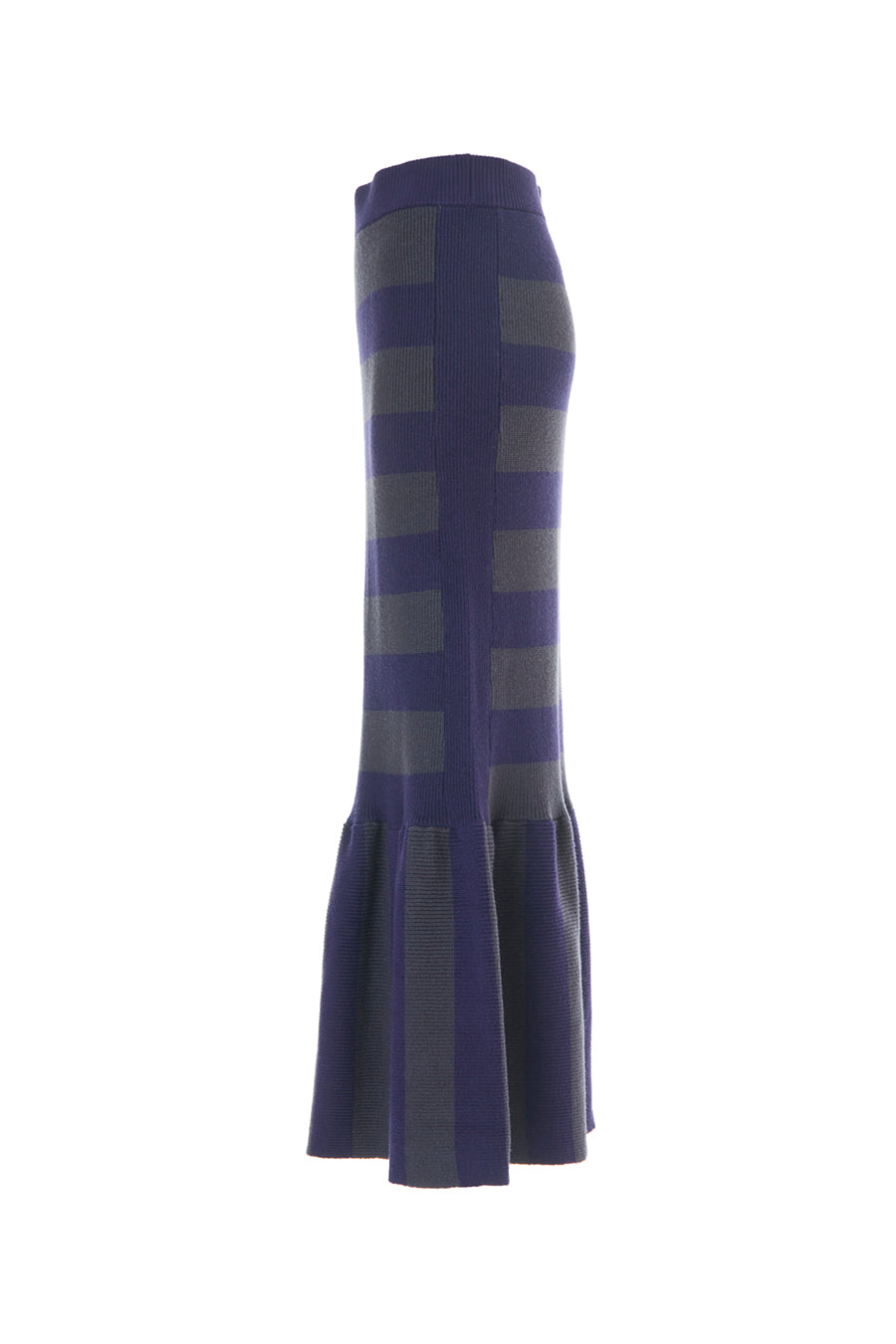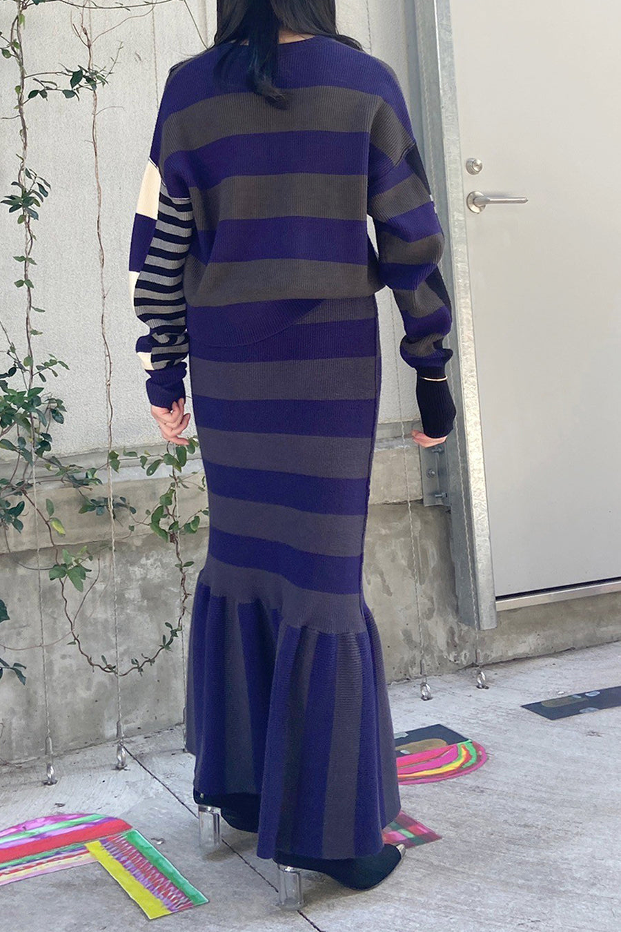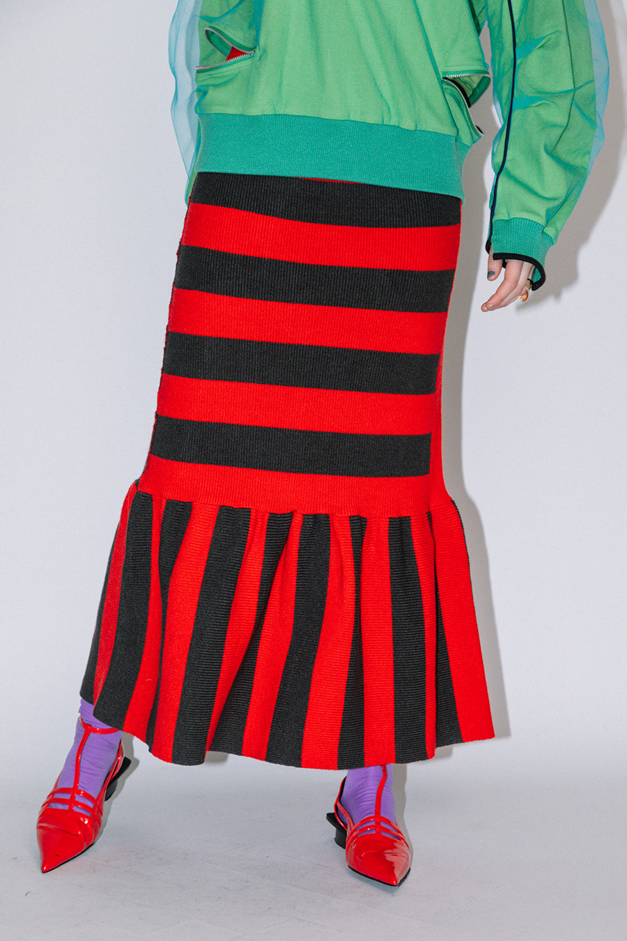 5cmピッチのテレコ中ボーダーを裾で切り替え、ギャザーを入れて膨らんだ、ペプラムラインニットスカート。