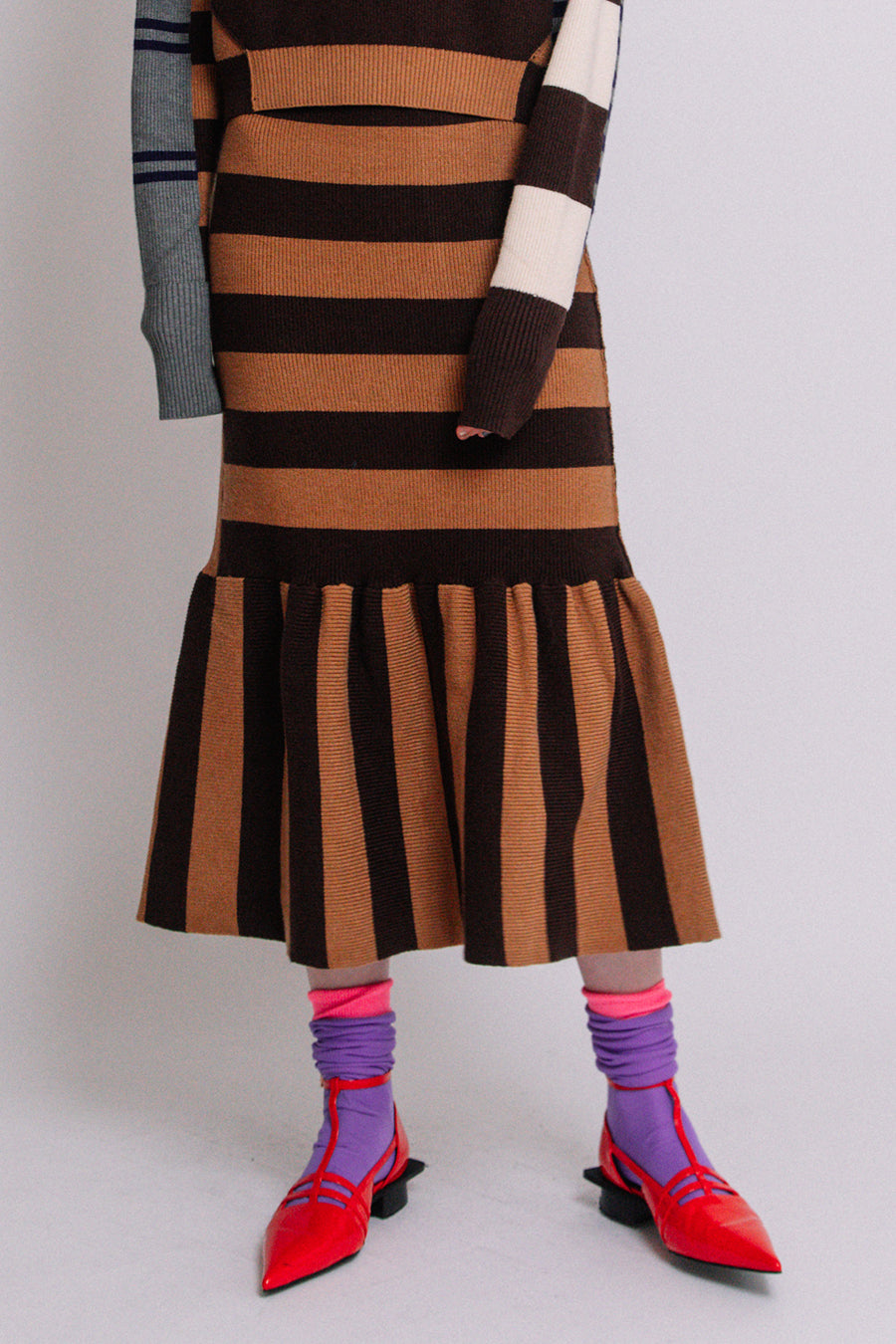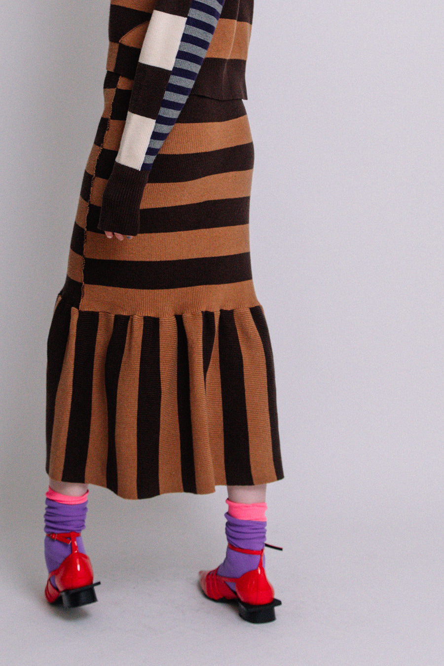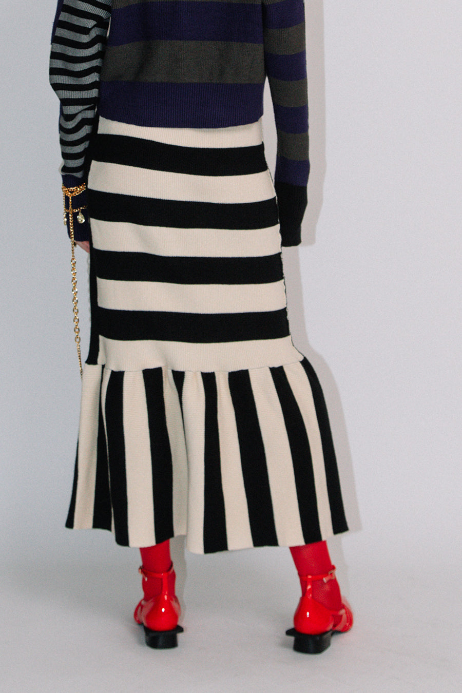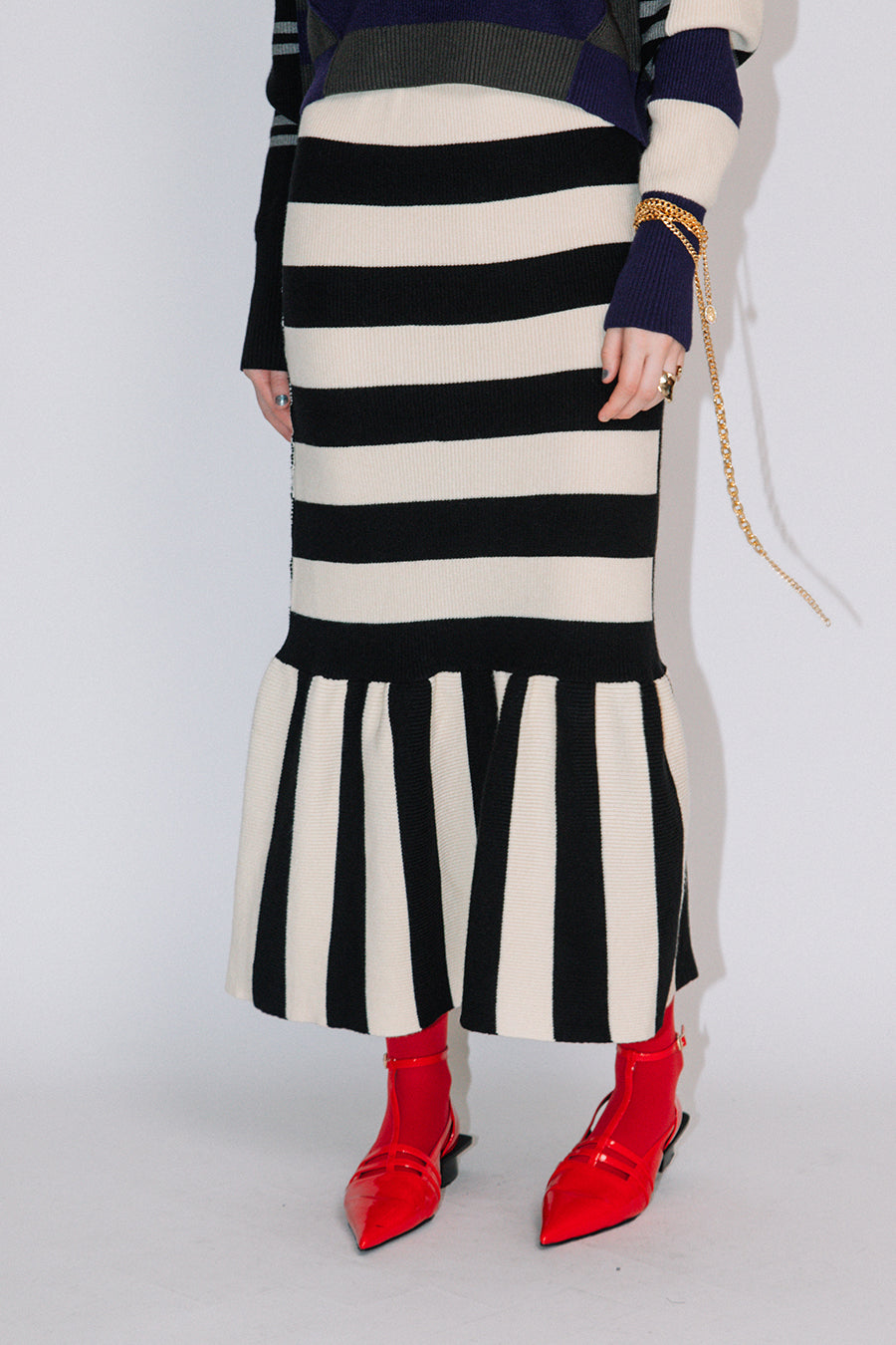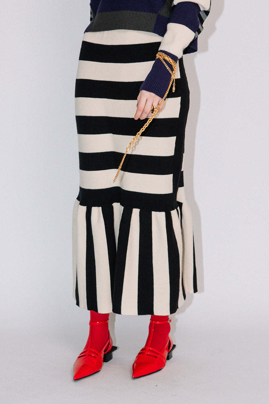 5cmピッチのテレコ中ボーダーを裾で切り替え、ギャザーを入れて膨らんだ、ペプラムラインニットスカート。