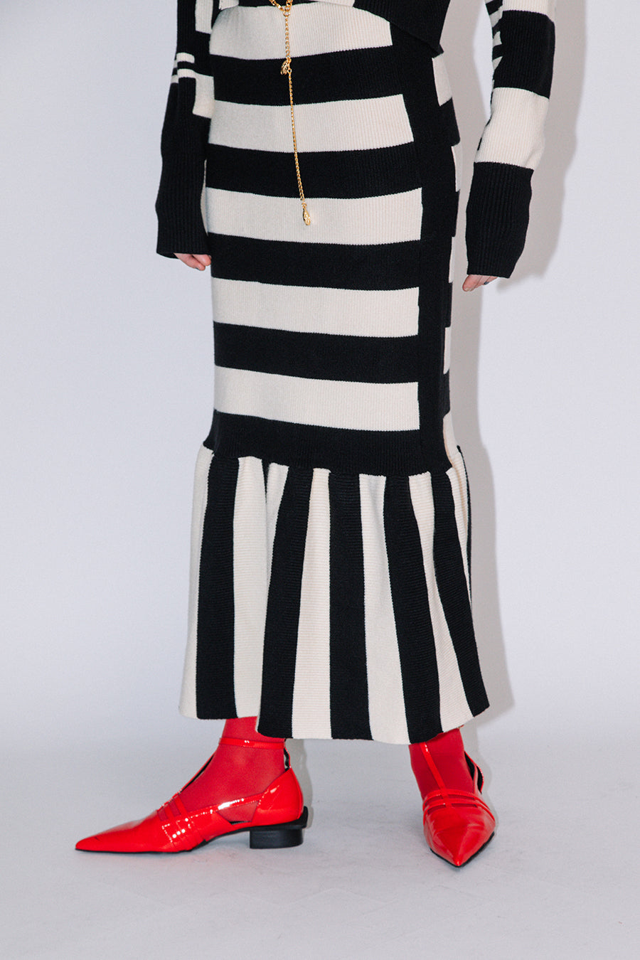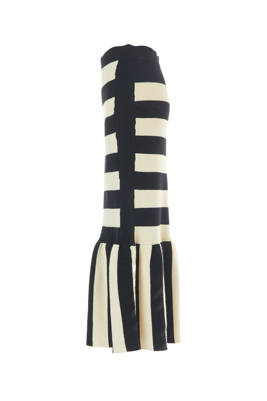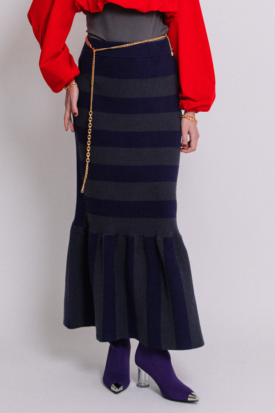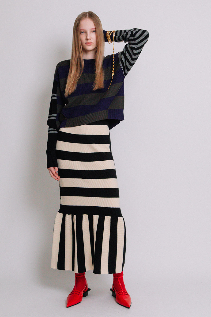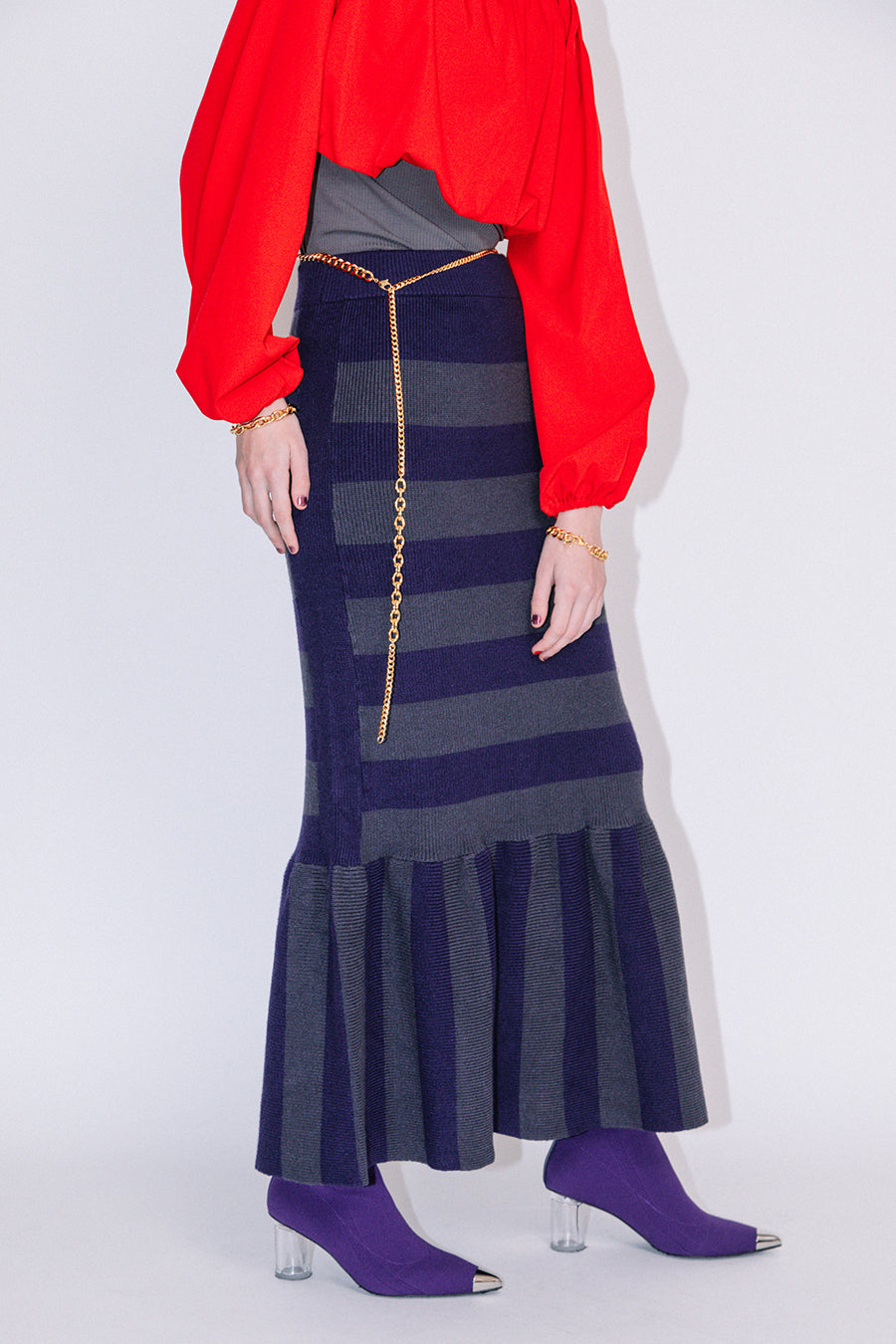 5cmピッチのテレコ中ボーダーを裾で切り替え、ギャザーを入れて膨らんだ、ペプラムラインニットスカート。