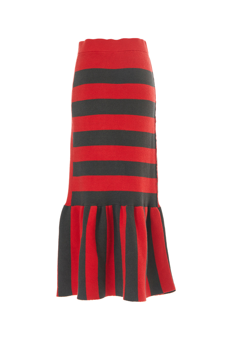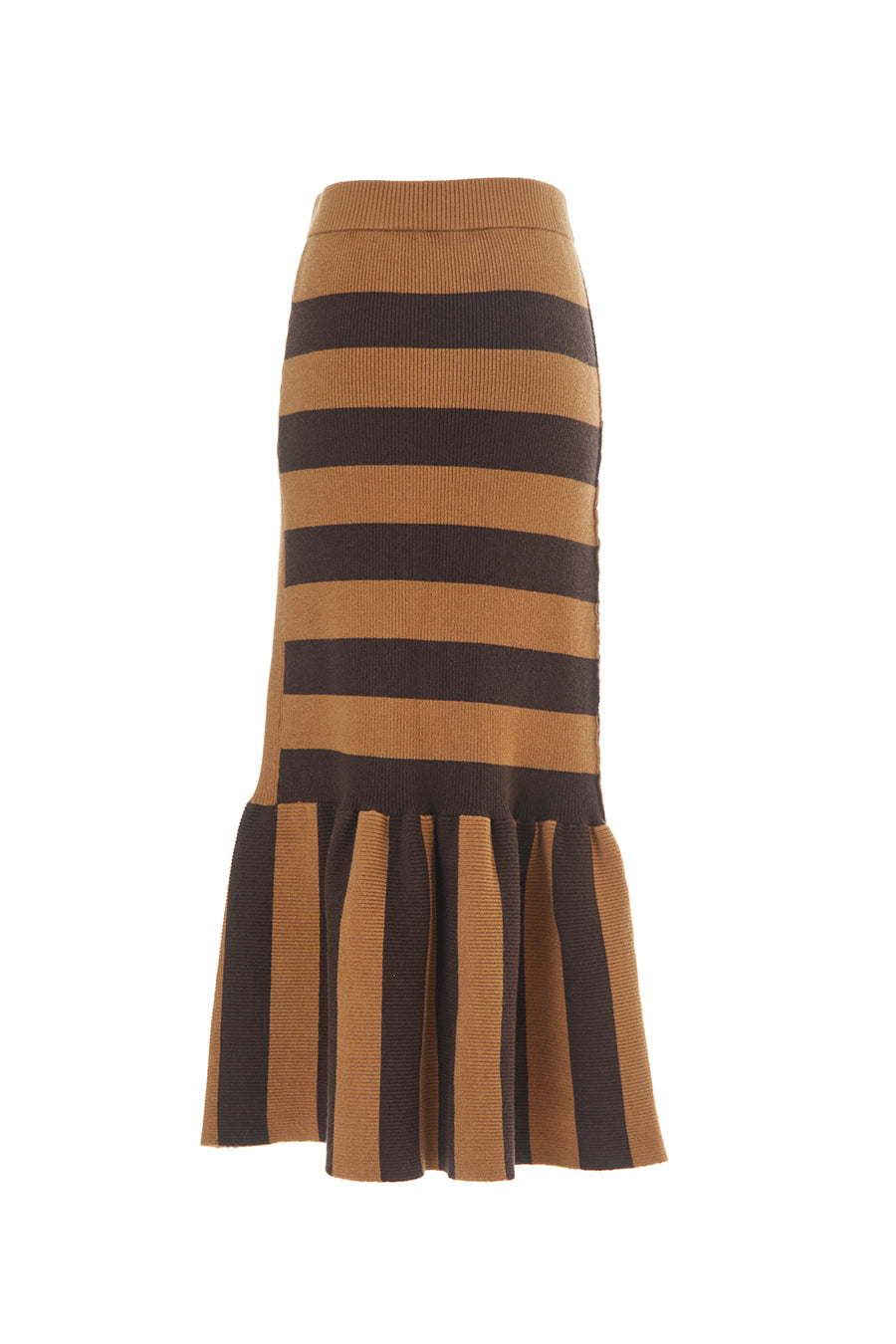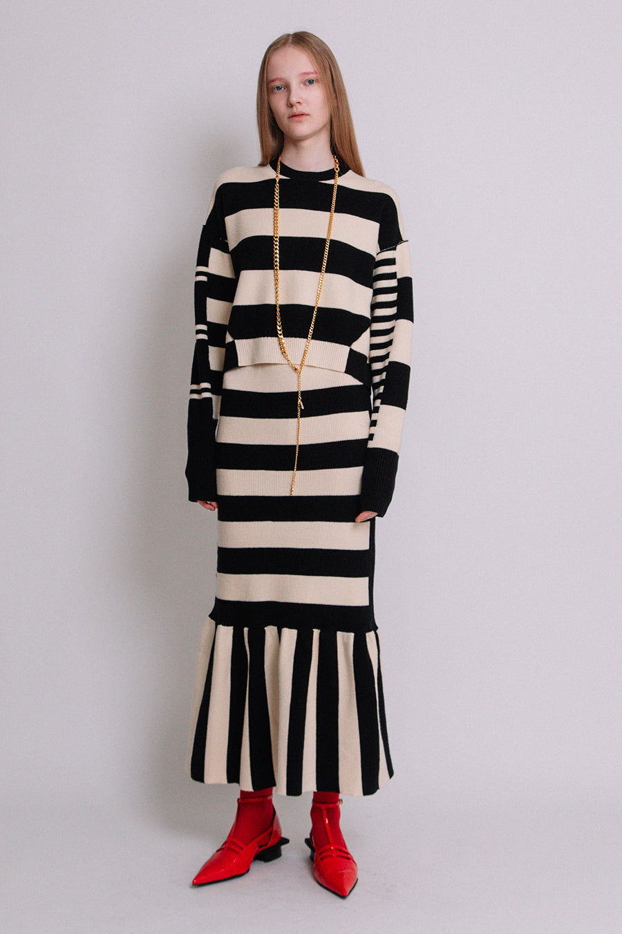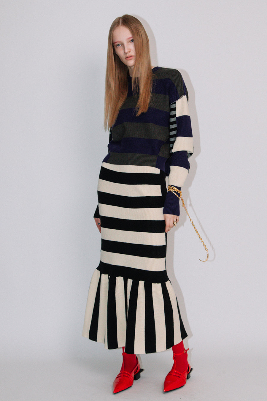 5cmピッチのテレコ中ボーダーを裾で切り替え、ギャザーを入れて膨らんだ、ペプラムラインニットスカート。
