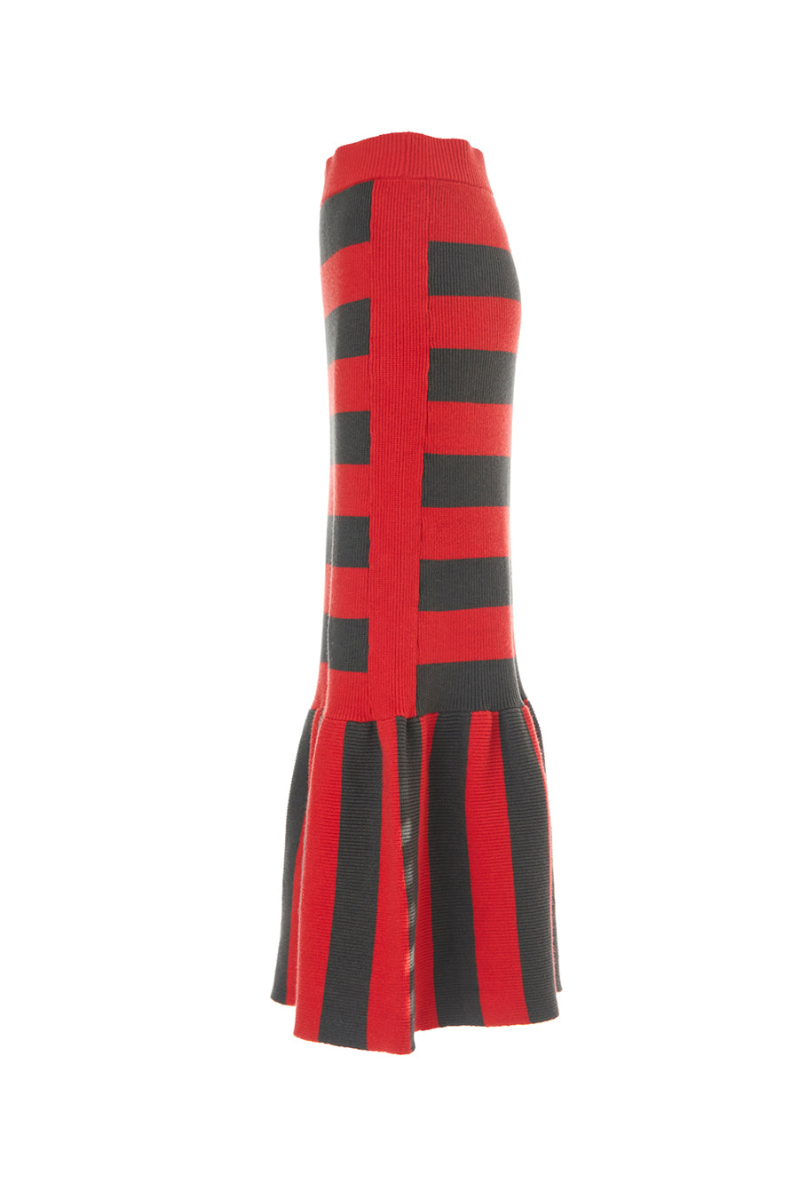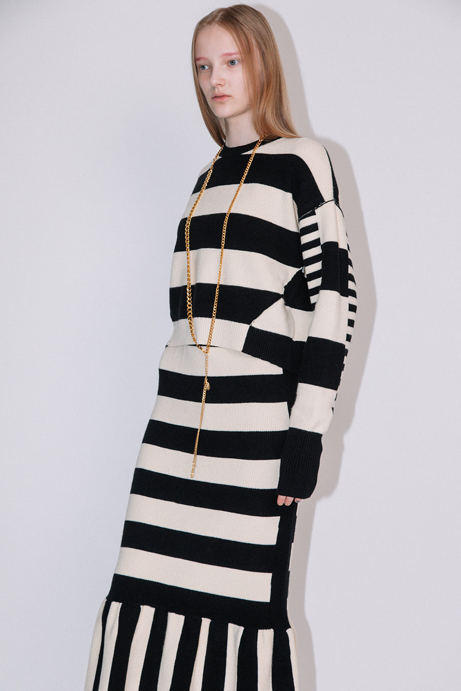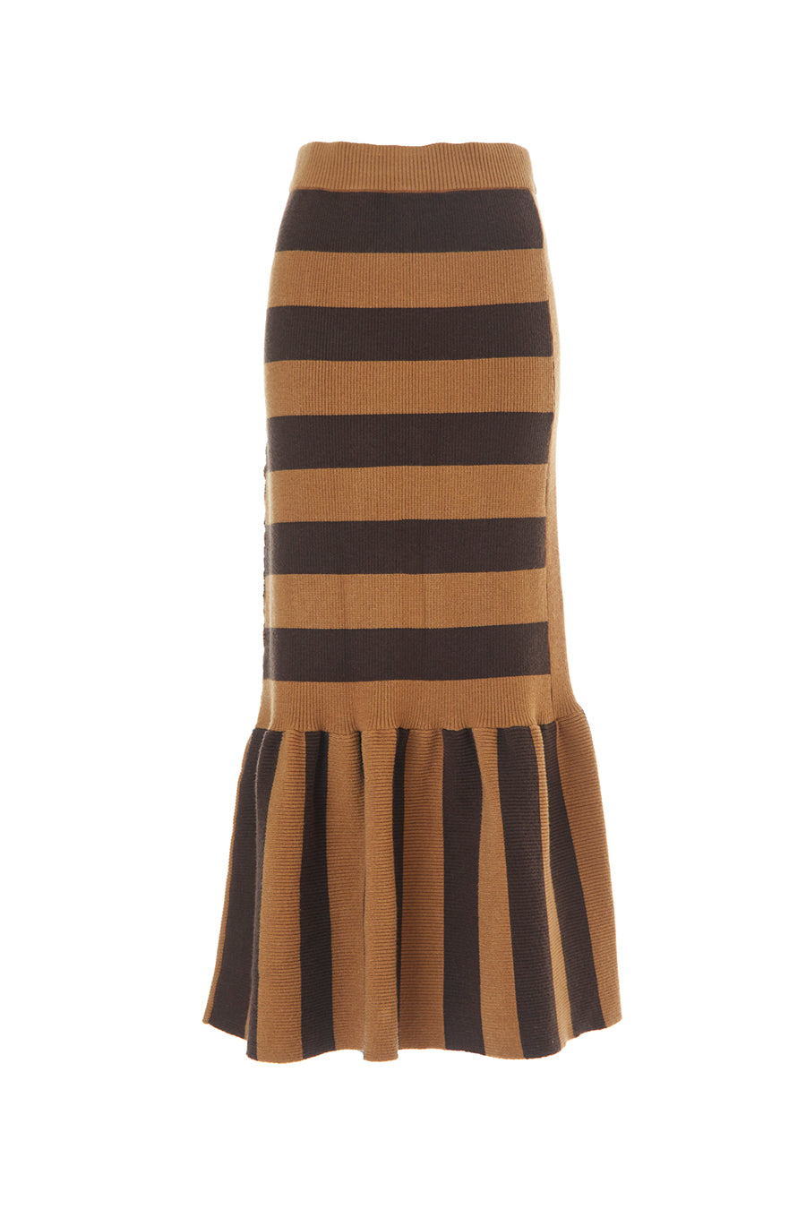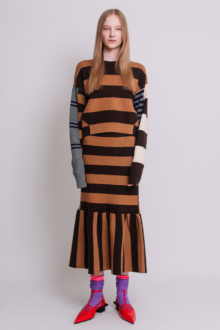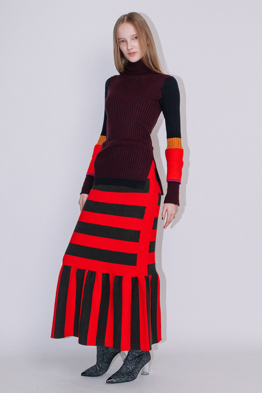 5cmピッチのテレコ中ボーダーを裾で切り替え、ギャザーを入れて膨らんだ、ペプラムラインニットスカート。