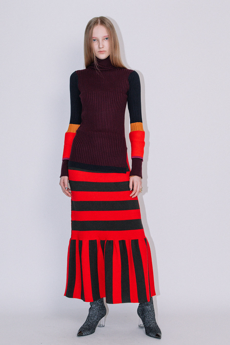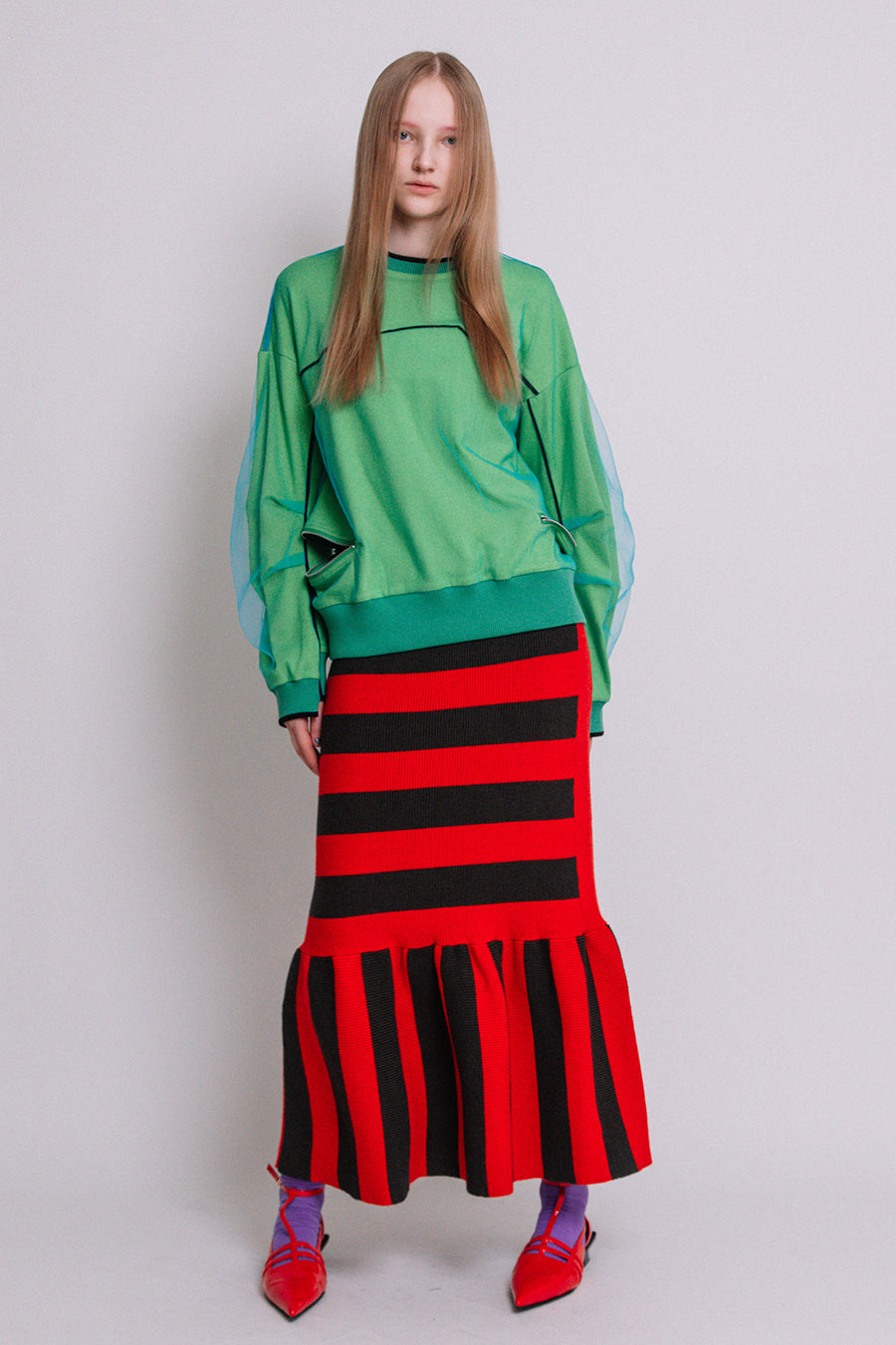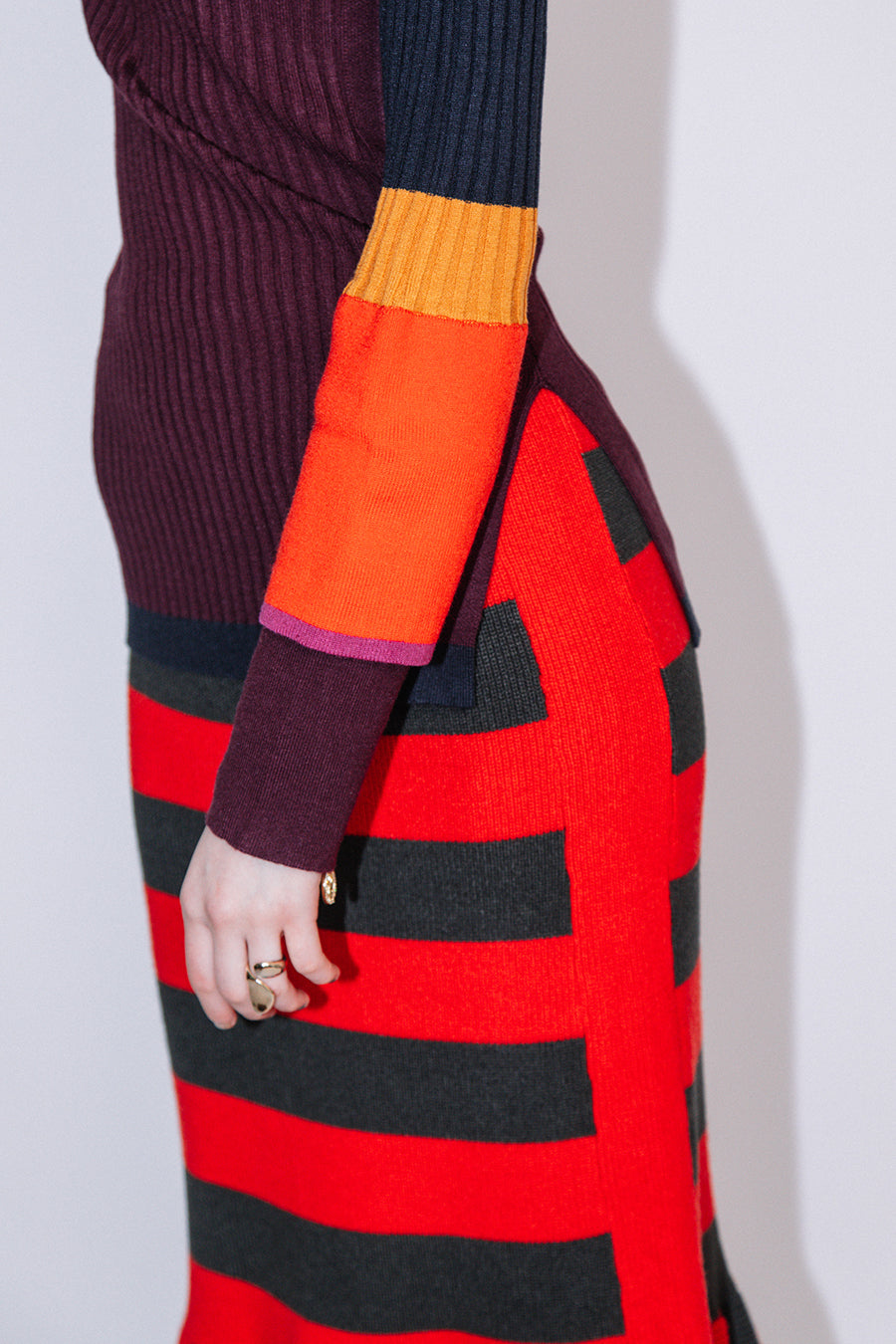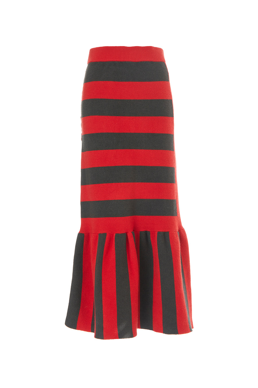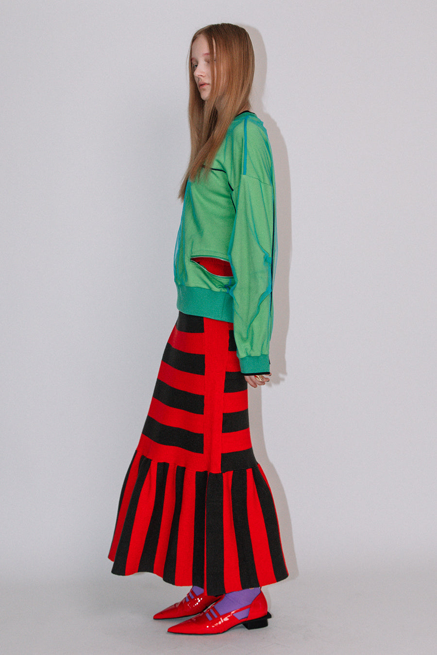 5cmピッチのテレコ中ボーダーを裾で切り替え、ギャザーを入れて膨らんだ、ペプラムラインニットスカート。