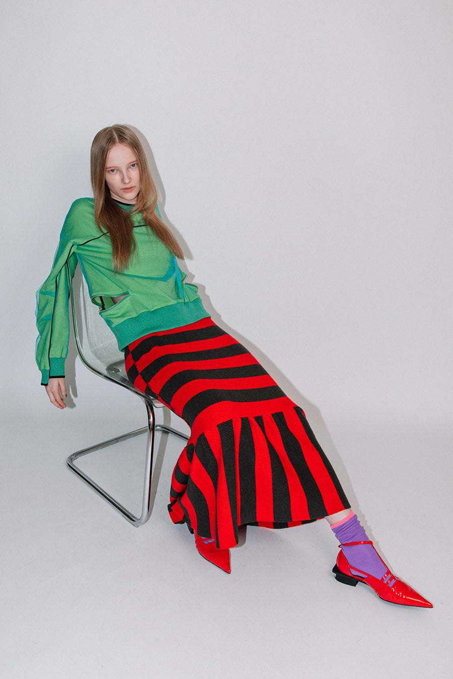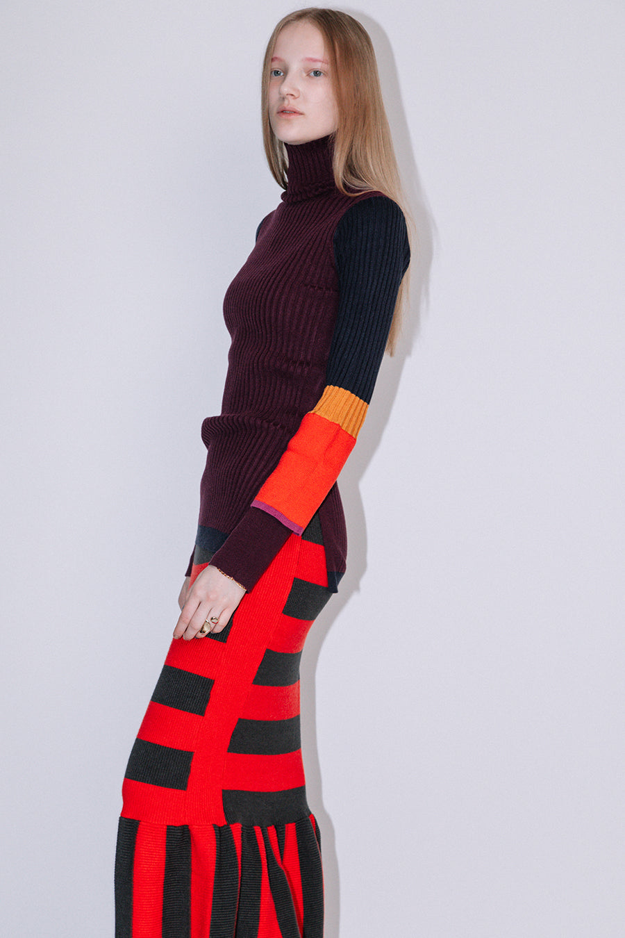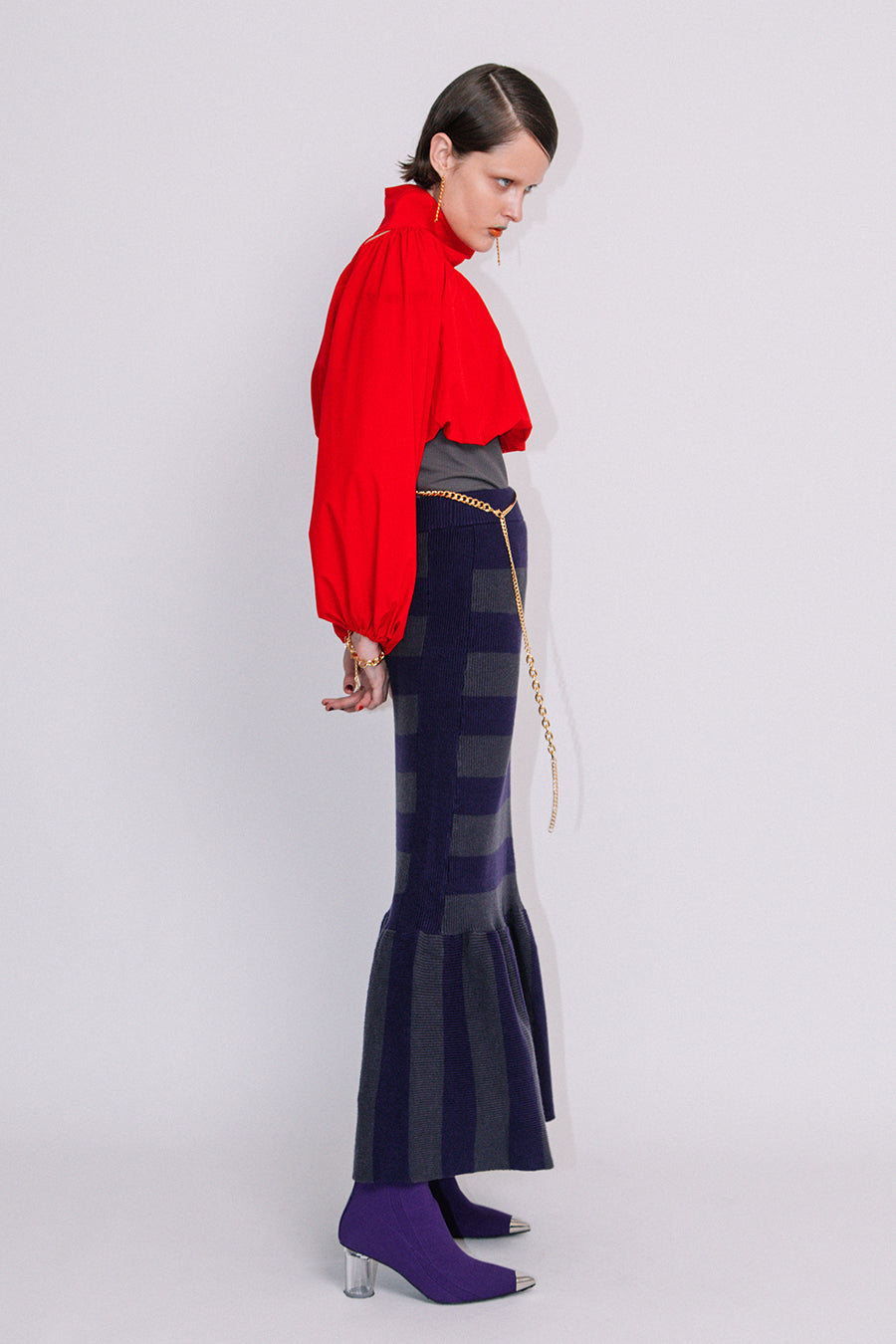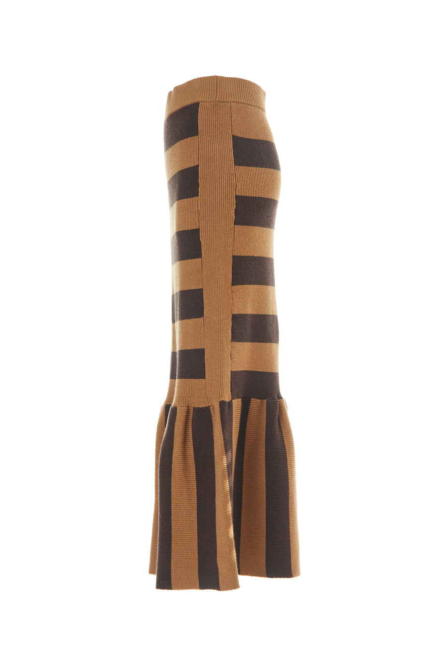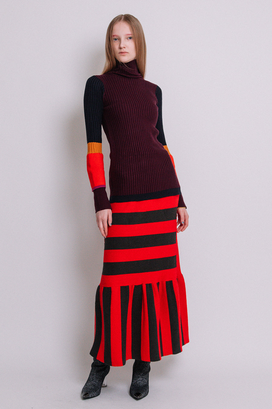 5cmピッチのテレコ中ボーダーを裾で切り替え、ギャザーを入れて膨らんだ、ペプラムラインニットスカート。