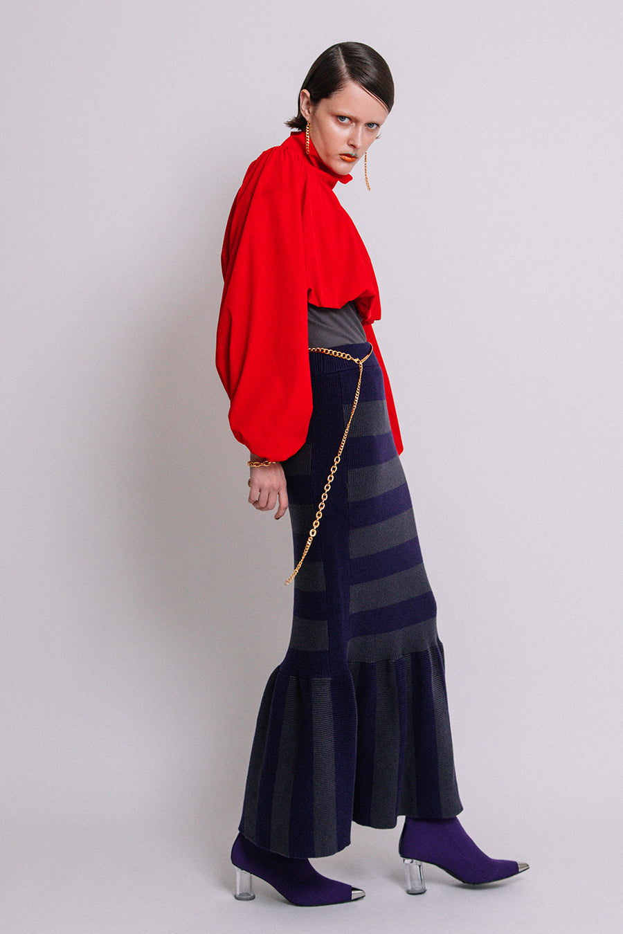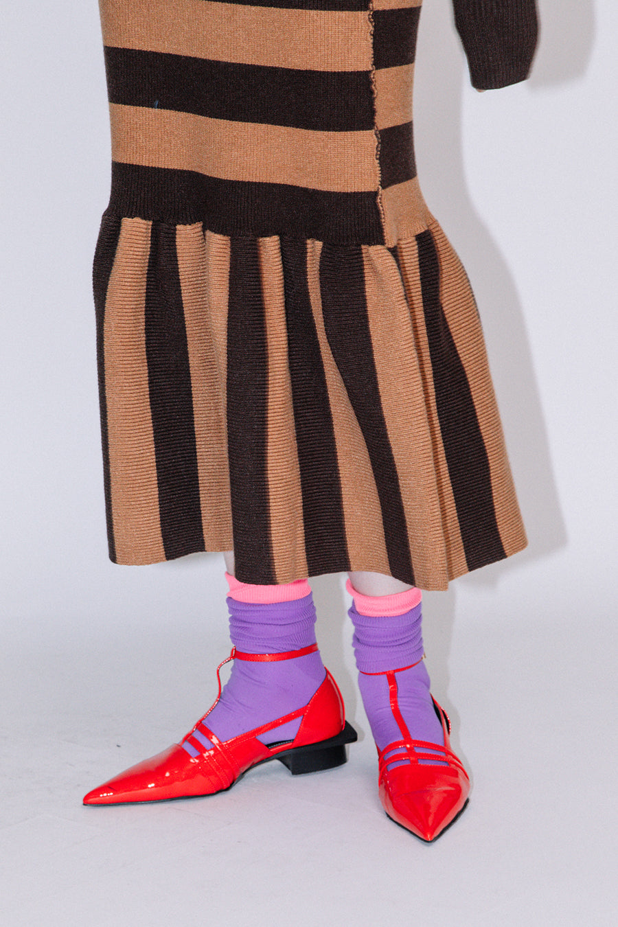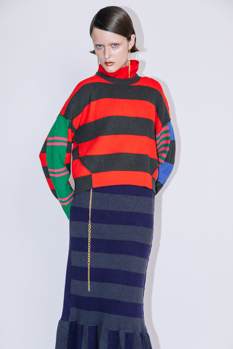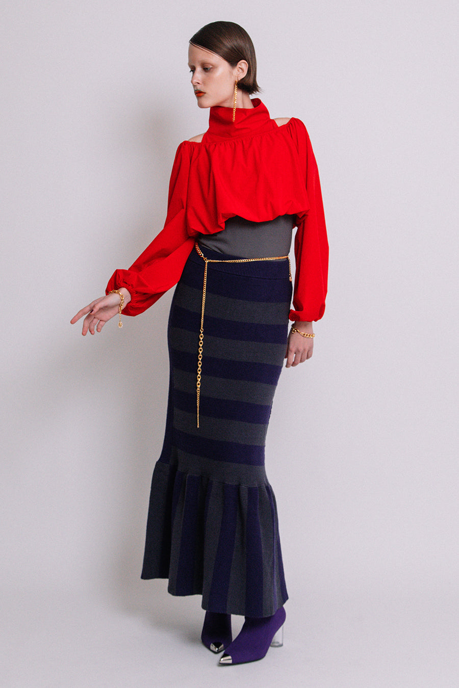 5cmピッチのテレコ中ボーダーを裾で切り替え、ギャザーを入れて膨らんだ、ペプラムラインニットスカート。