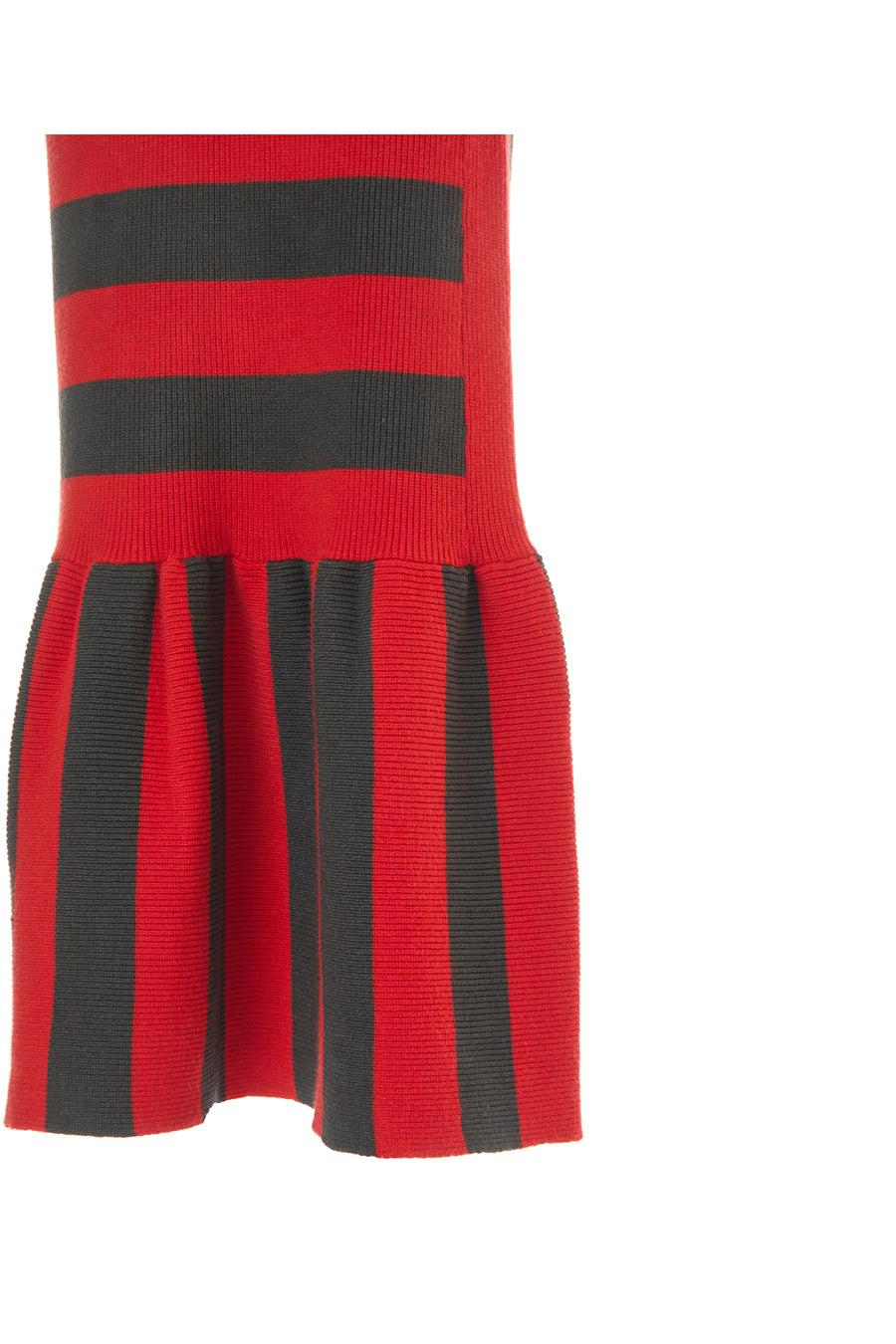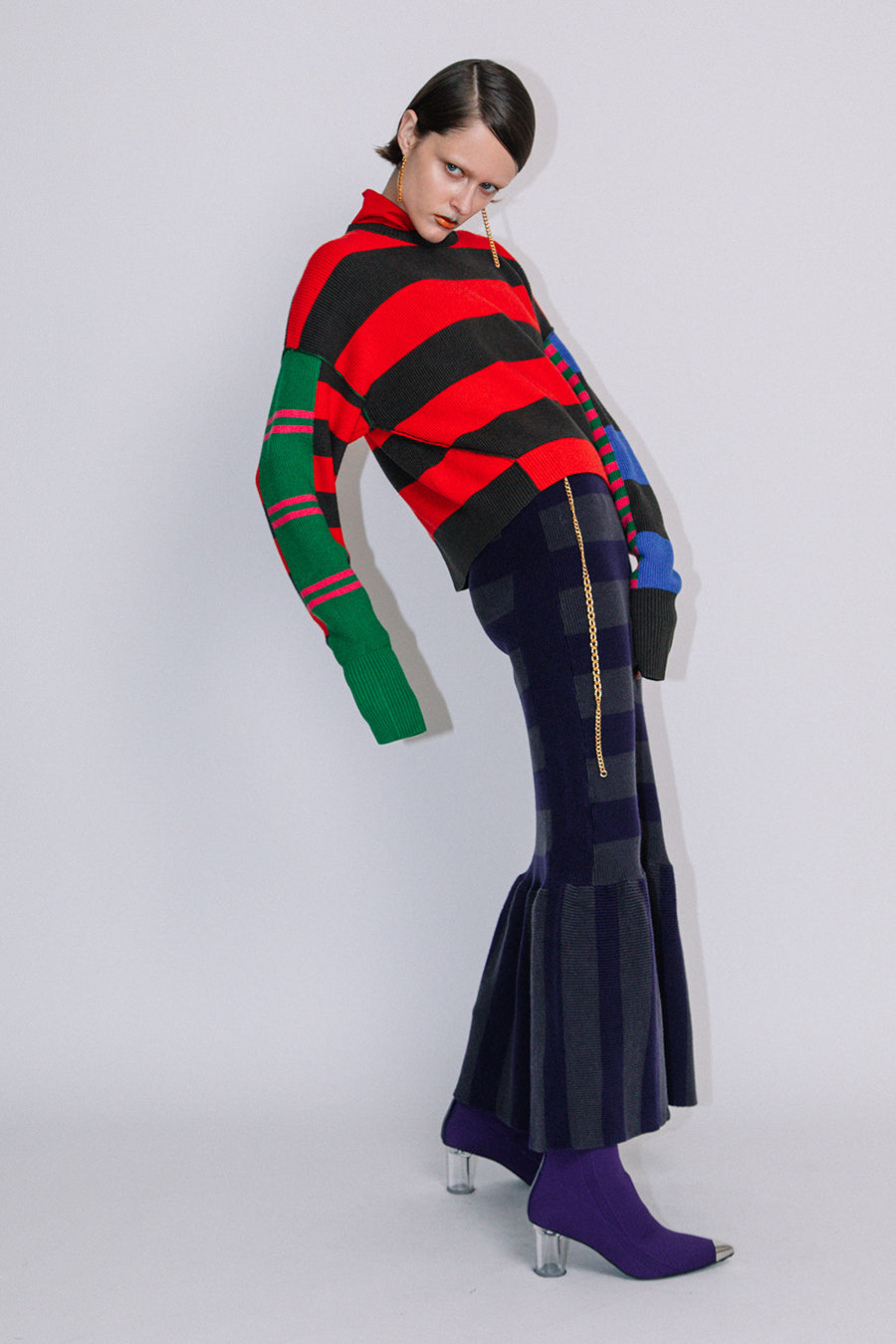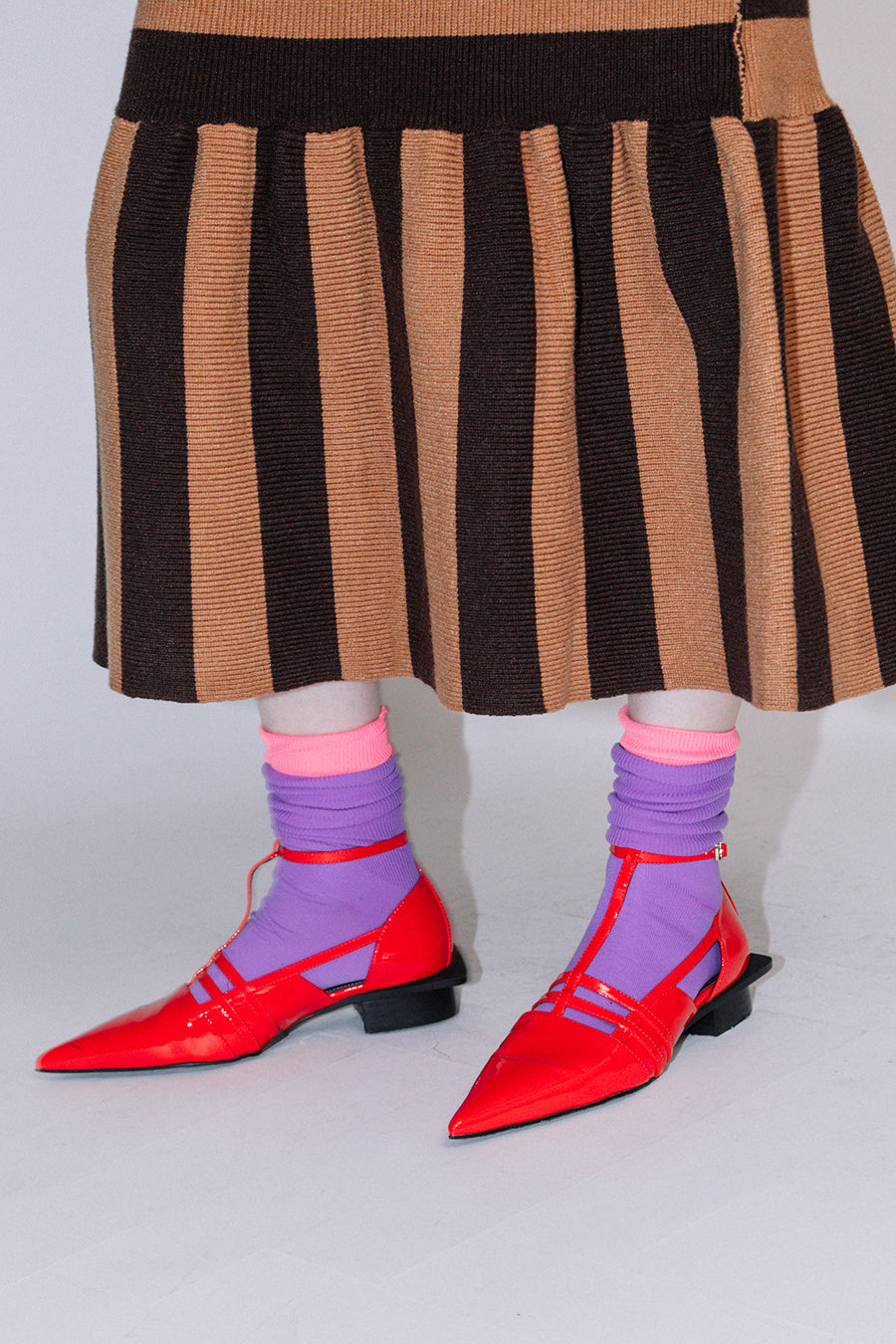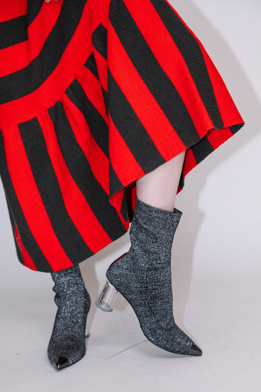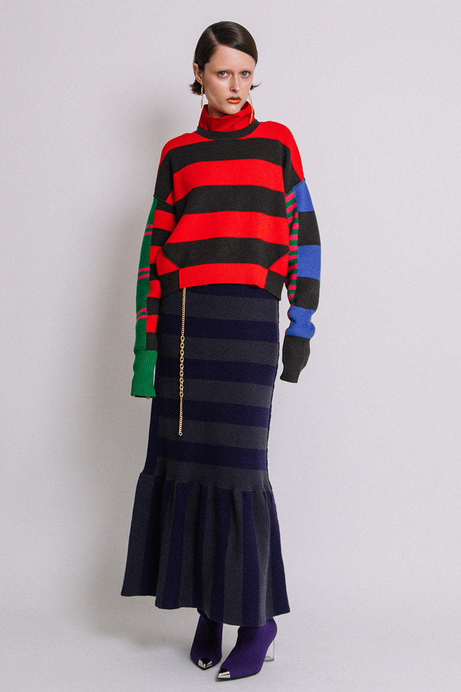 5cmピッチのテレコ中ボーダーを裾で切り替え、ギャザーを入れて膨らんだ、ペプラムラインニットスカート。