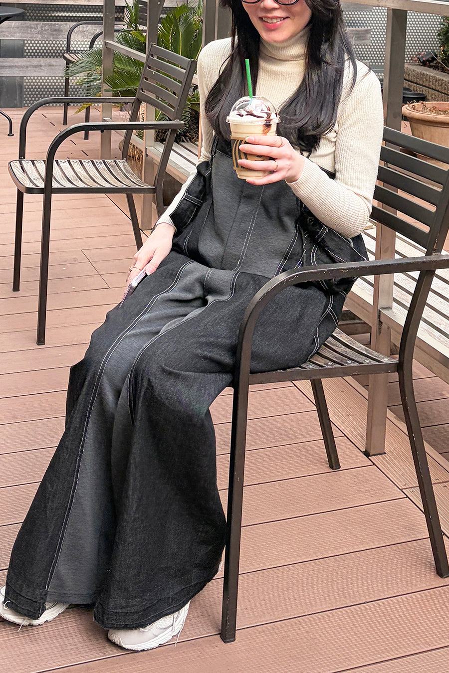 左右に更にデニムパンツを重ねたようなデザインのリメイク風サロペット。