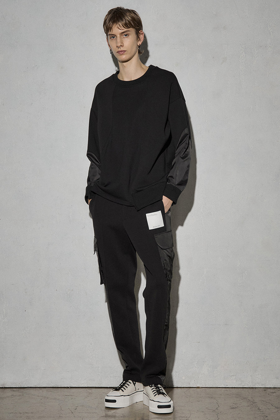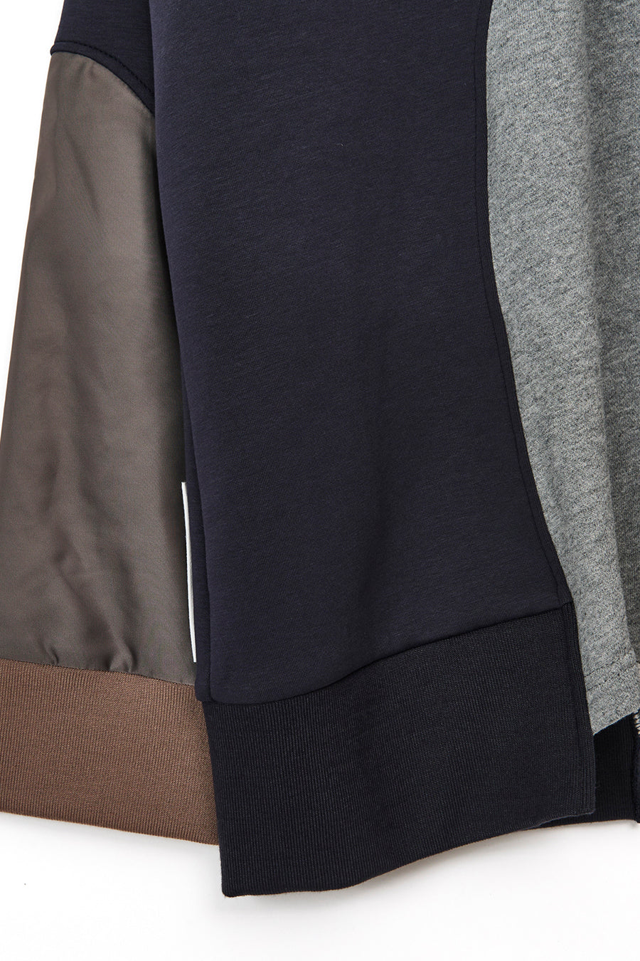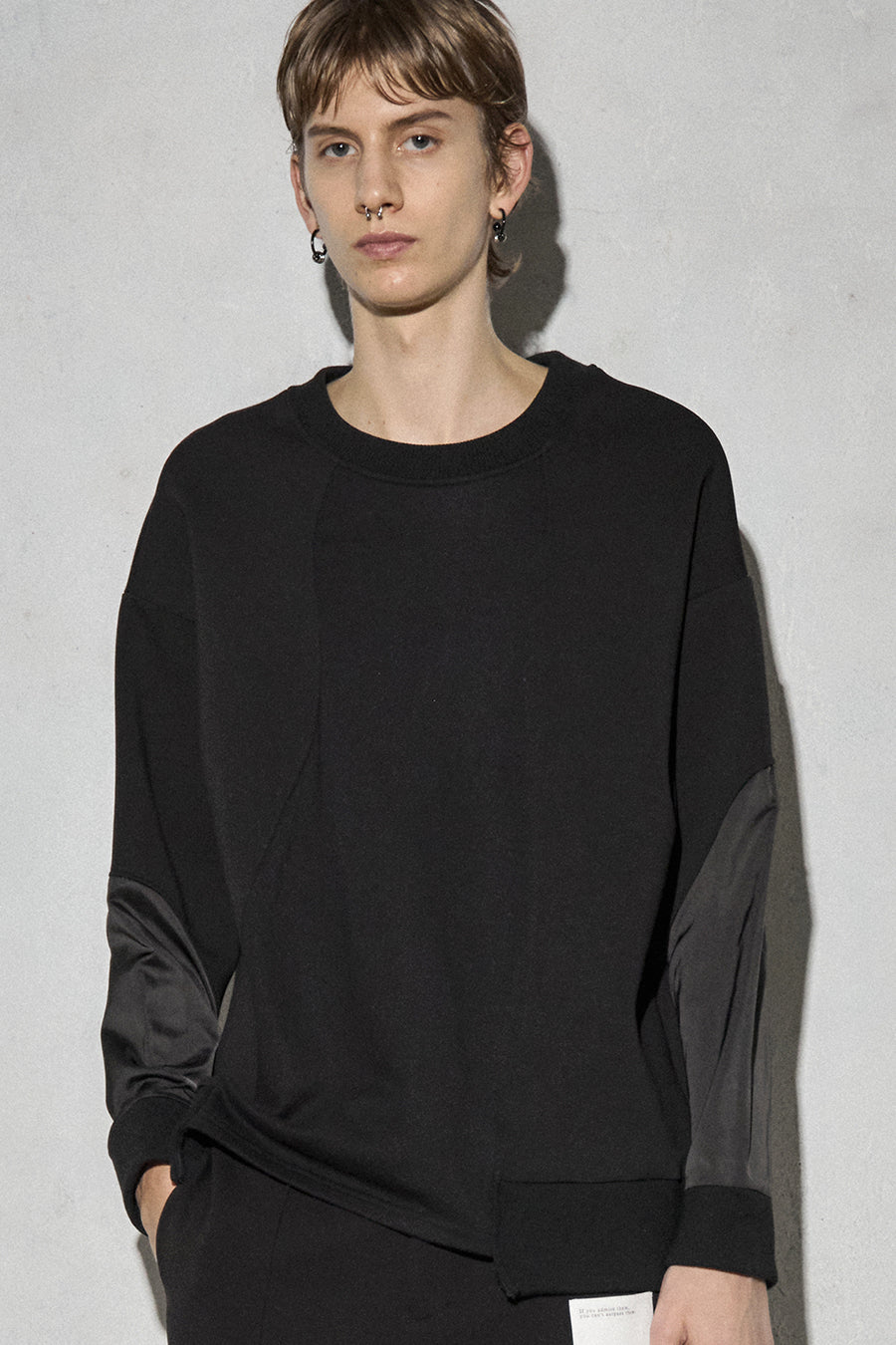 ナイロン、裏毛、ダンボールニットの異素材を組み合わせたプルオーバー。
