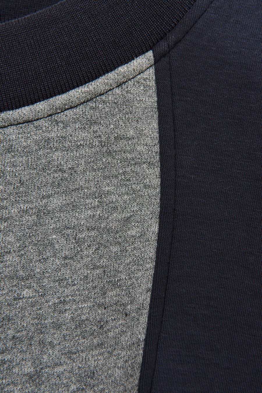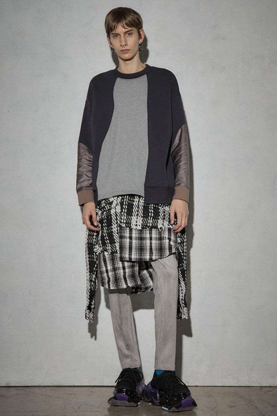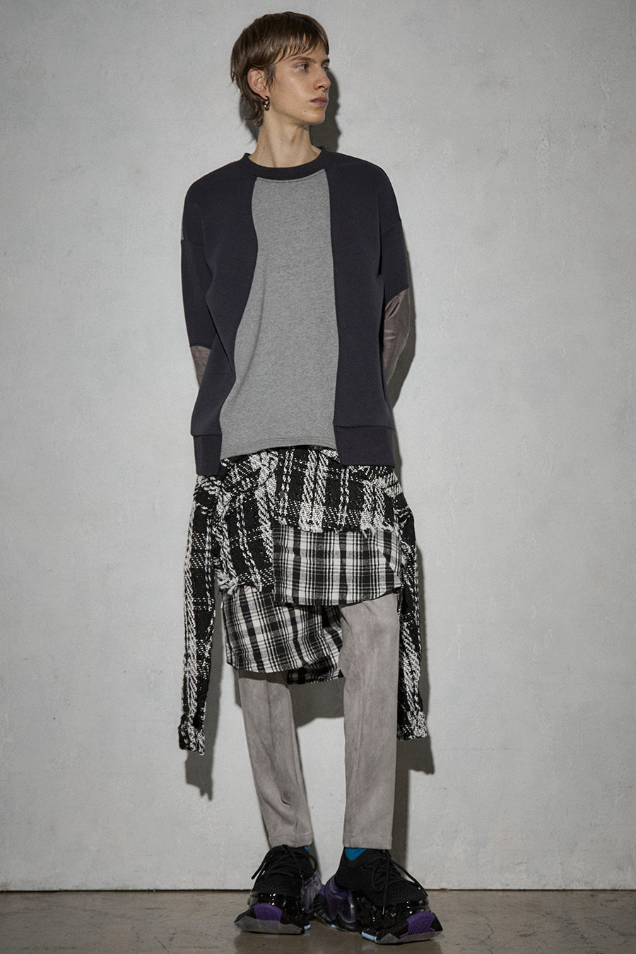 ナイロン、裏毛、ダンボールニットの異素材を組み合わせたプルオーバー。