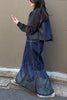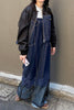 ストレッチ性のあるデニムと裾のパーツレースをコンビネーションしたIラインジャンパースカート。
