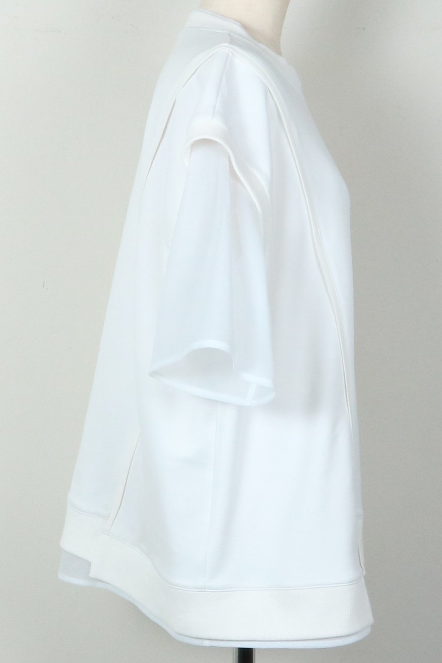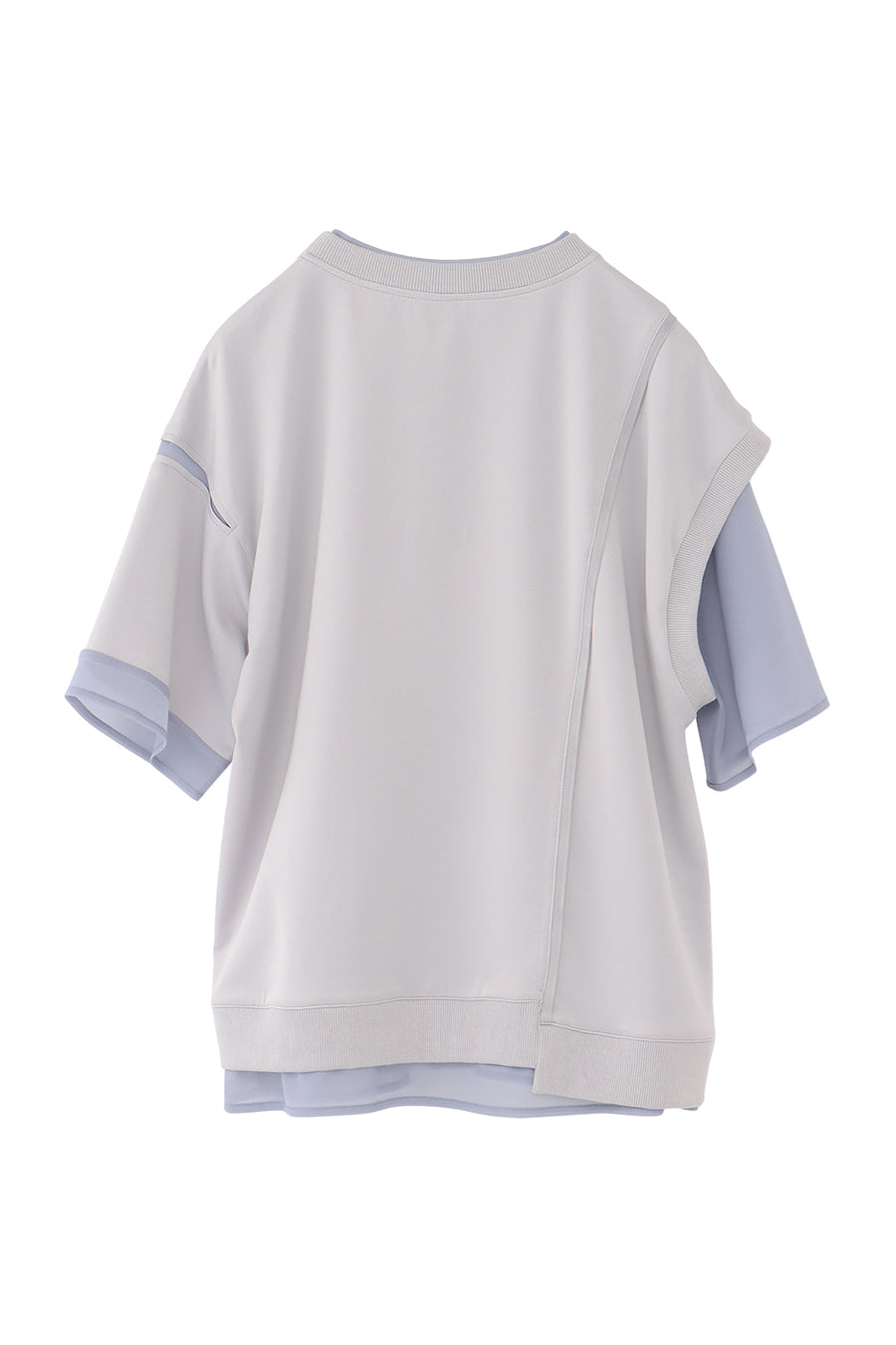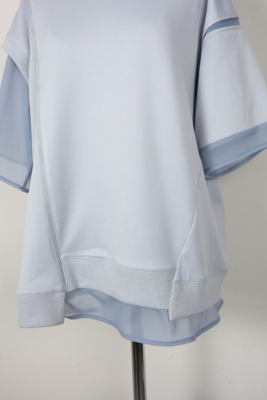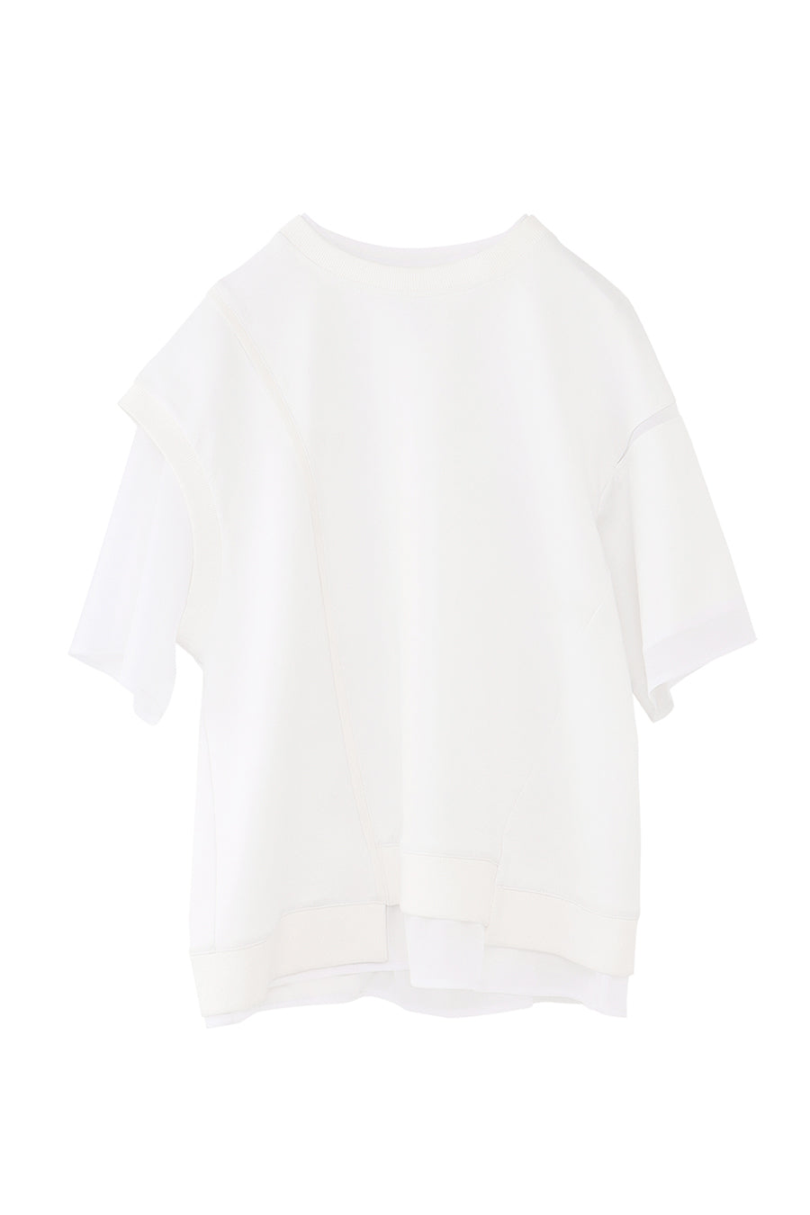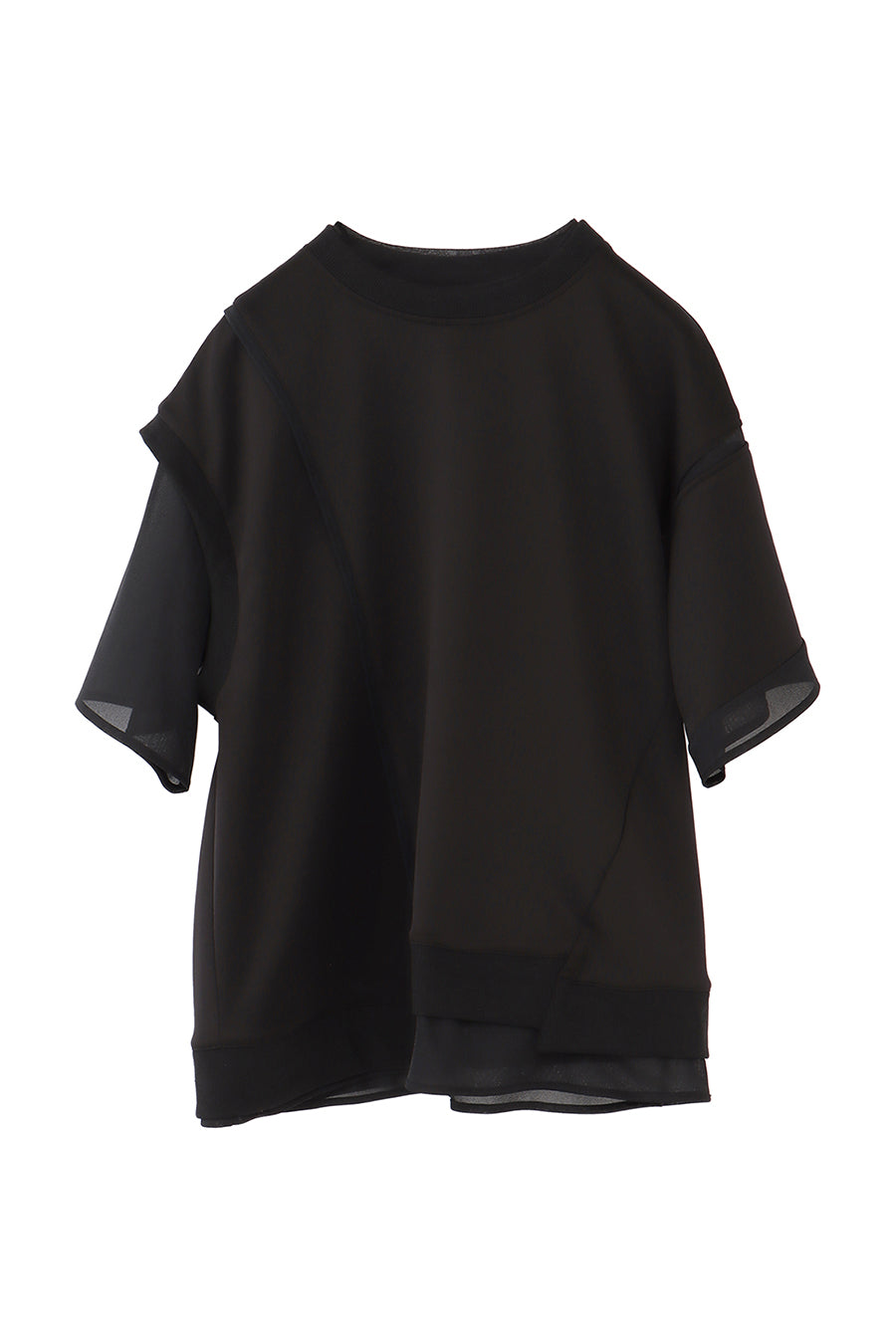 綺麗な表面感のスムースと透け感のあるカットソー素材のオーガンジーをコンビネーションしたアシンメトリーTシャツ。