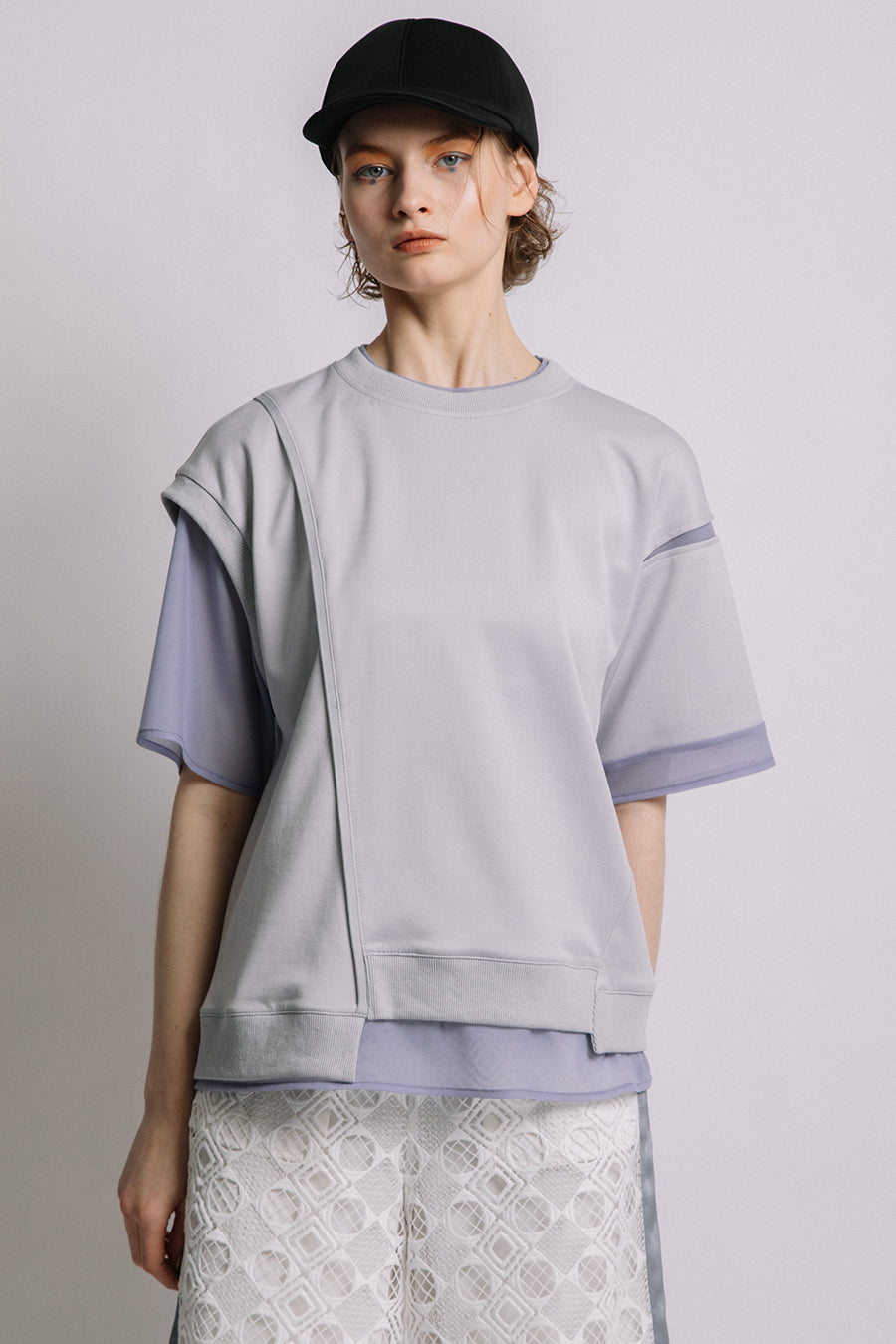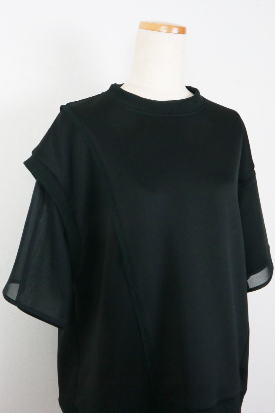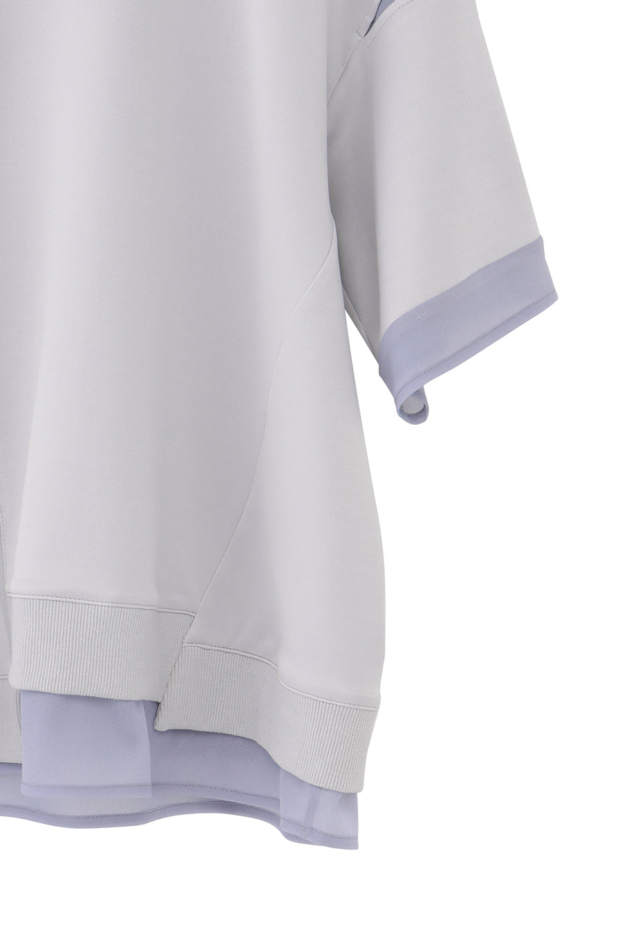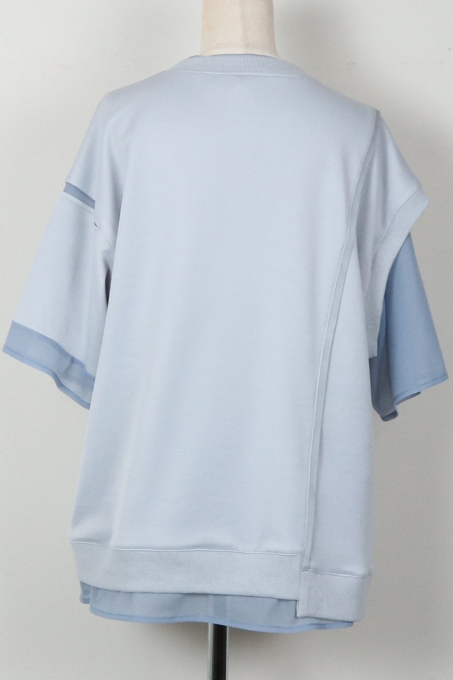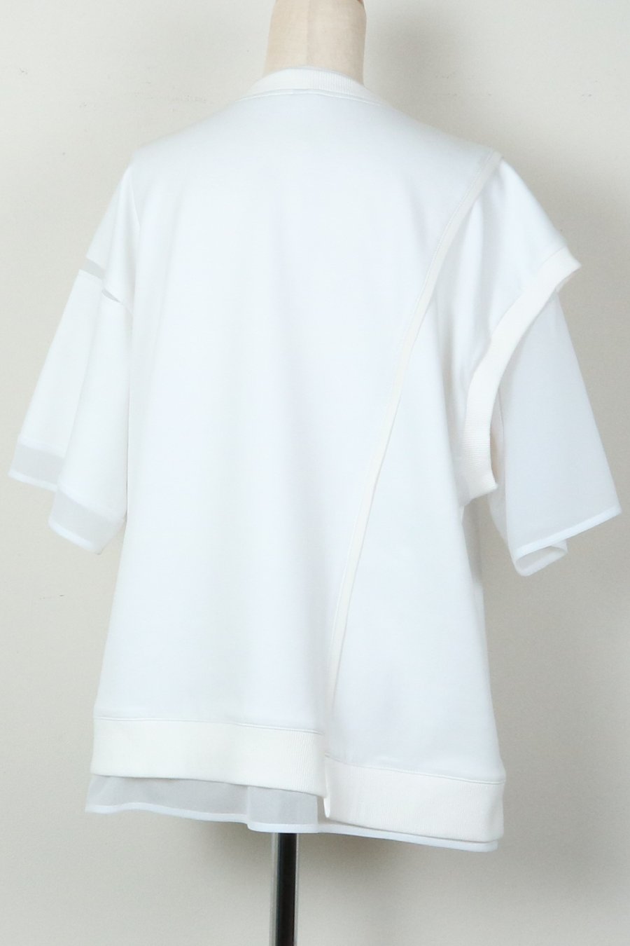 綺麗な表面感のスムースと透け感のあるカットソー素材のオーガンジーをコンビネーションしたアシンメトリーTシャツ。