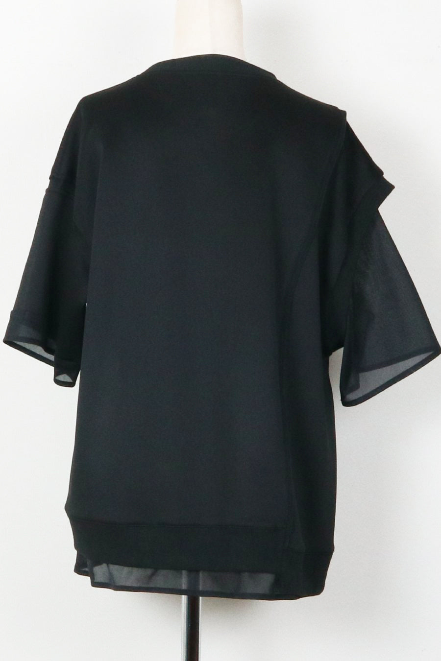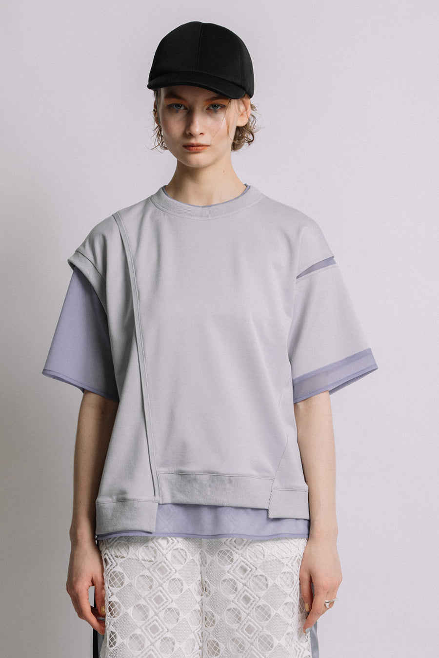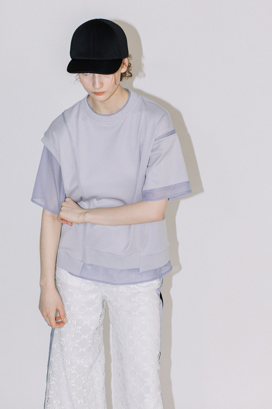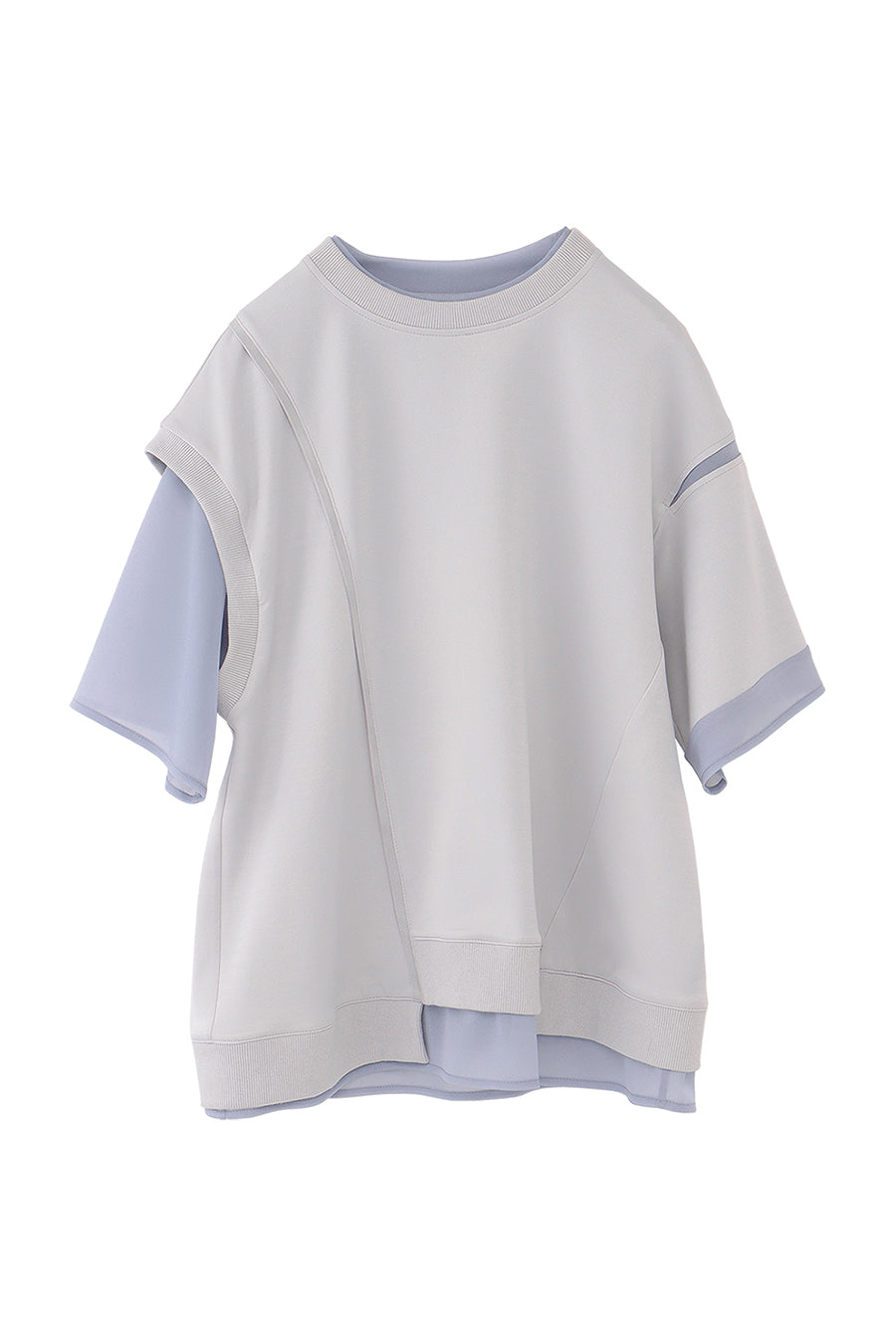 綺麗な表面感のスムースと透け感のあるカットソー素材のオーガンジーをコンビネーションしたアシンメトリーTシャツ。