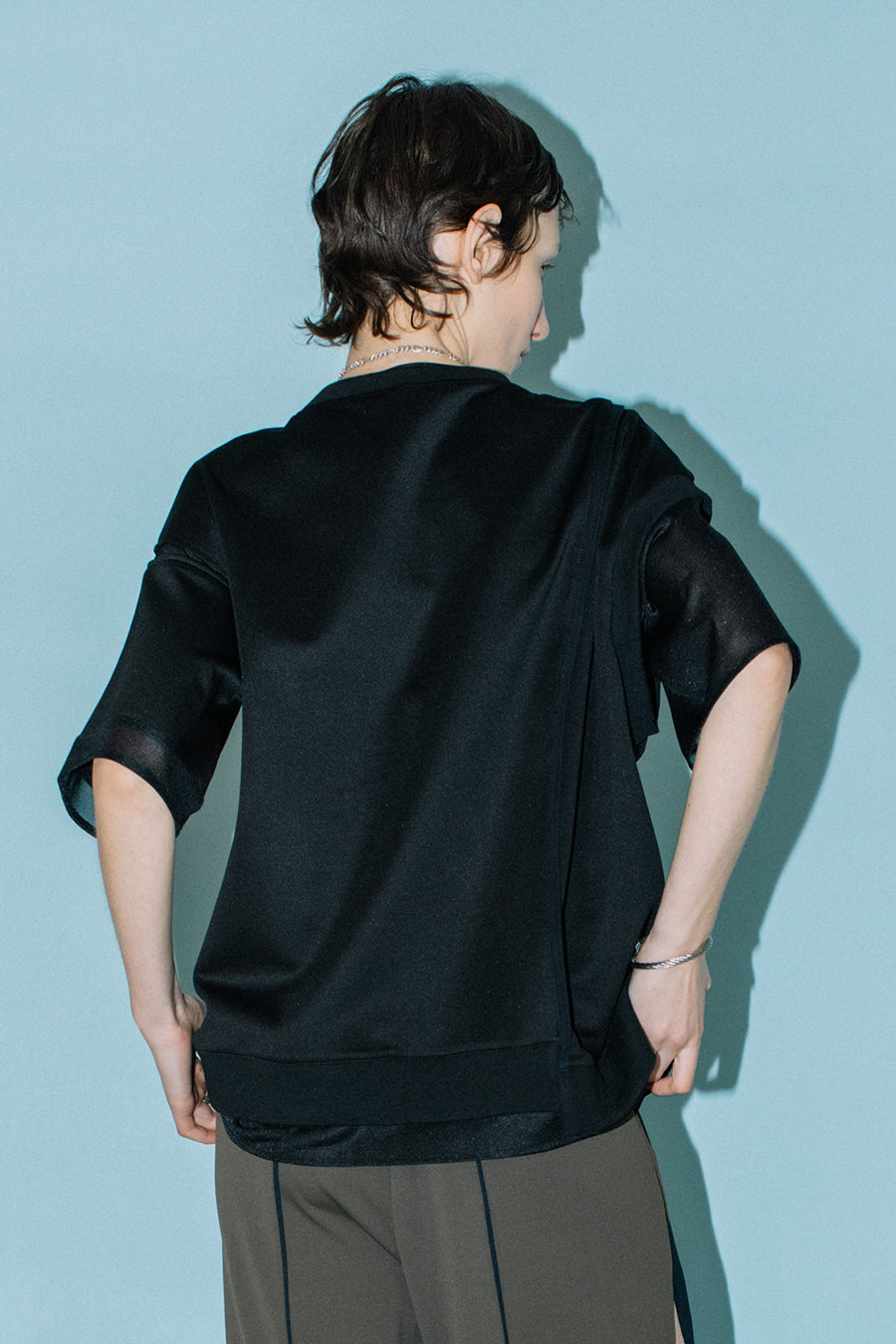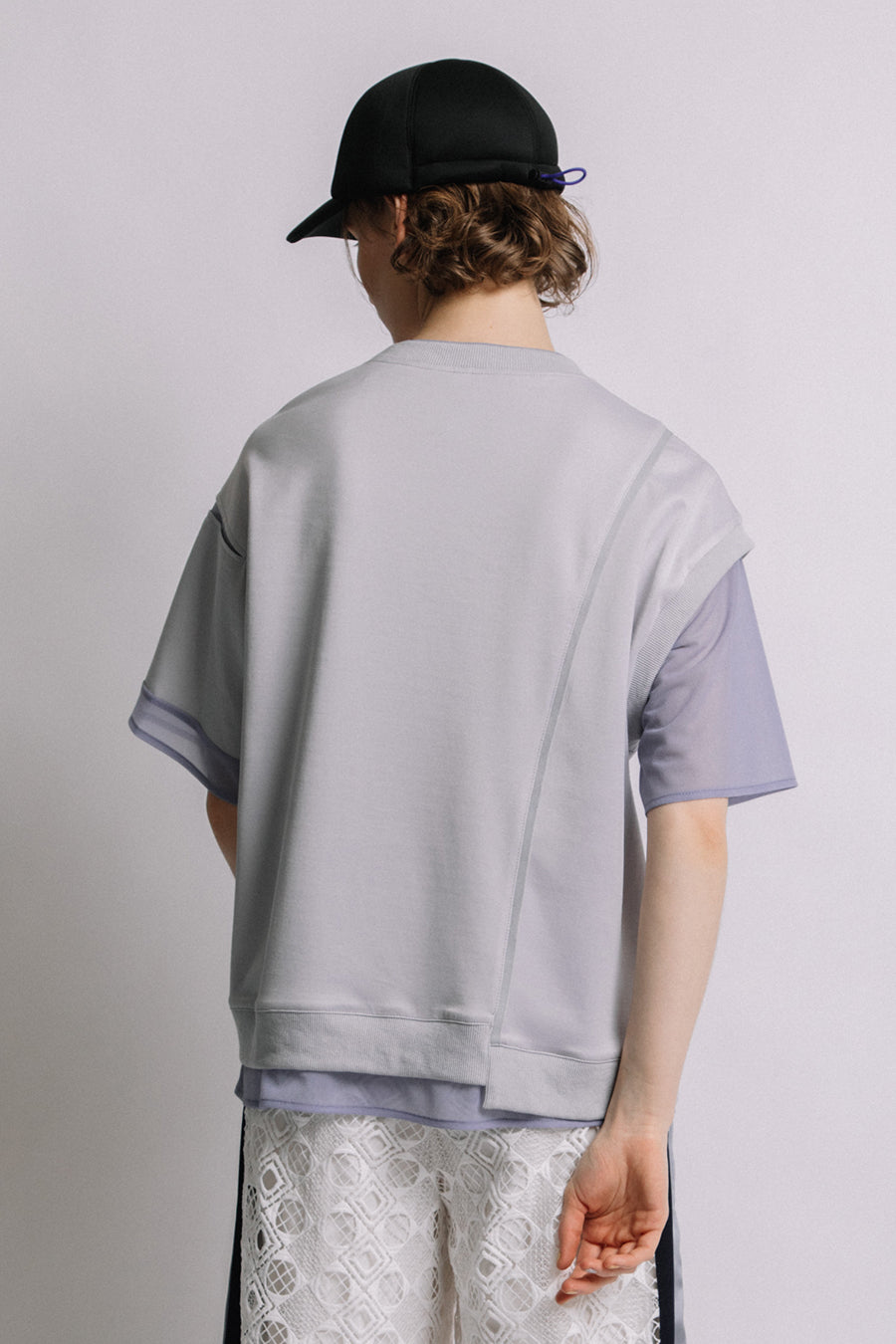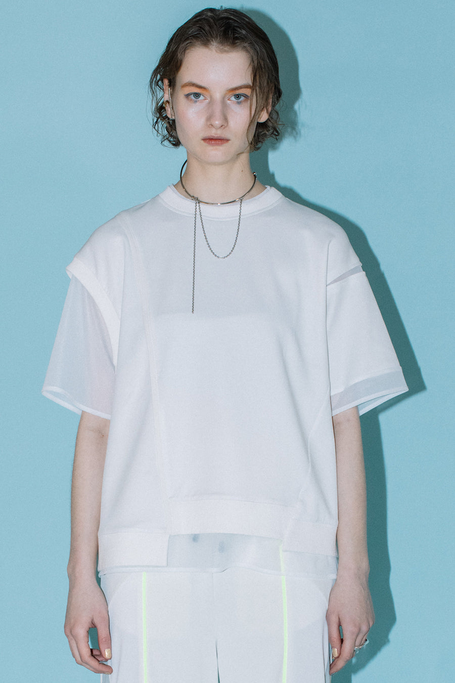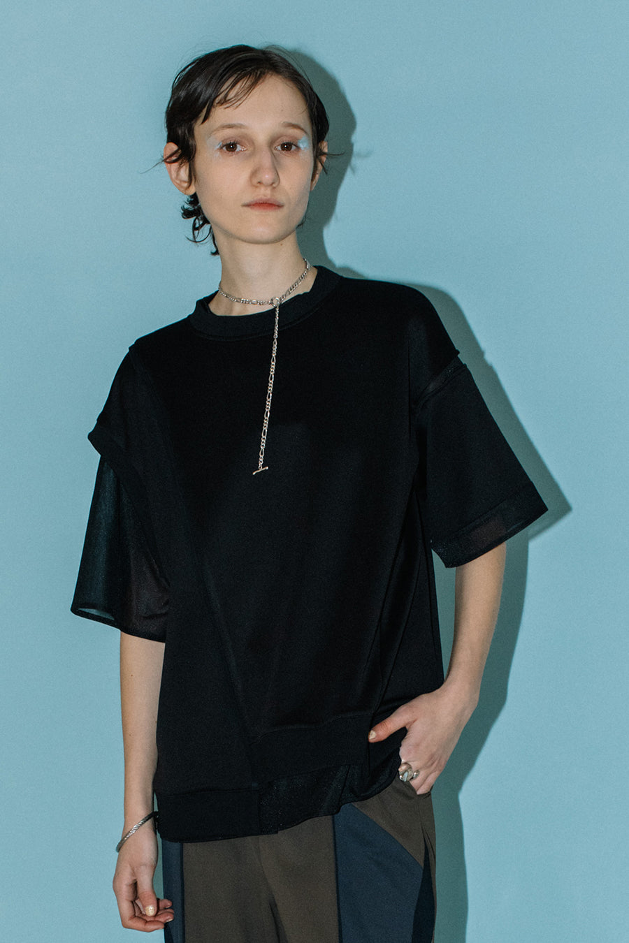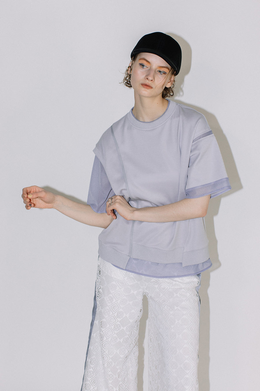 綺麗な表面感のスムースと透け感のあるカットソー素材のオーガンジーをコンビネーションしたアシンメトリーTシャツ。