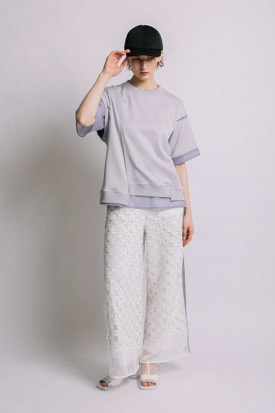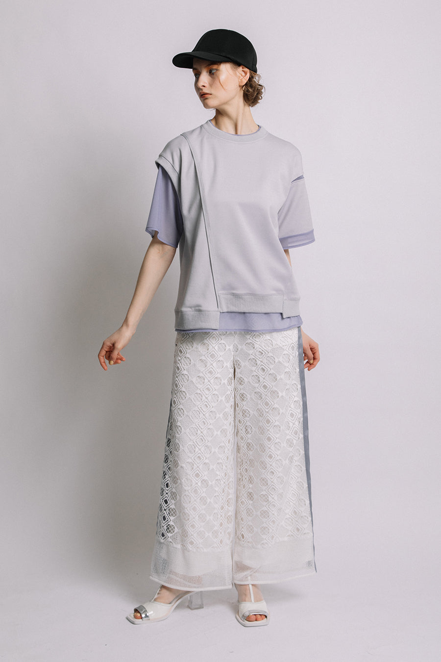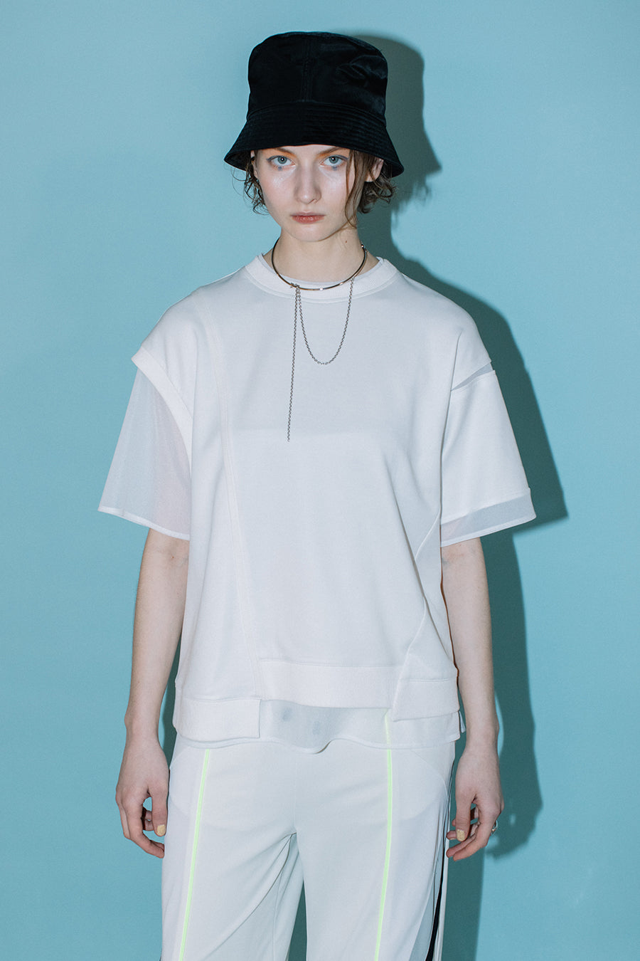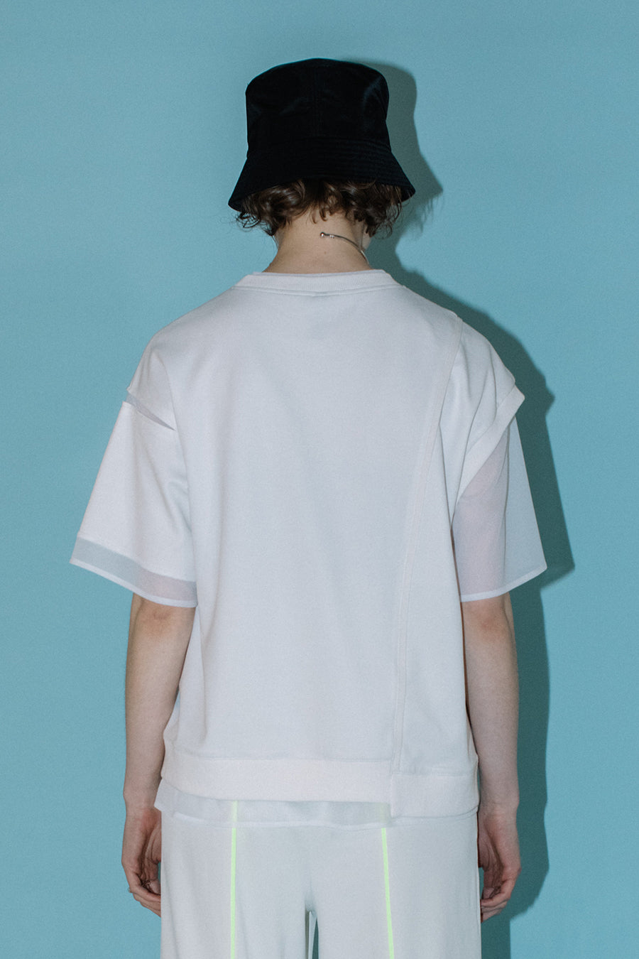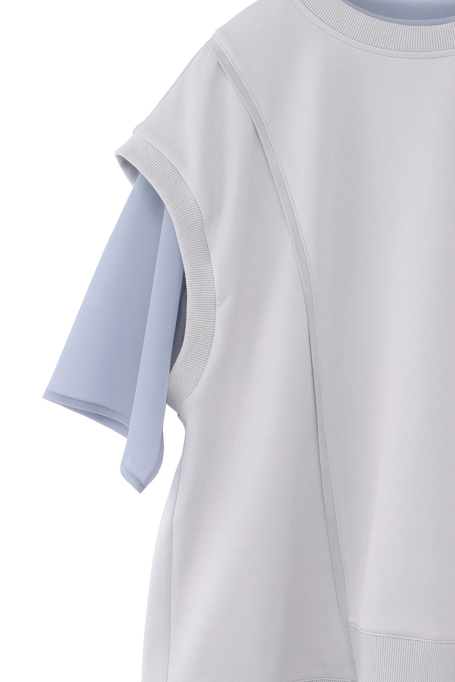 綺麗な表面感のスムースと透け感のあるカットソー素材のオーガンジーをコンビネーションしたアシンメトリーTシャツ。