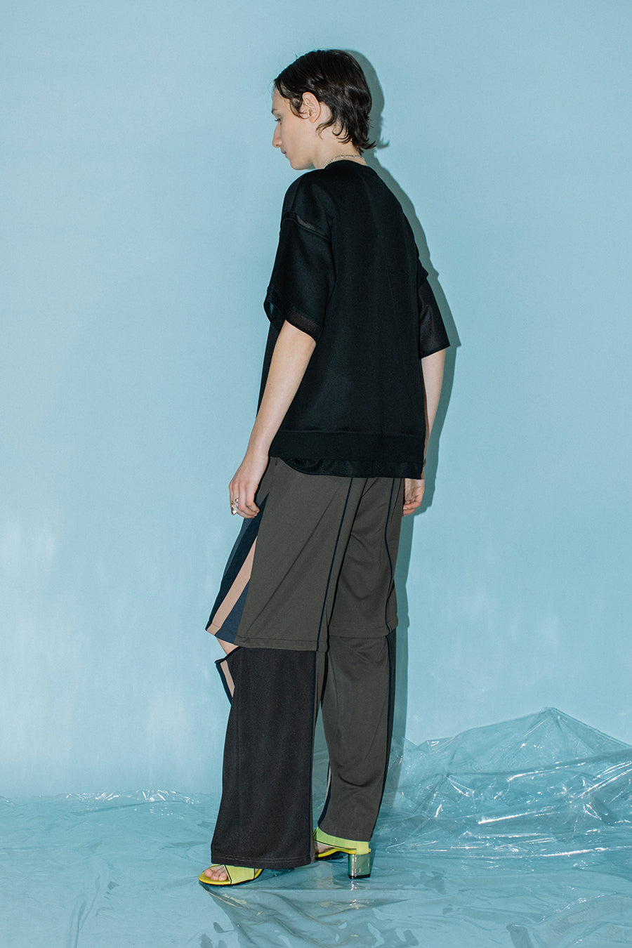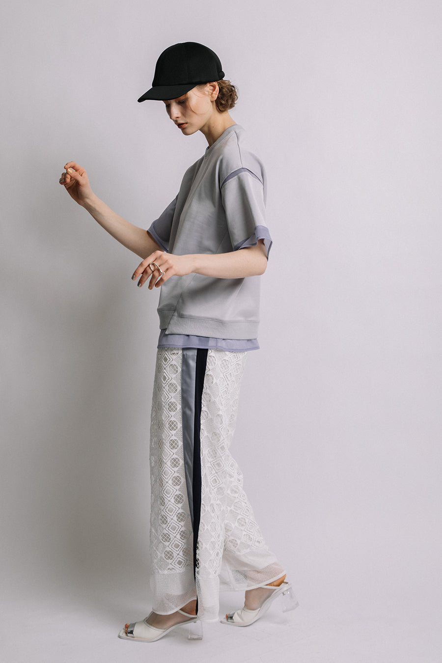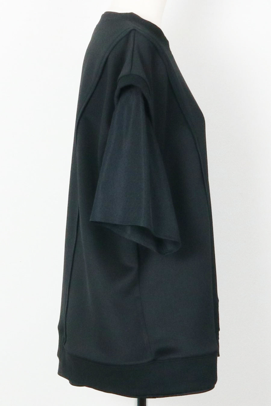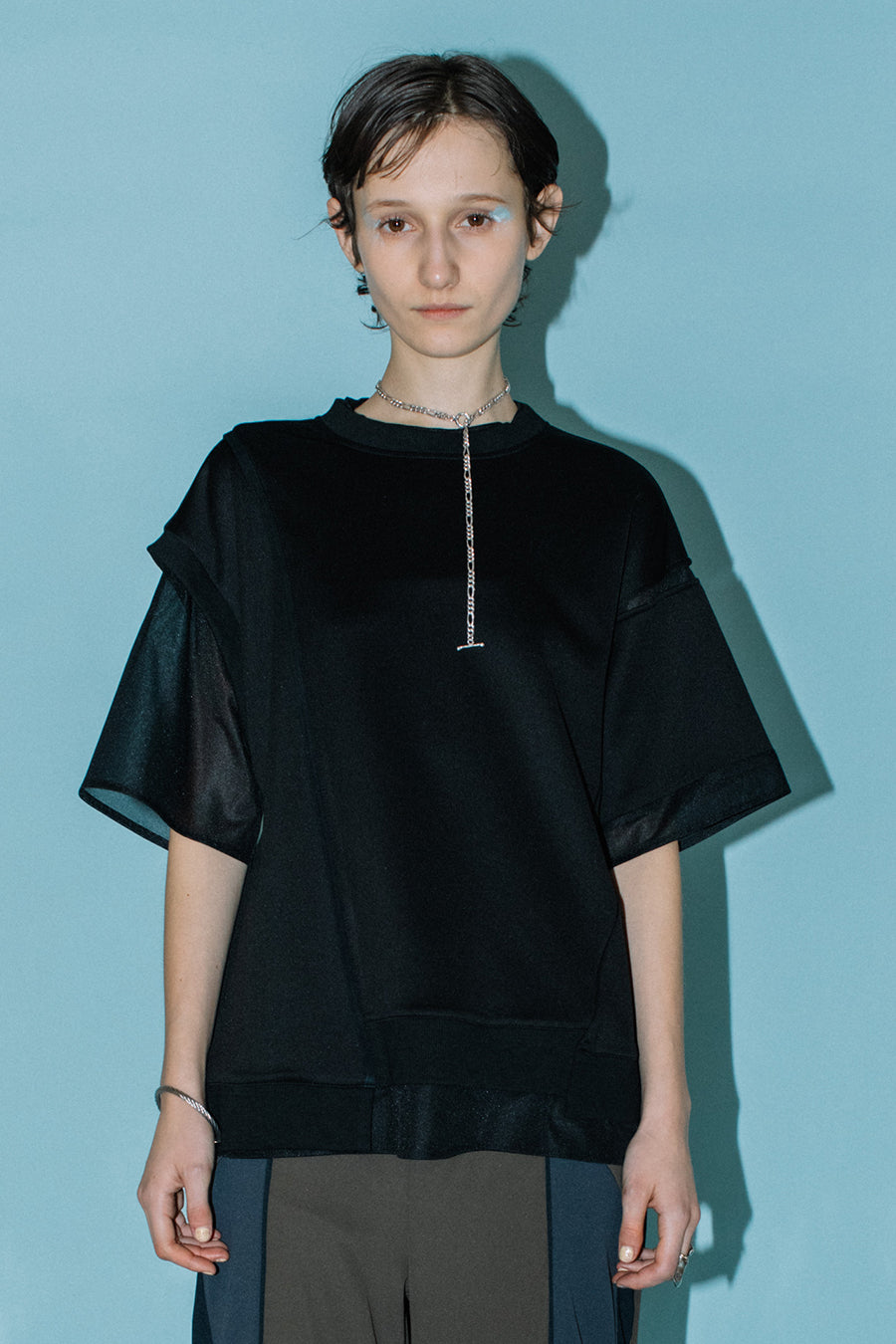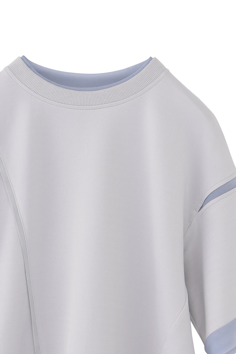 綺麗な表面感のスムースと透け感のあるカットソー素材のオーガンジーをコンビネーションしたアシンメトリーTシャツ。
