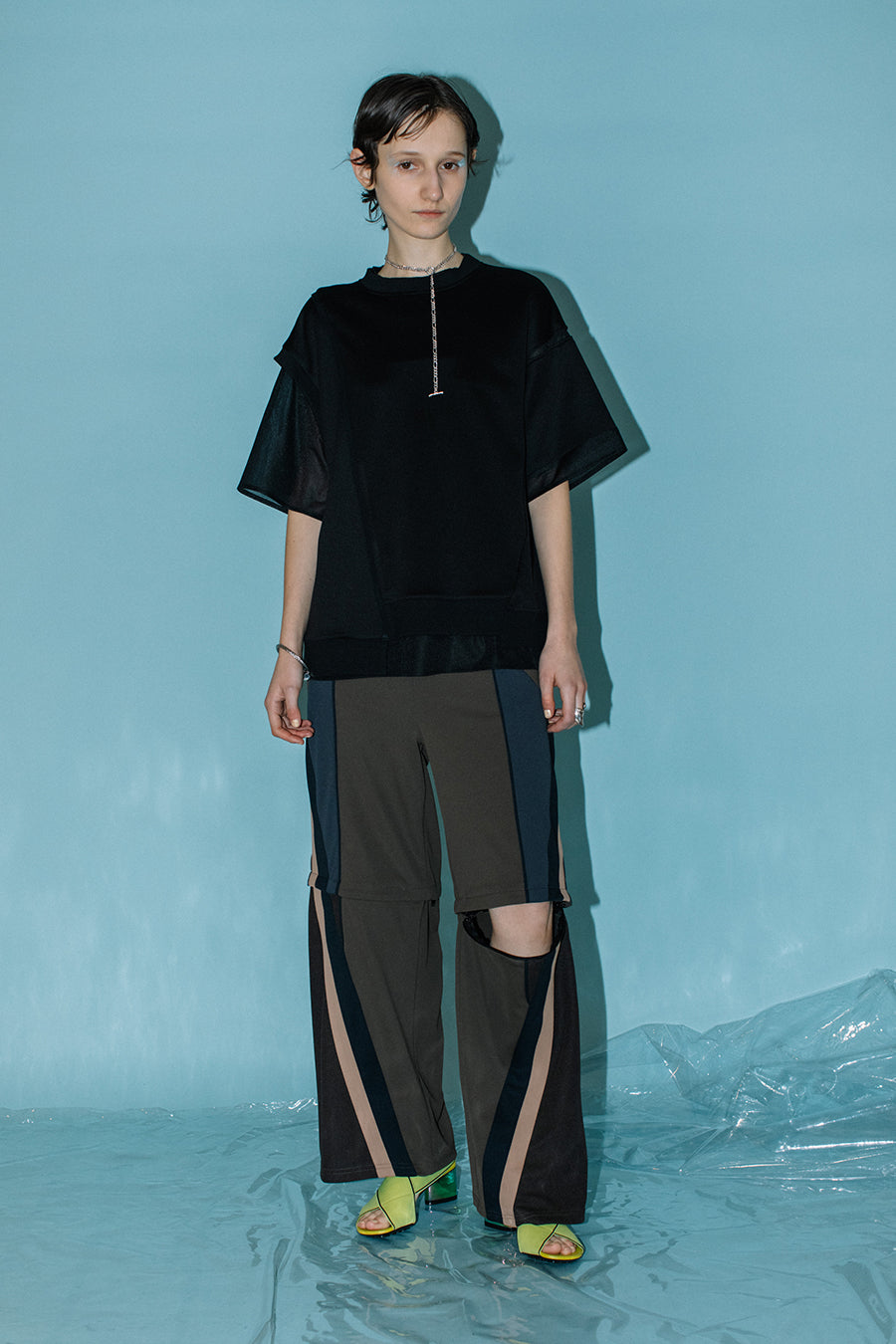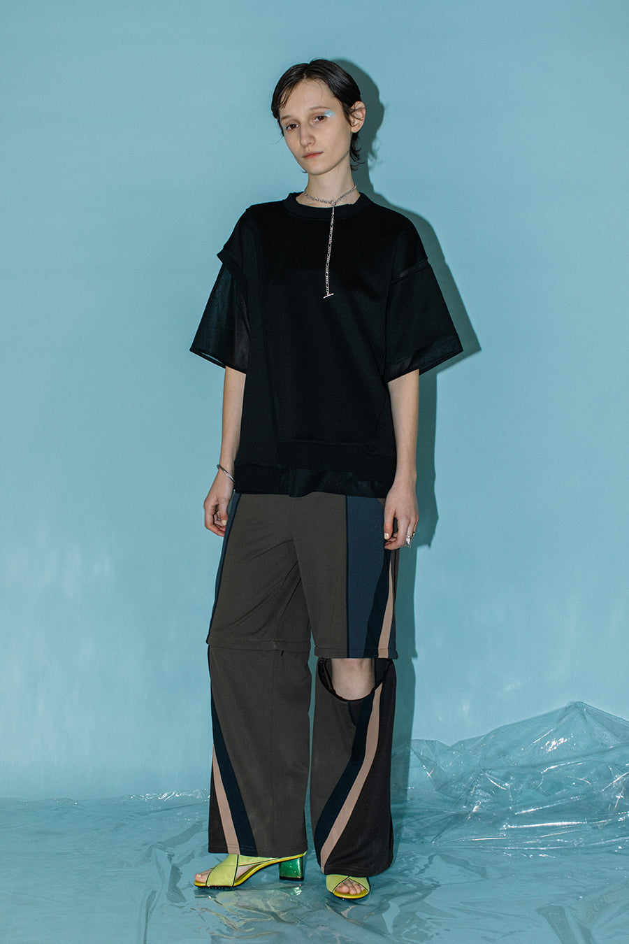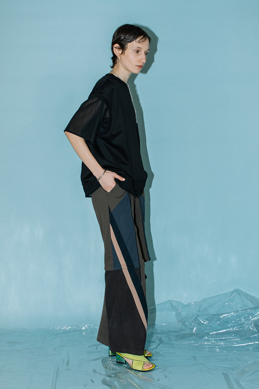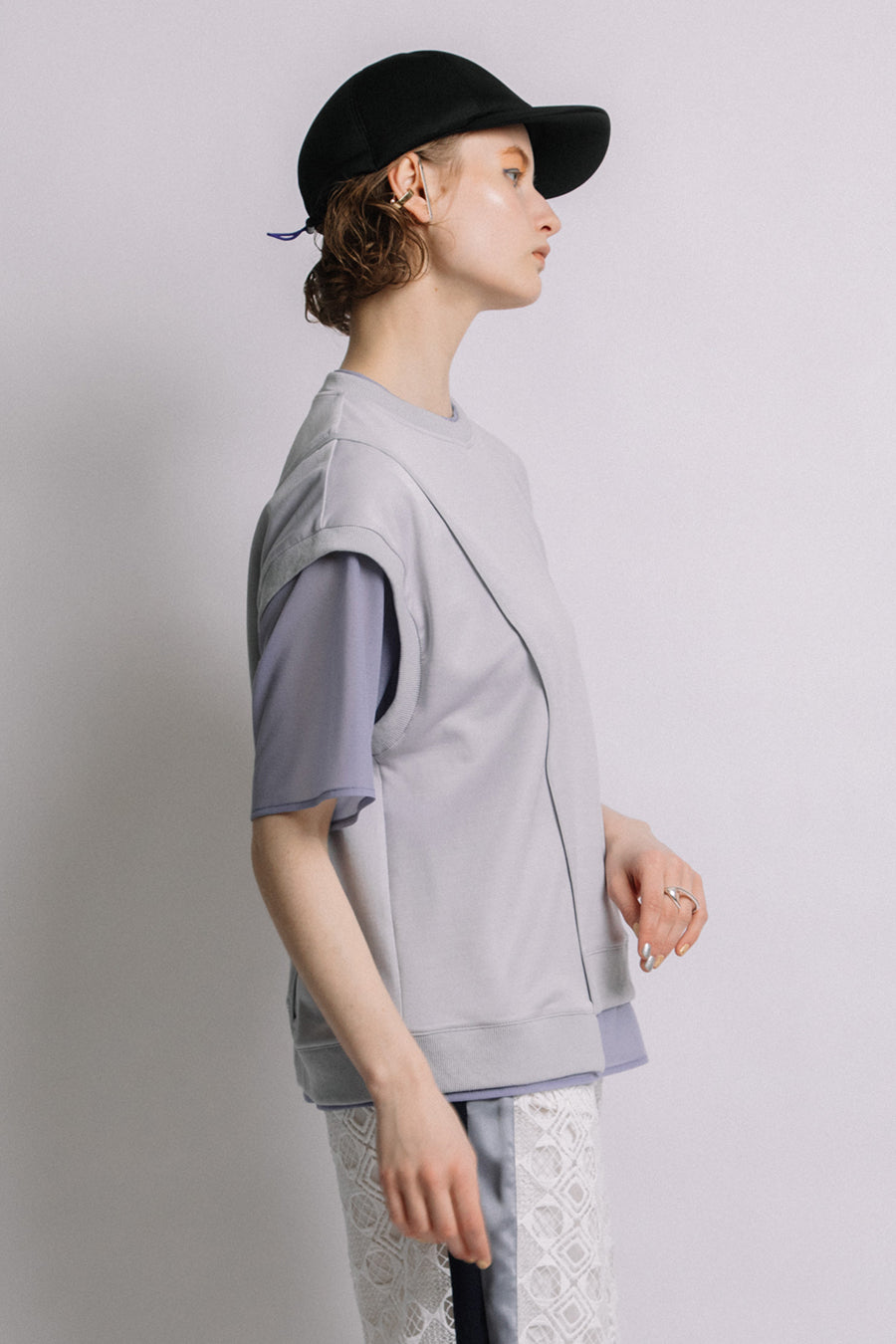 シアー素材のトップスをレイヤードしているかのようなデザインで、アシンメトリーにあしらった程よく透ける生地が涼しげな印象に。