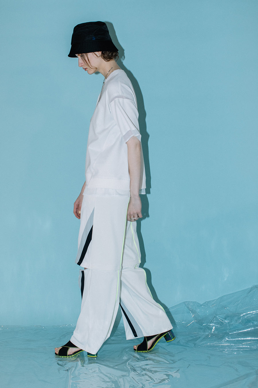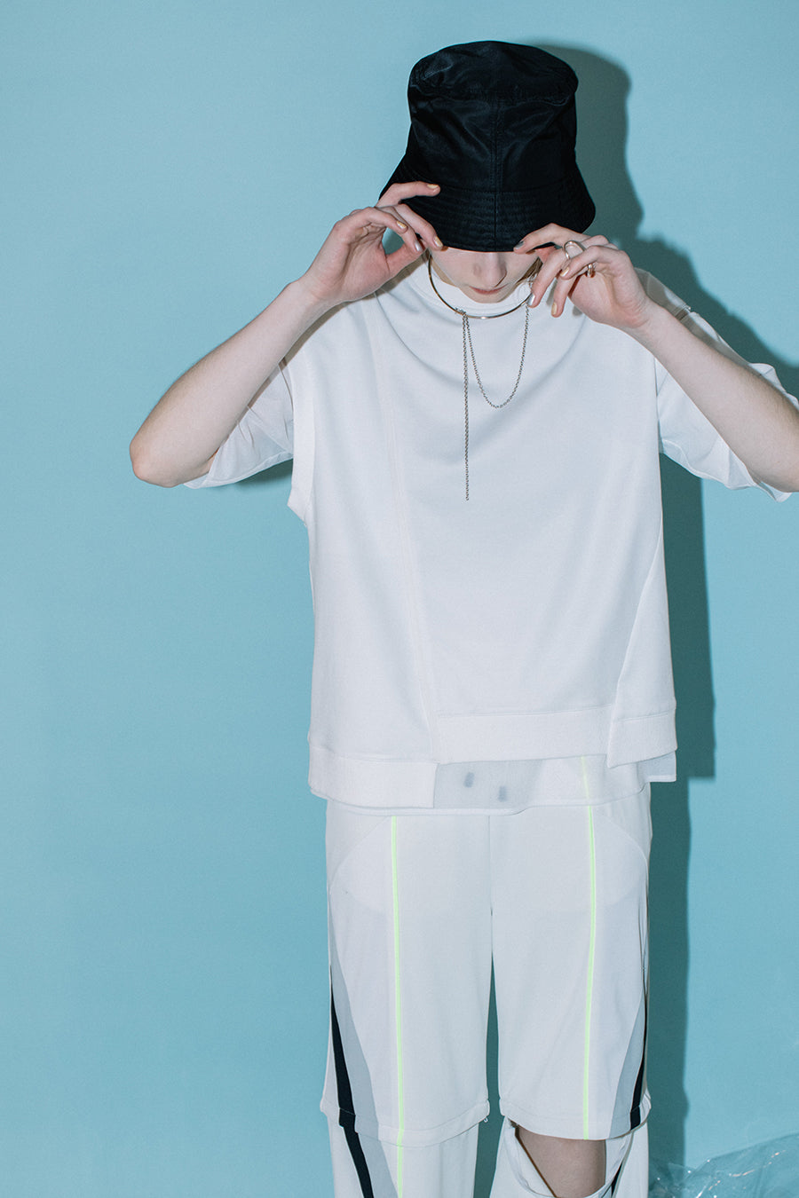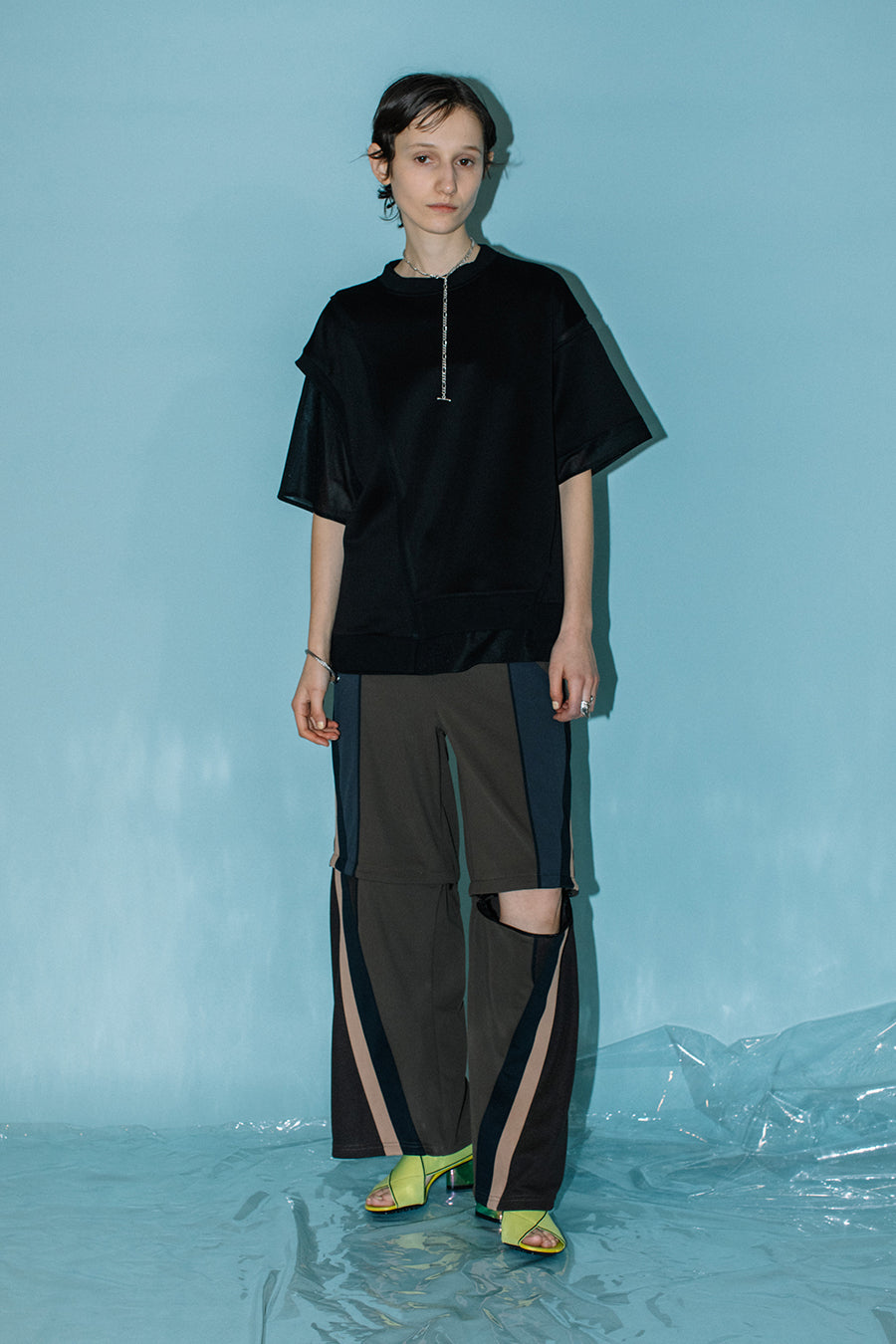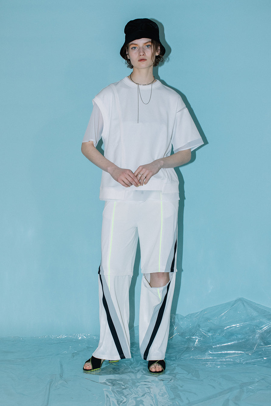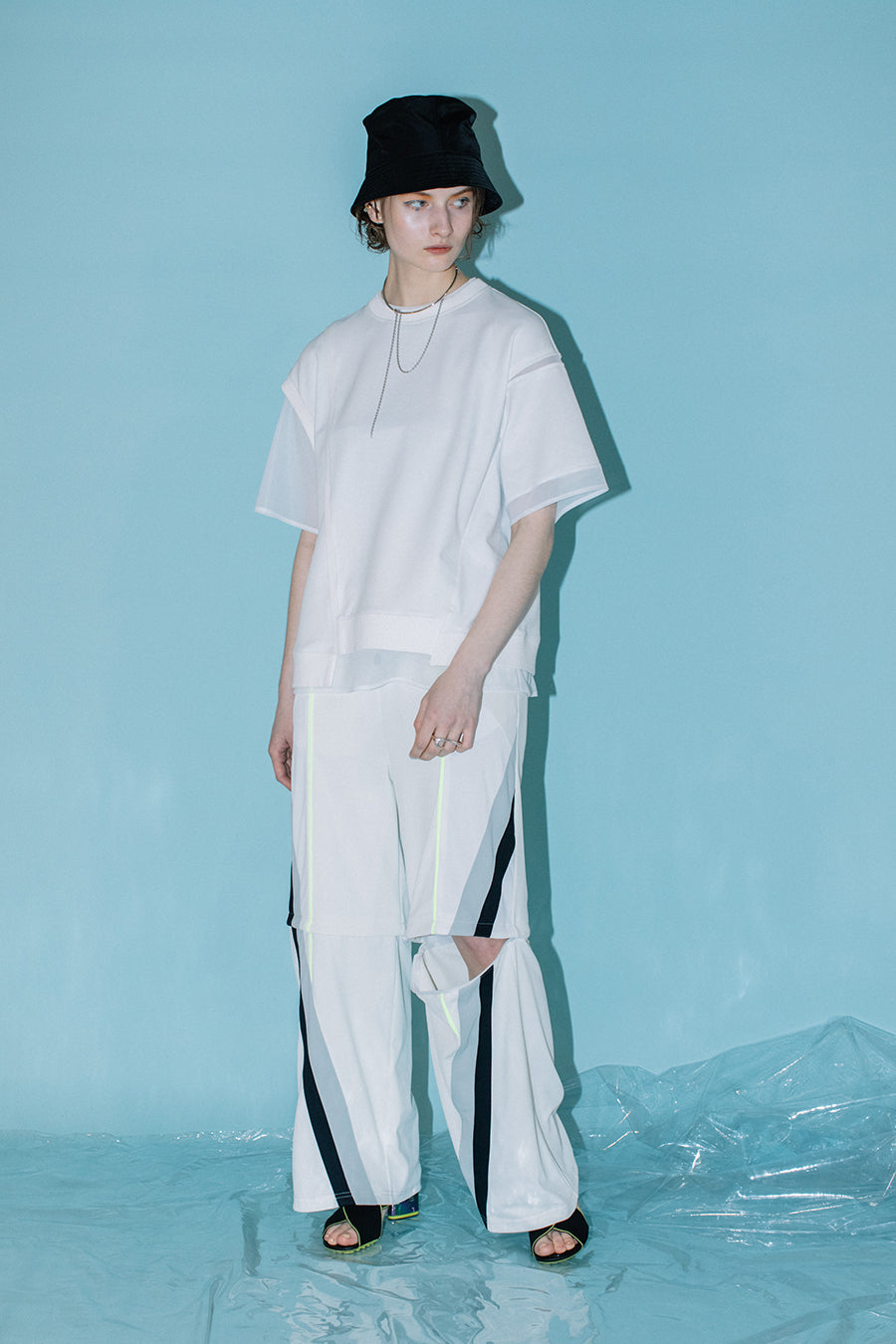 シアー素材のトップスをレイヤードしているかのようなデザインで、アシンメトリーにあしらった程よく透ける生地が涼しげな印象に。