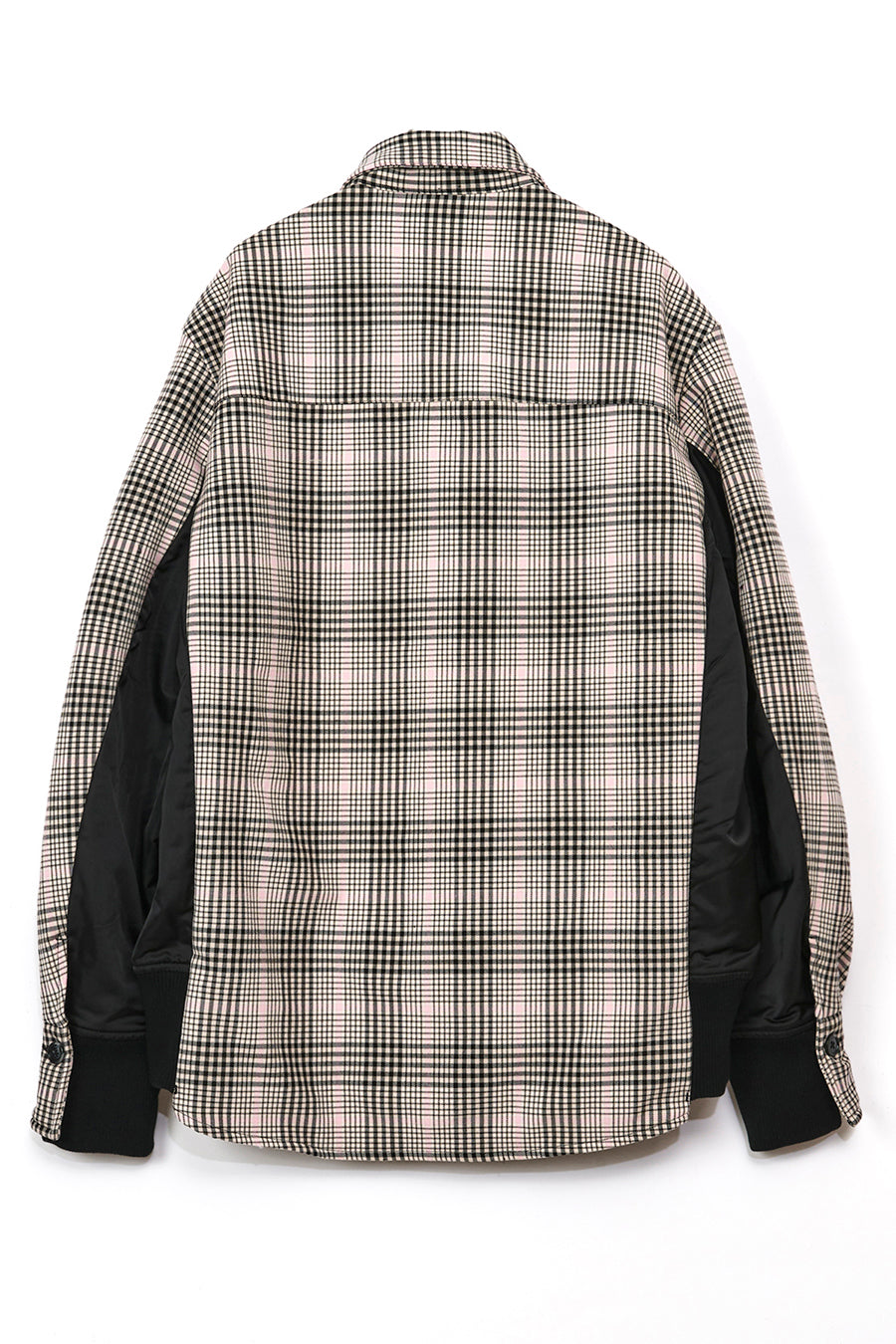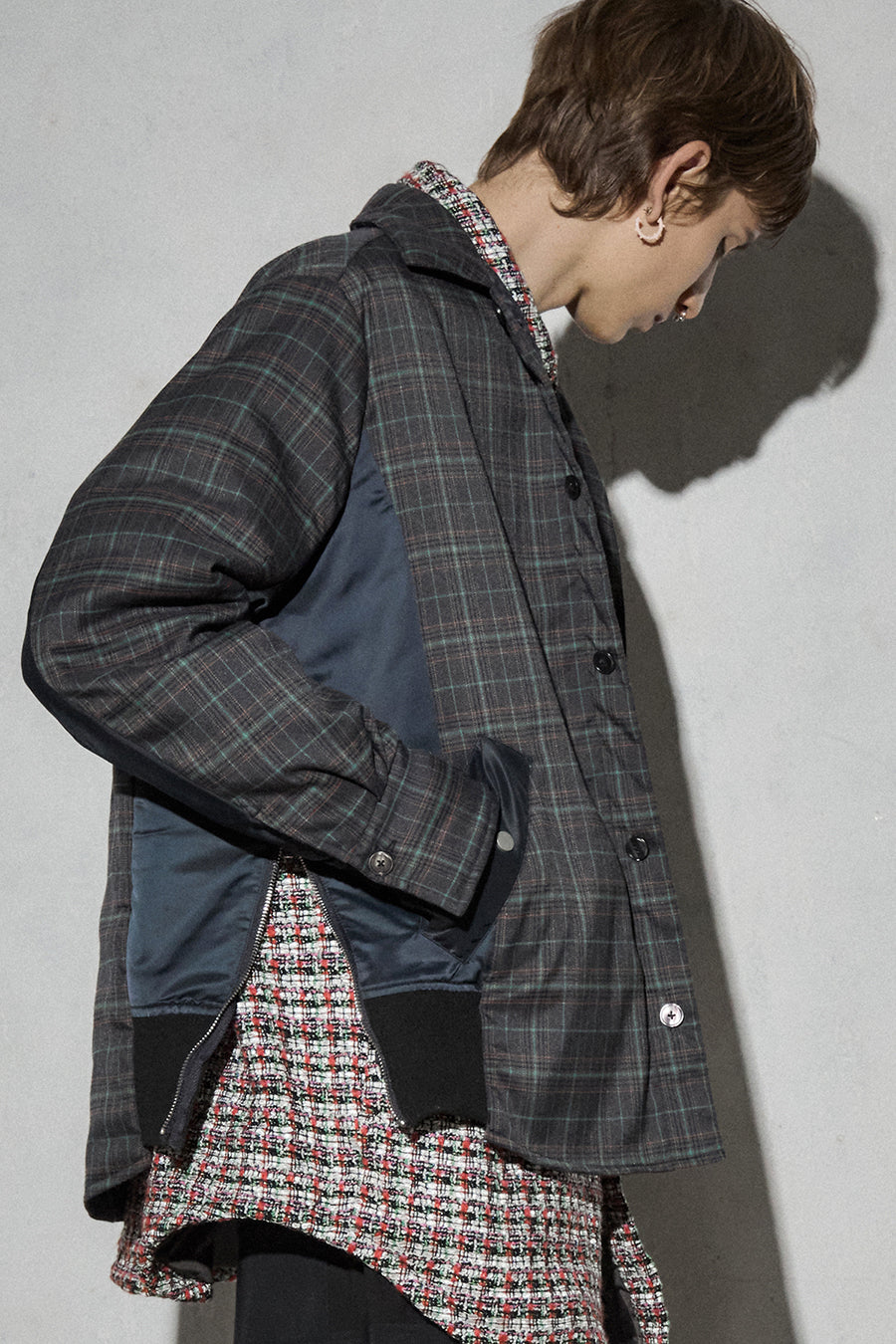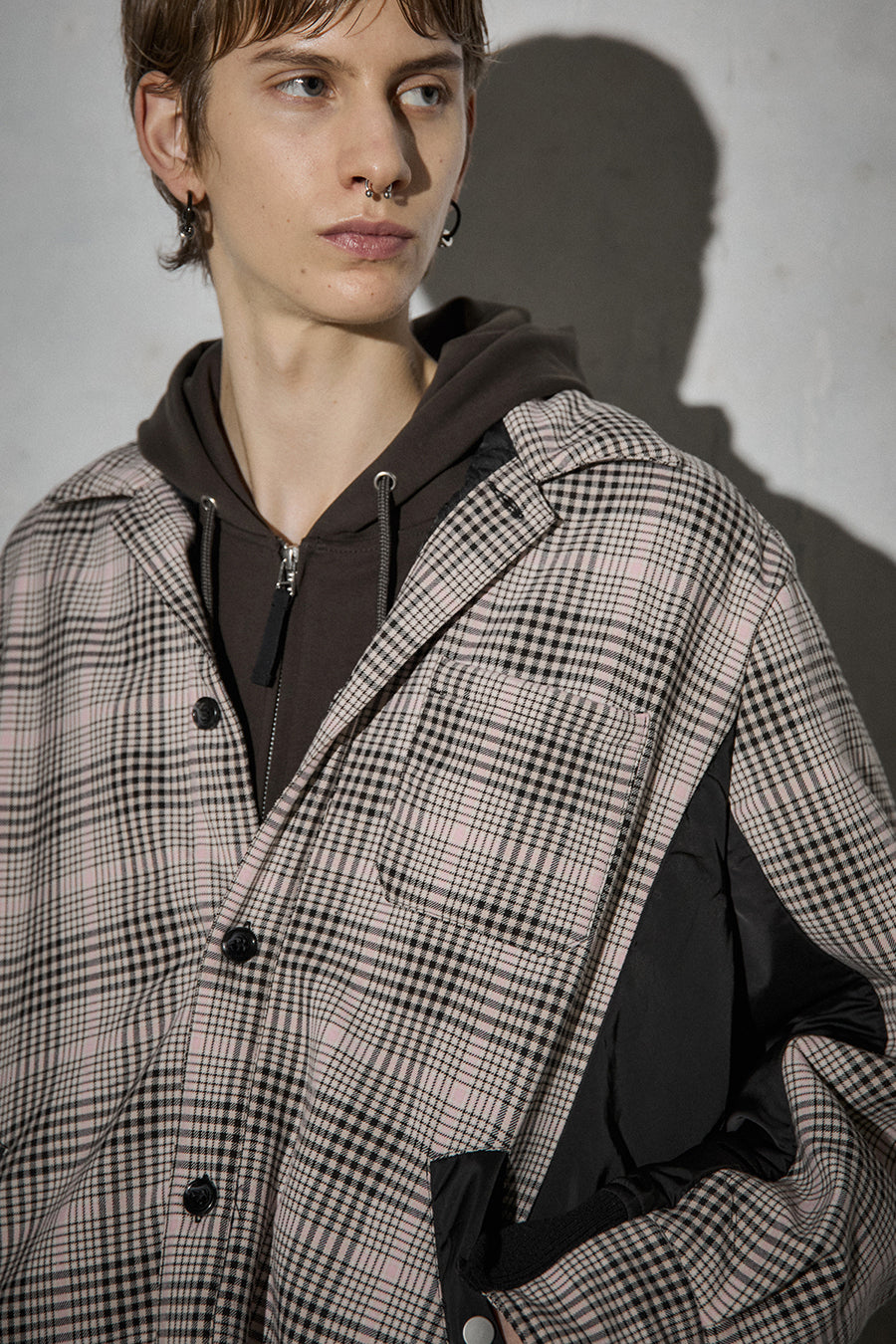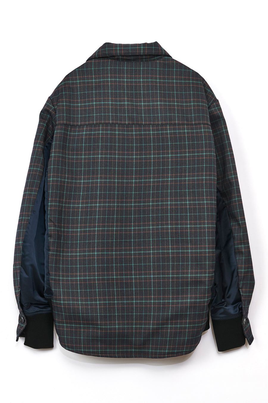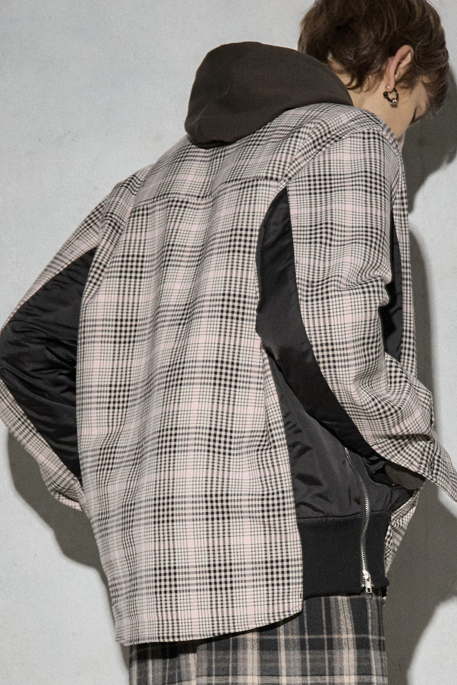 チェックシャツに、中綿キルティングとナイロンを組み合わせた異素材ブルゾン。