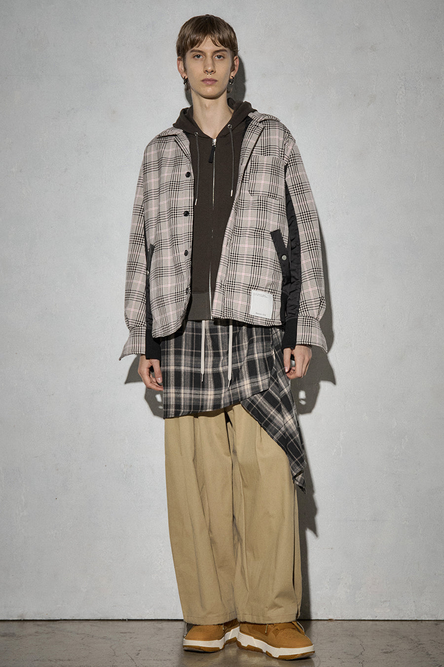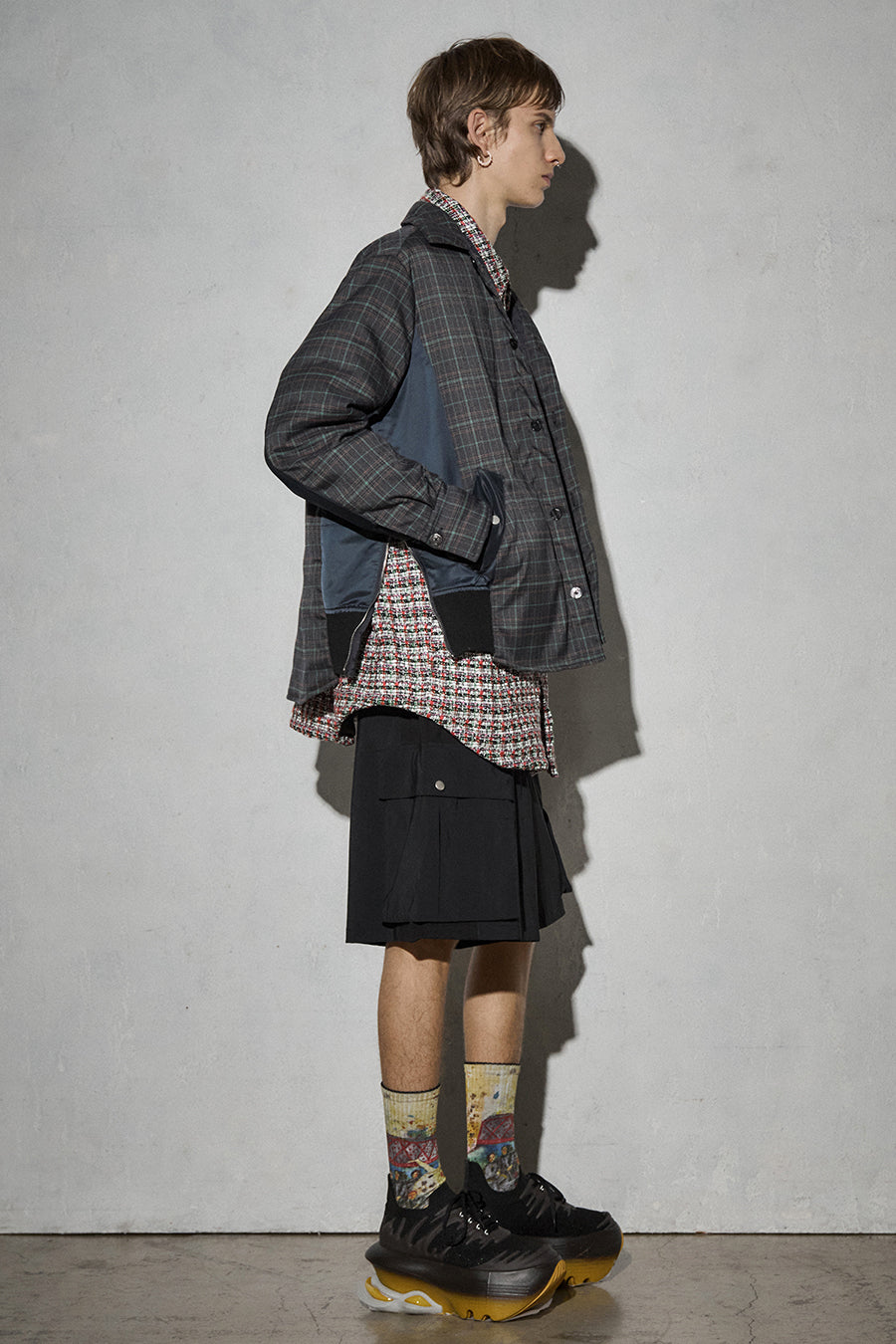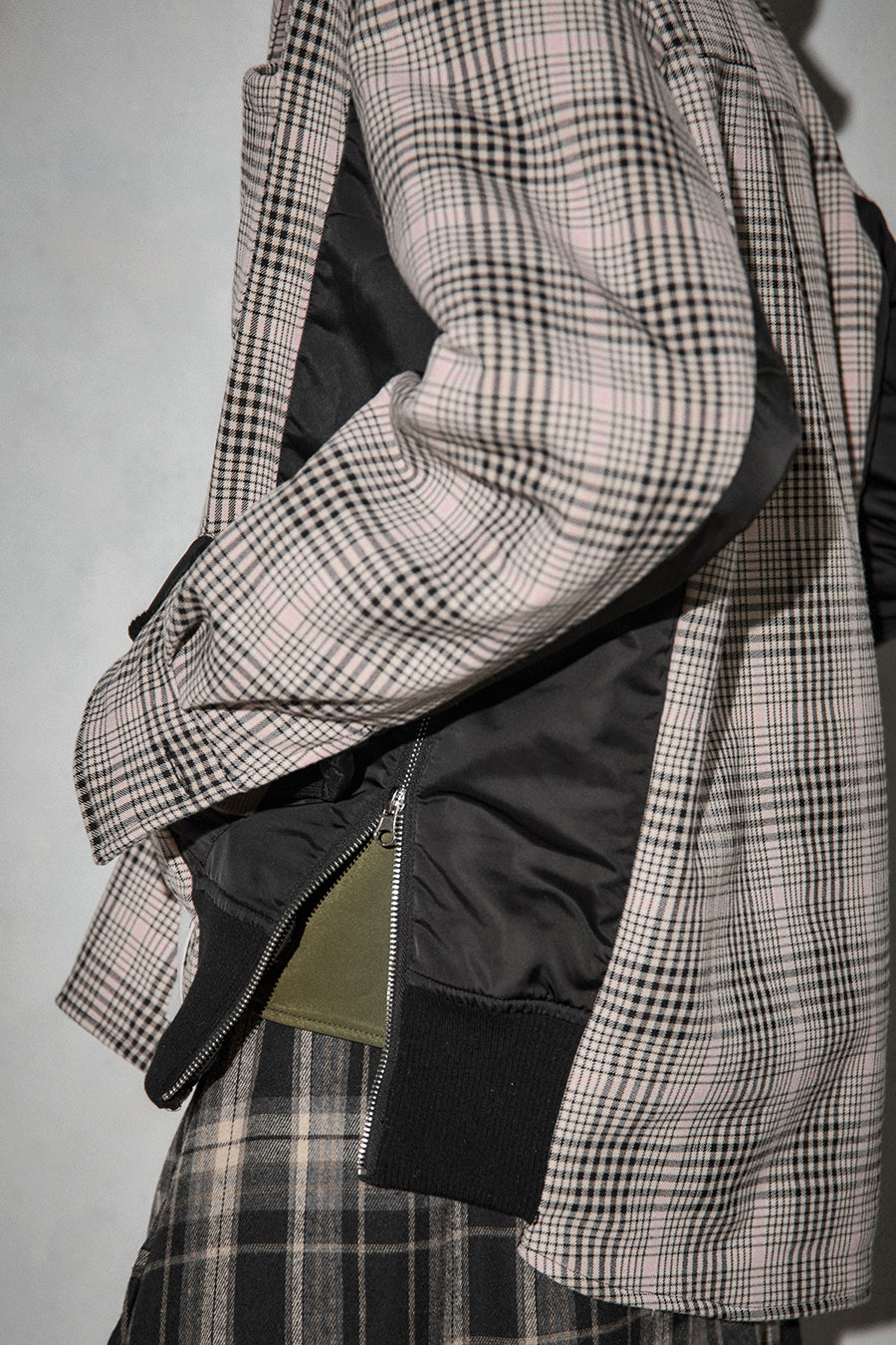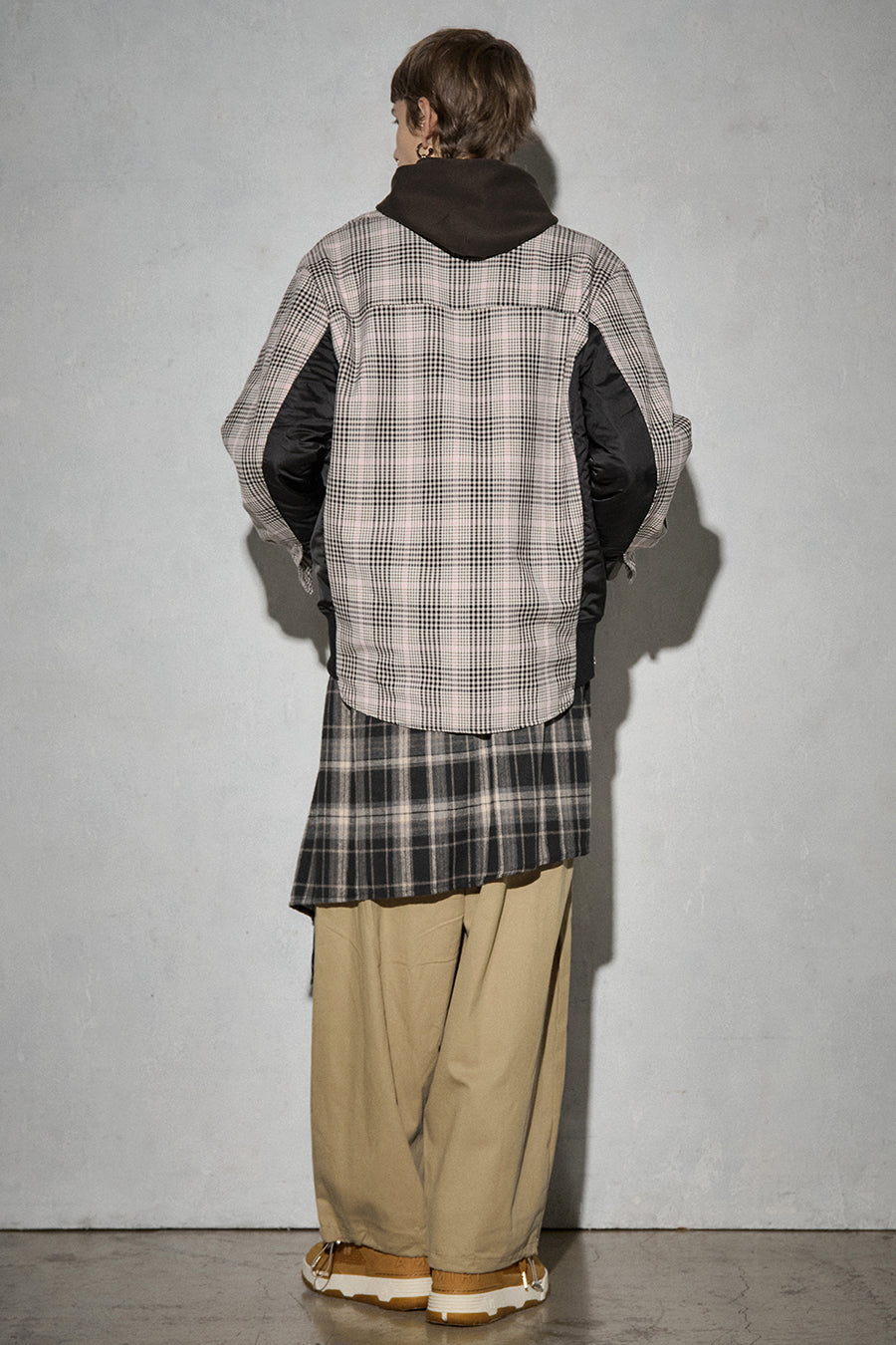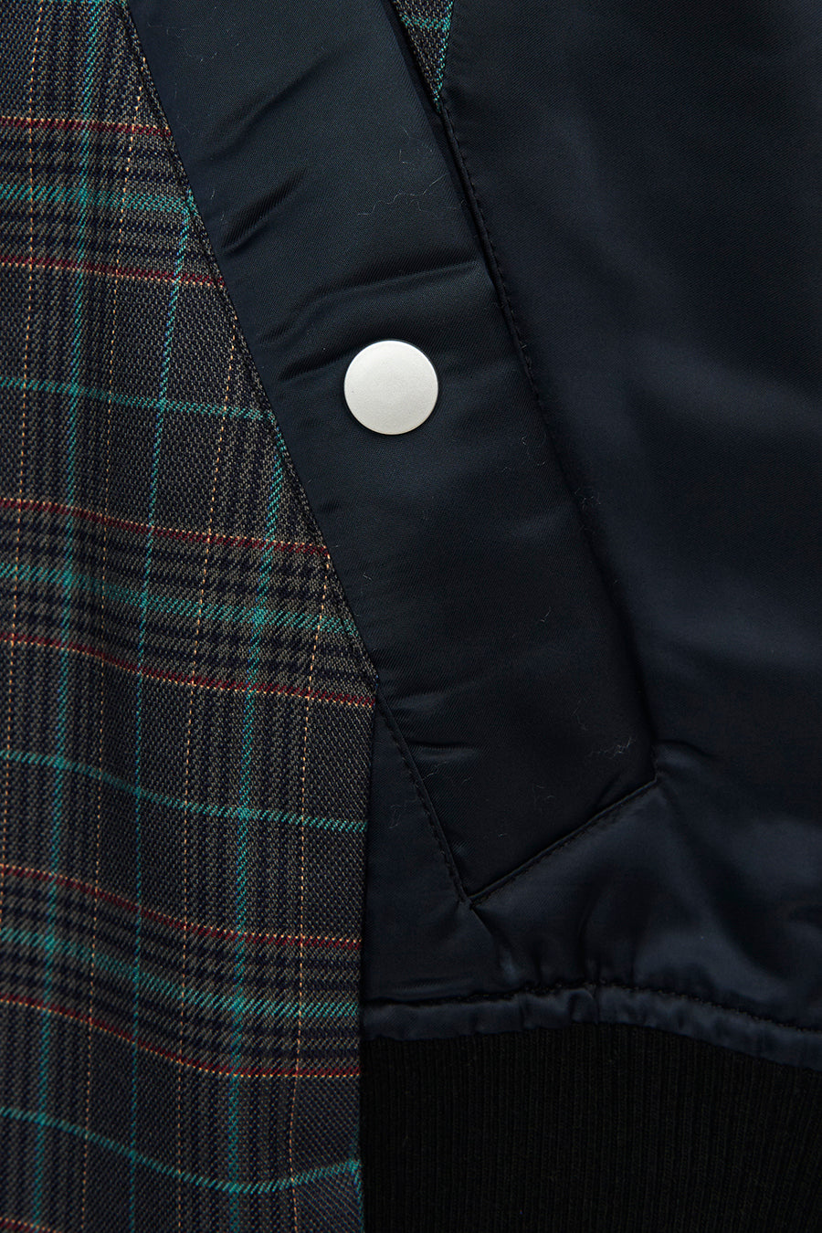 チェックシャツに、中綿キルティングとナイロンを組み合わせた異素材ブルゾン。