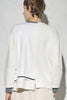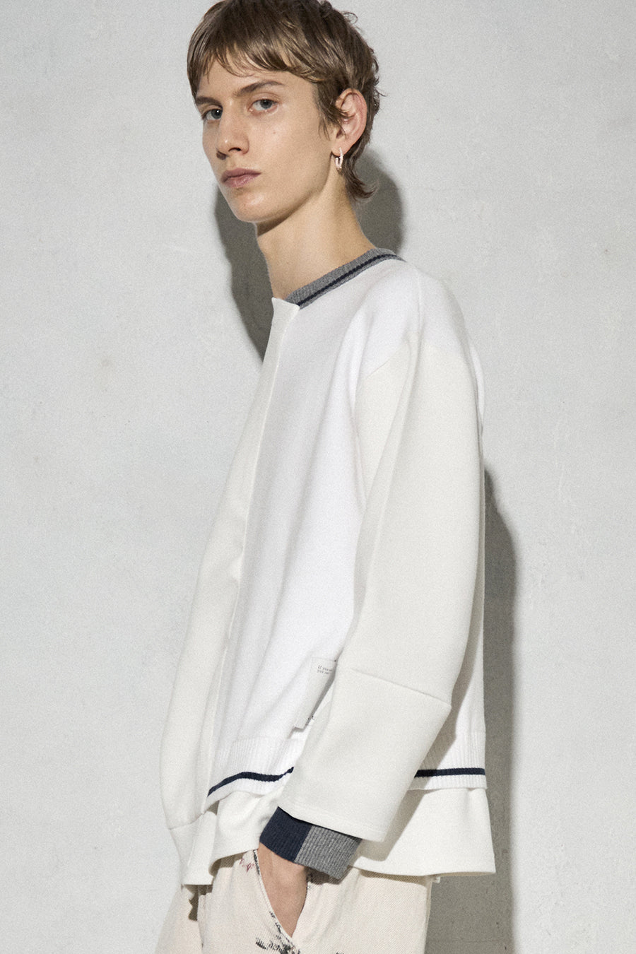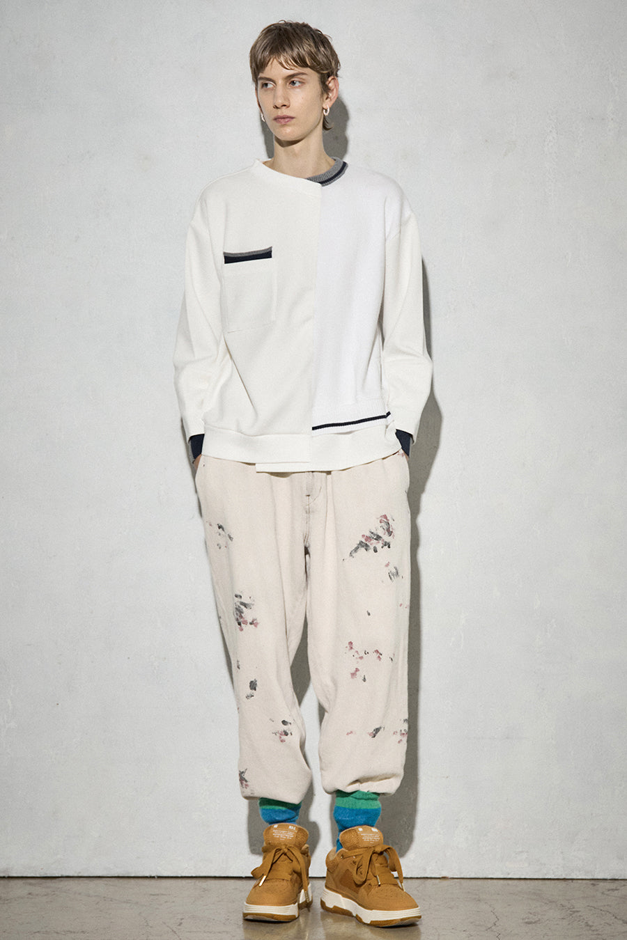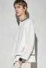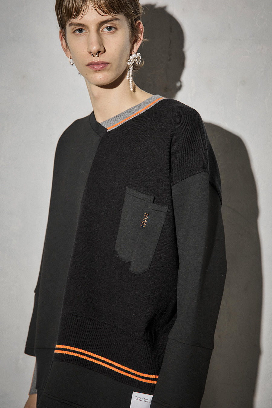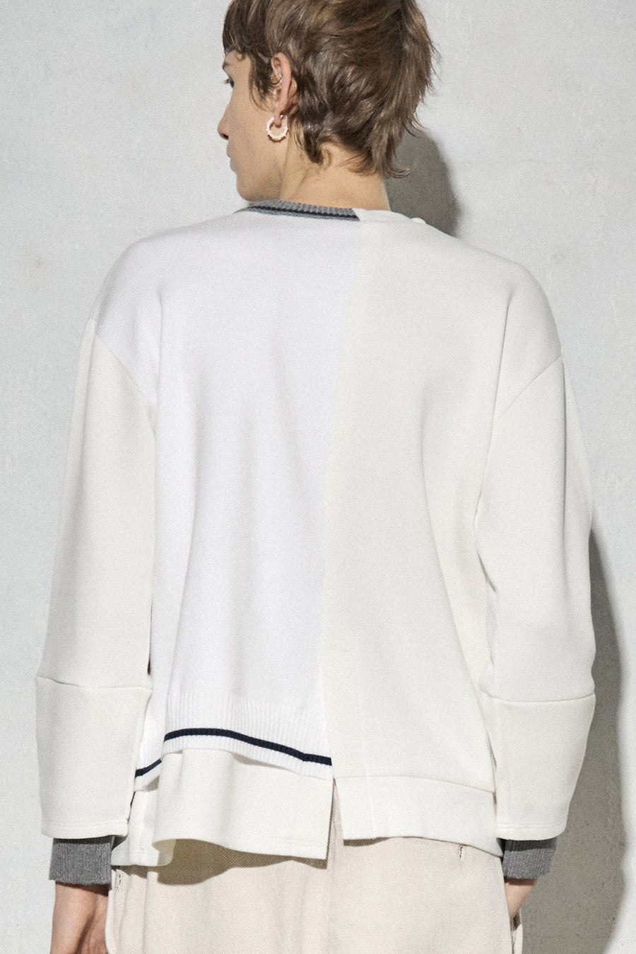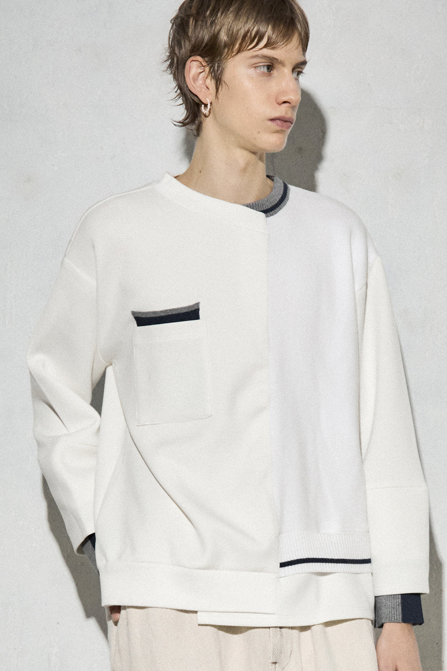 ニットとダンボールカットソーを左右で切り替えた、アシンメトリーデザインのプルオーバー。裾のレイヤード風ディテールや、後ろのスリットが抜け感をプラス。袖は丸みのあるカーブラインで、袖口からリブニットが覗く立体的な仕上がりに。配色の襟リブや胸ポケットもアクセント。