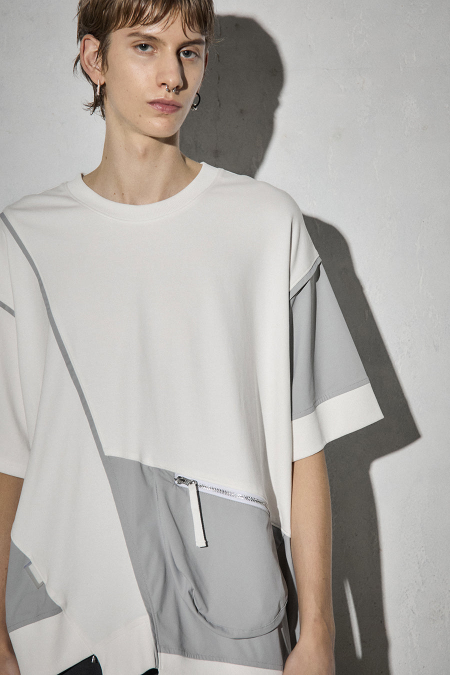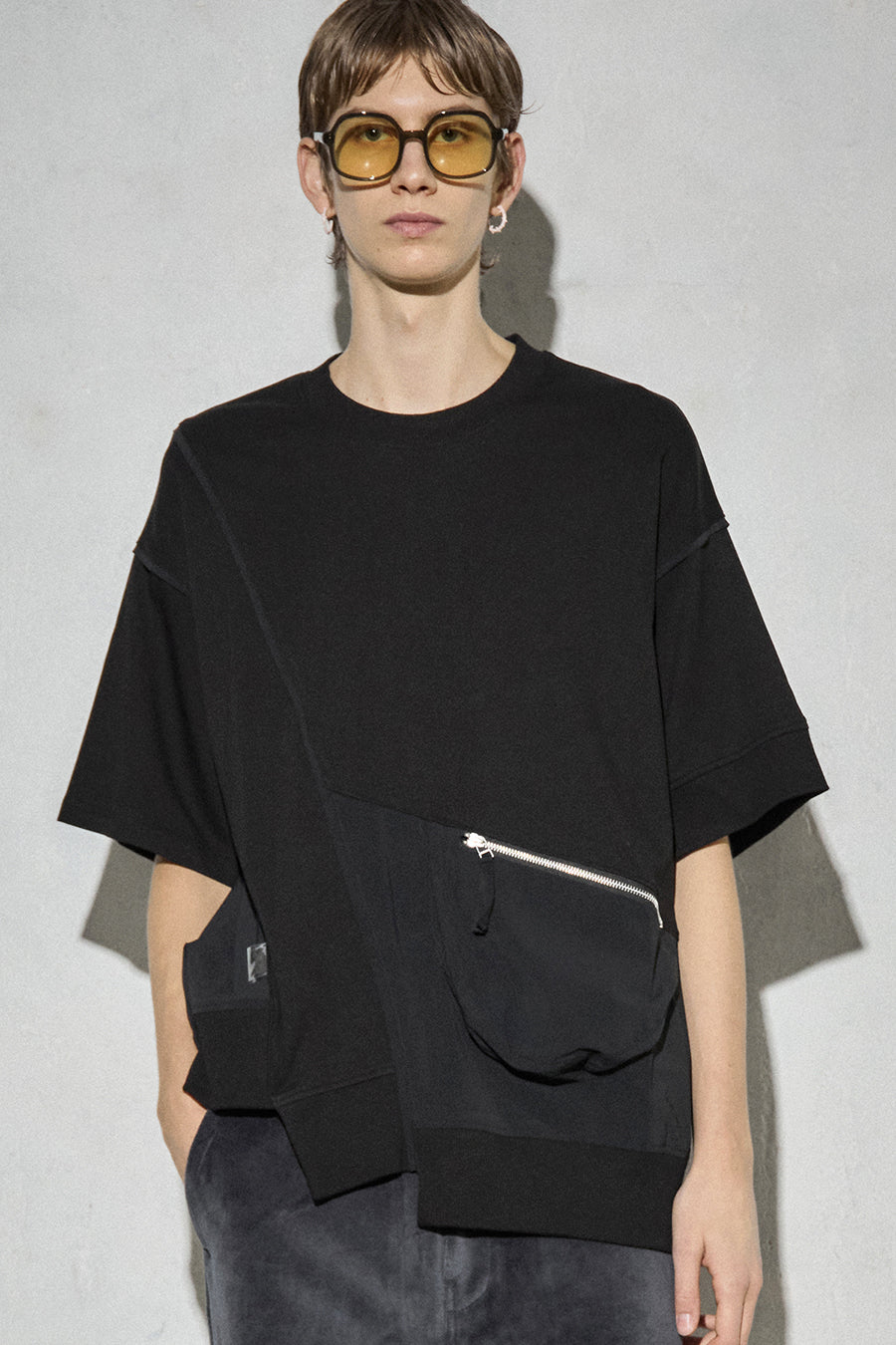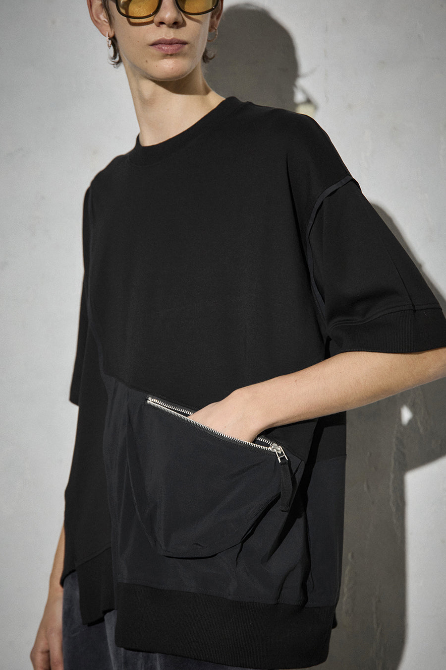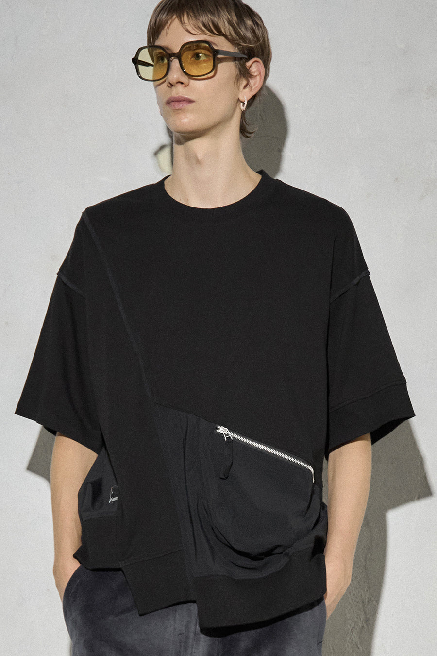 異素材コンビネーションが特徴の、カジュアルに着こなせるデザインTシャツ。ボディは柔らかく着心地の良いコットンスムースを使用。フロントにはファスナー付きのマチポケットを配置し、スマートフォンや小物の持ち運びにも便利。パイピングやPVCのピスネーム、背中にはテープやタックテープを効かせて、さりげない遊び心も。機能性とデザイン性を両立させた1着。
