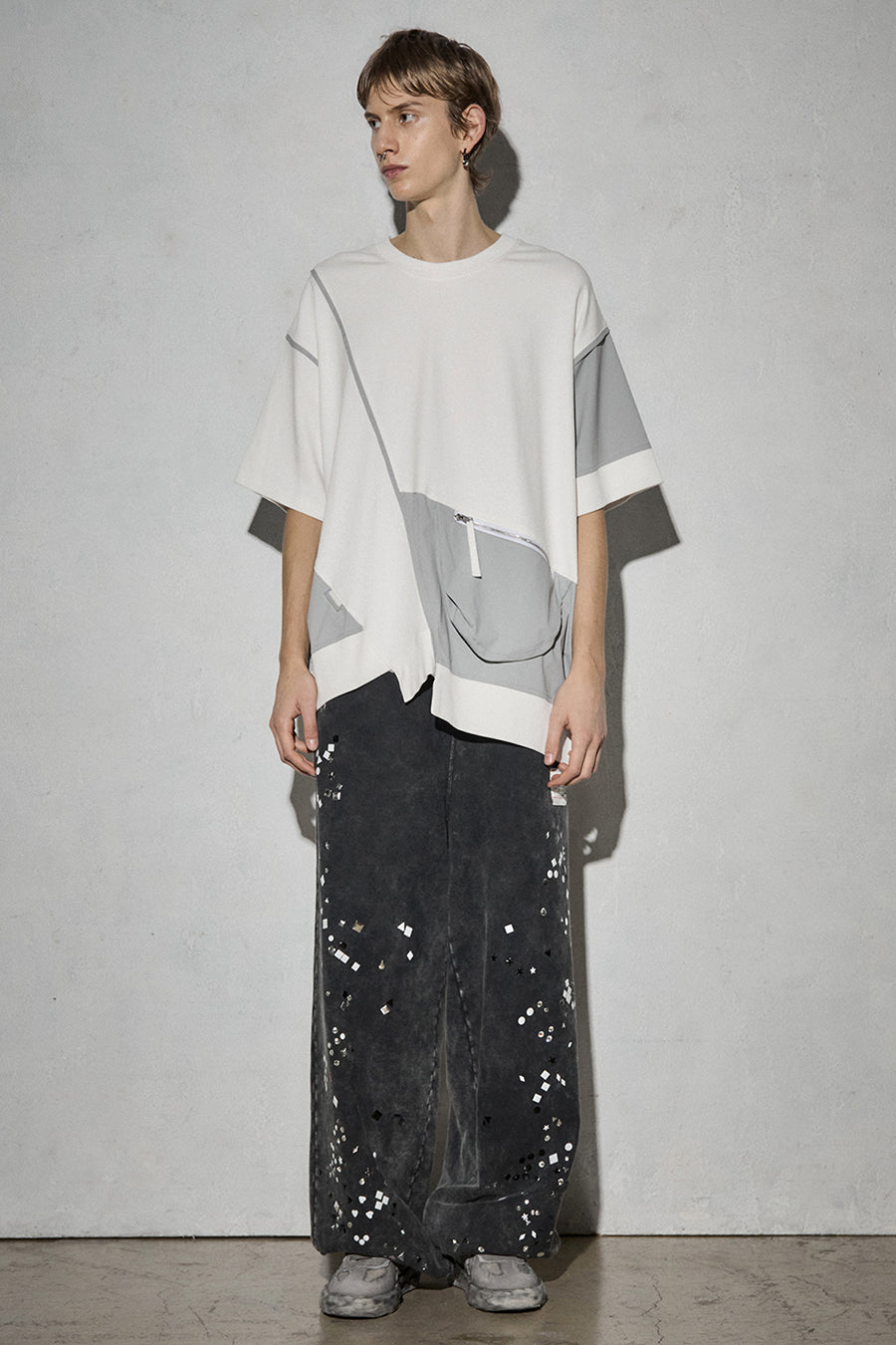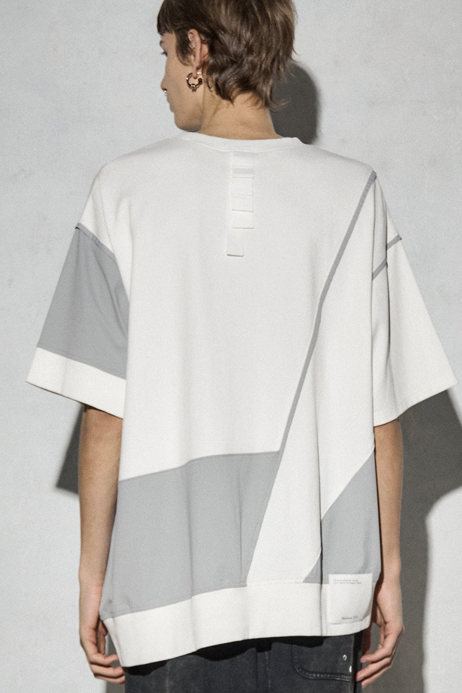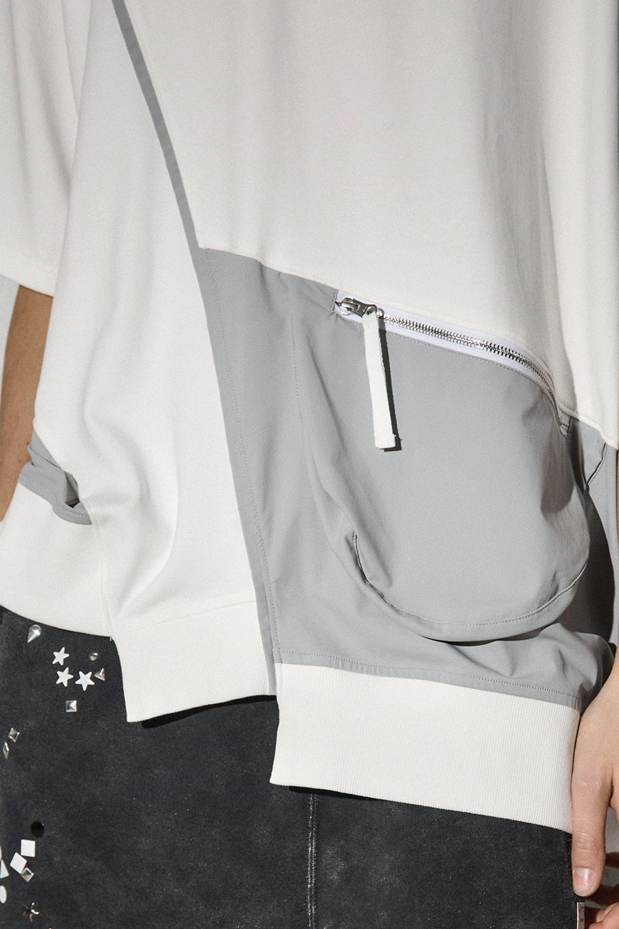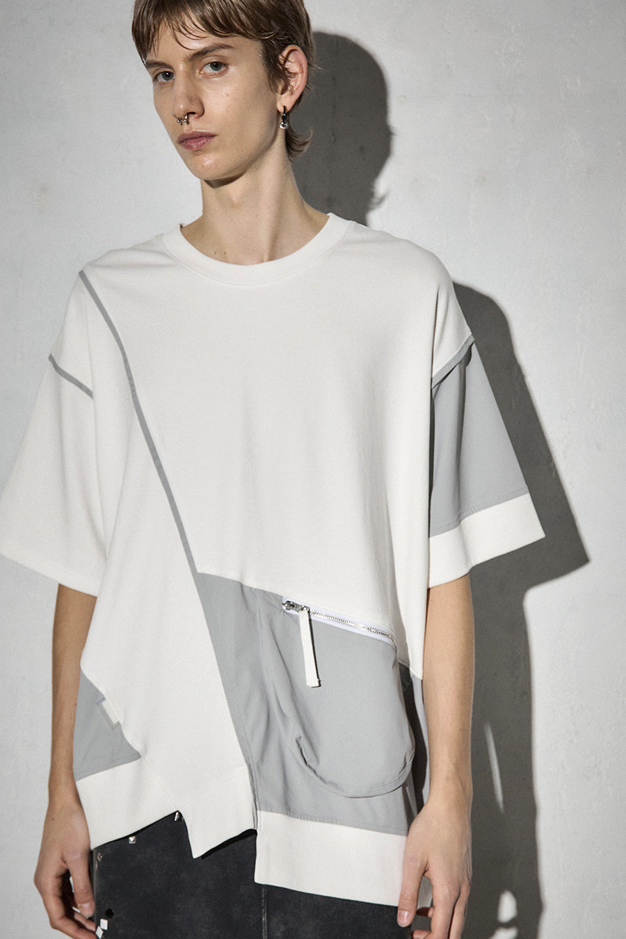 異素材コンビネーションが特徴の、カジュアルに着こなせるデザインTシャツ。ボディは柔らかく着心地の良いコットンスムースを使用。フロントにはファスナー付きのマチポケットを配置し、スマートフォンや小物の持ち運びにも便利。パイピングやPVCのピスネーム、背中にはテープやタックテープを効かせて、さりげない遊び心も。機能性とデザイン性を両立させた1着。