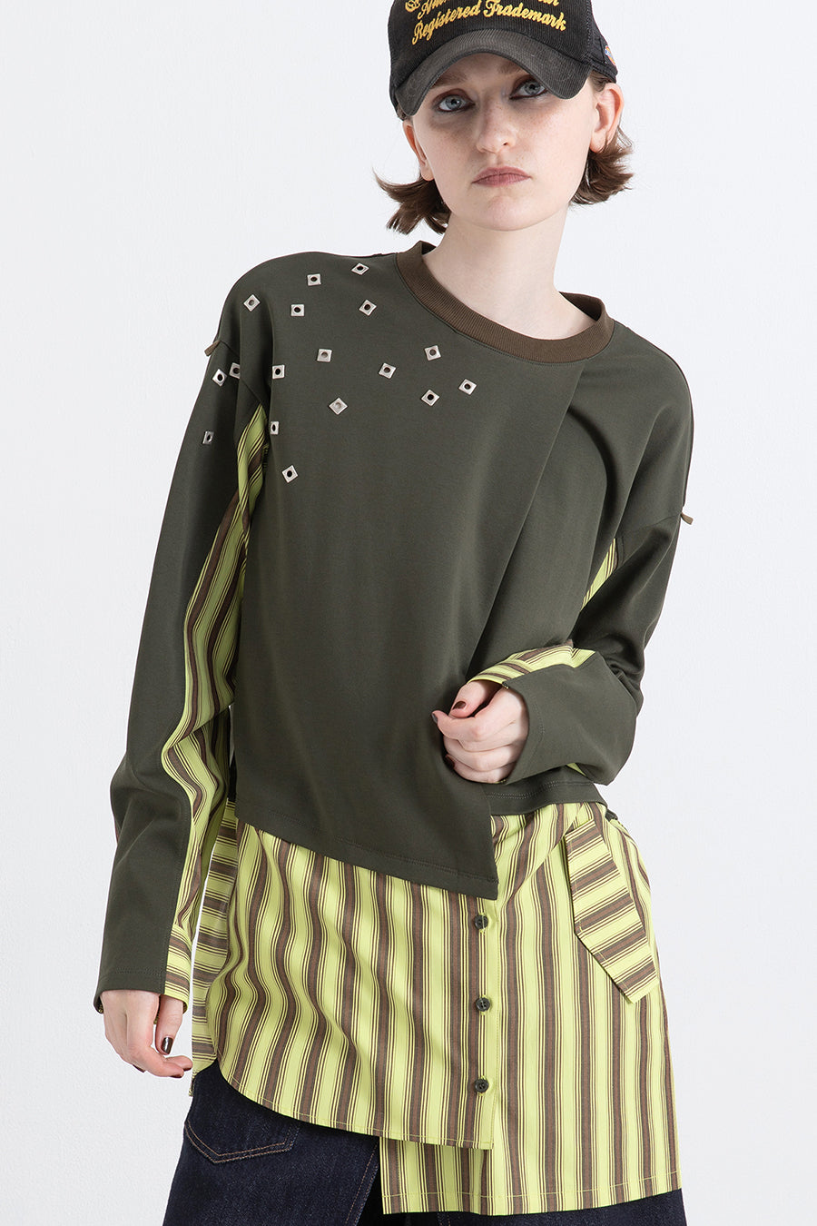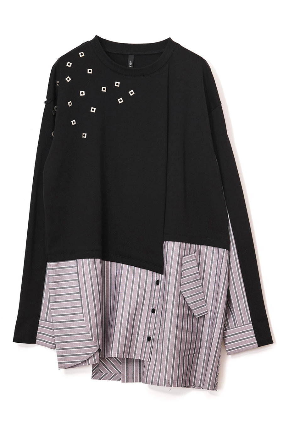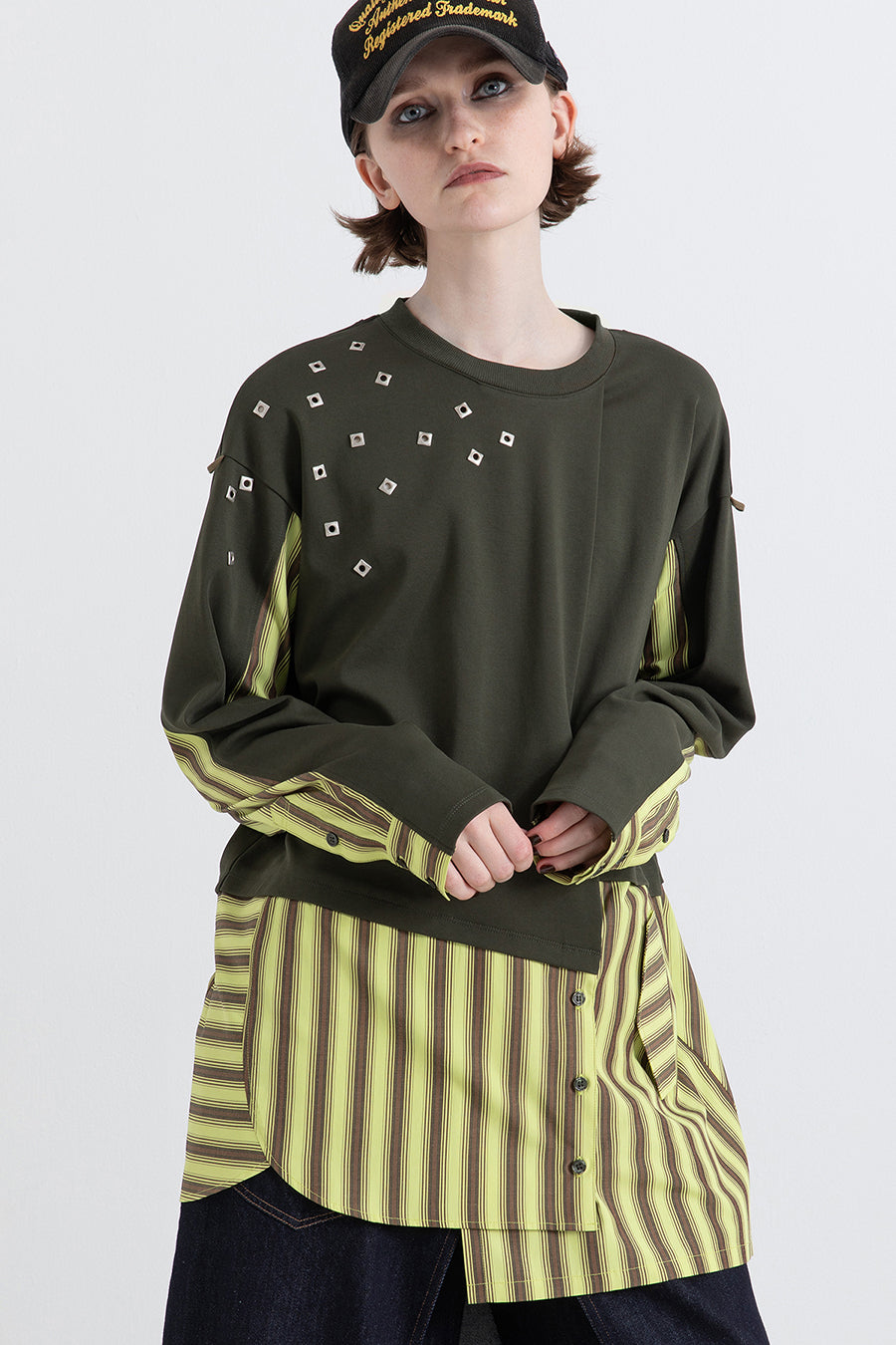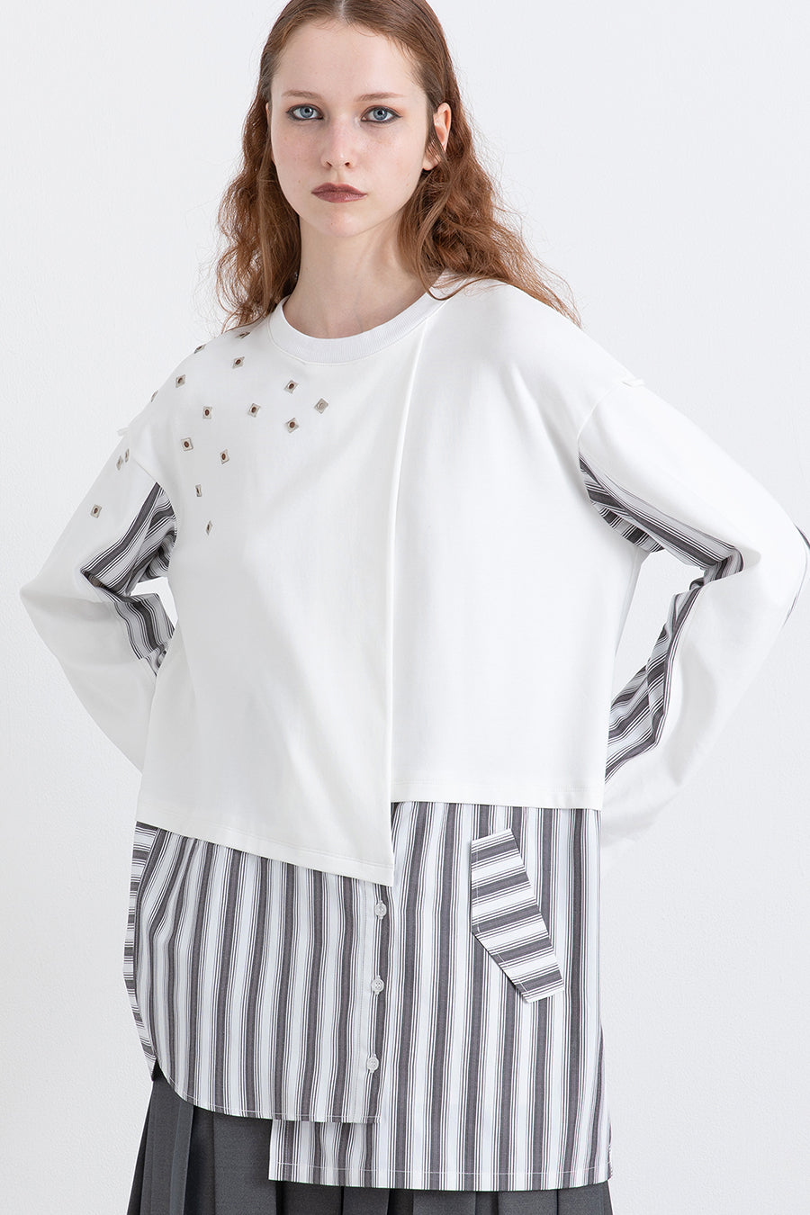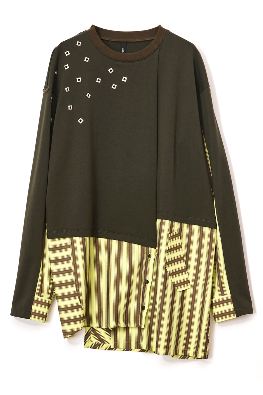 サラリとしたコットンスムースをべスースに、ストライプのシャツ生地を組み合わせたロングスリーブTシャツ。秋を感じられる温かみのあるストライプが目を引き、袖はロールアップタブが付いているので、多様な気温に対応できるのも嬉しいポイント。右肩周辺には、スクエア型のハトメをランダムにつけてアクセントに。ゆとりのあるサイジングでストレスフリーで着られ、抜け感のある印象にしあがるアイテム。裾のシャツボタンを開けると、よりAラインのシルエットも楽しめる。